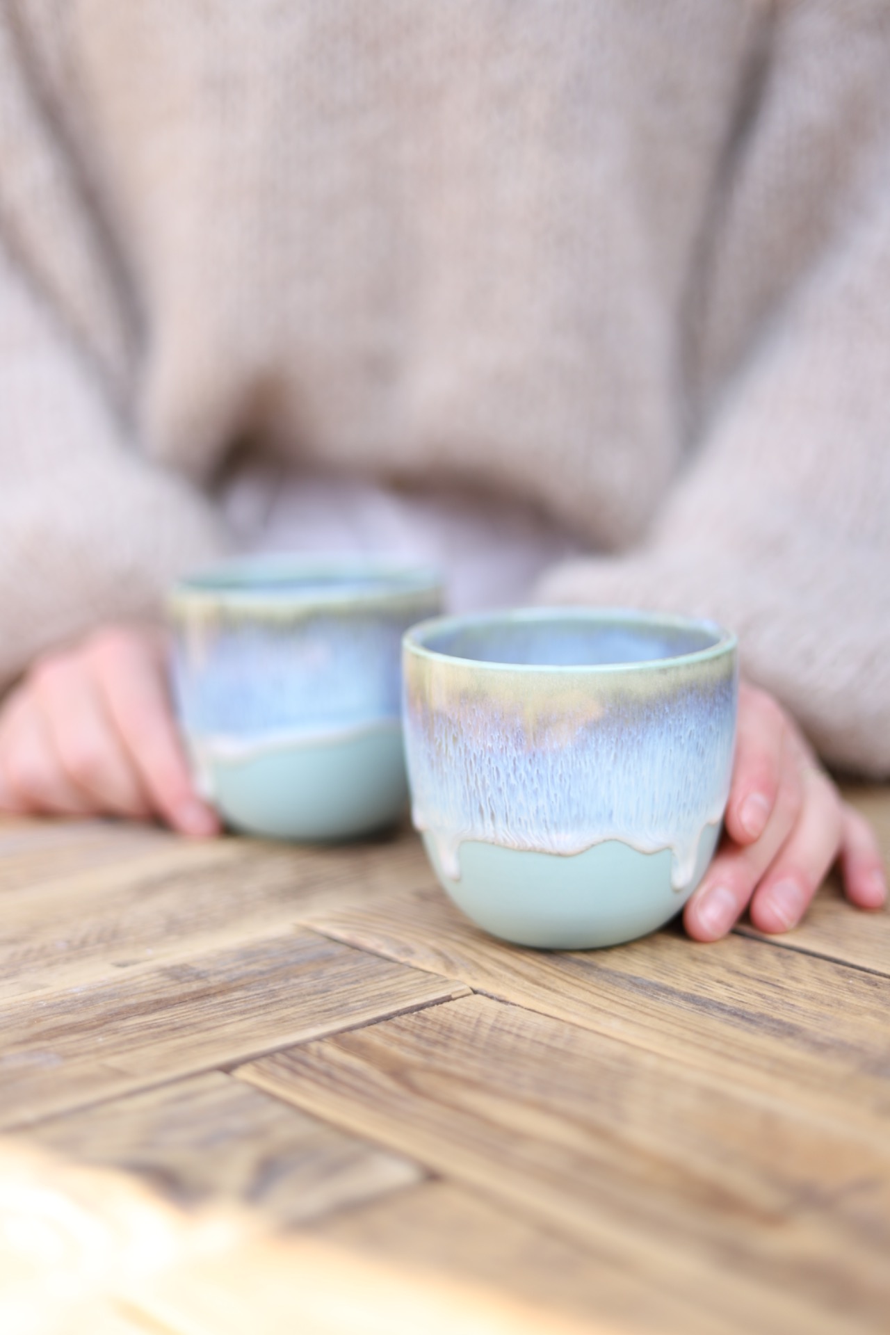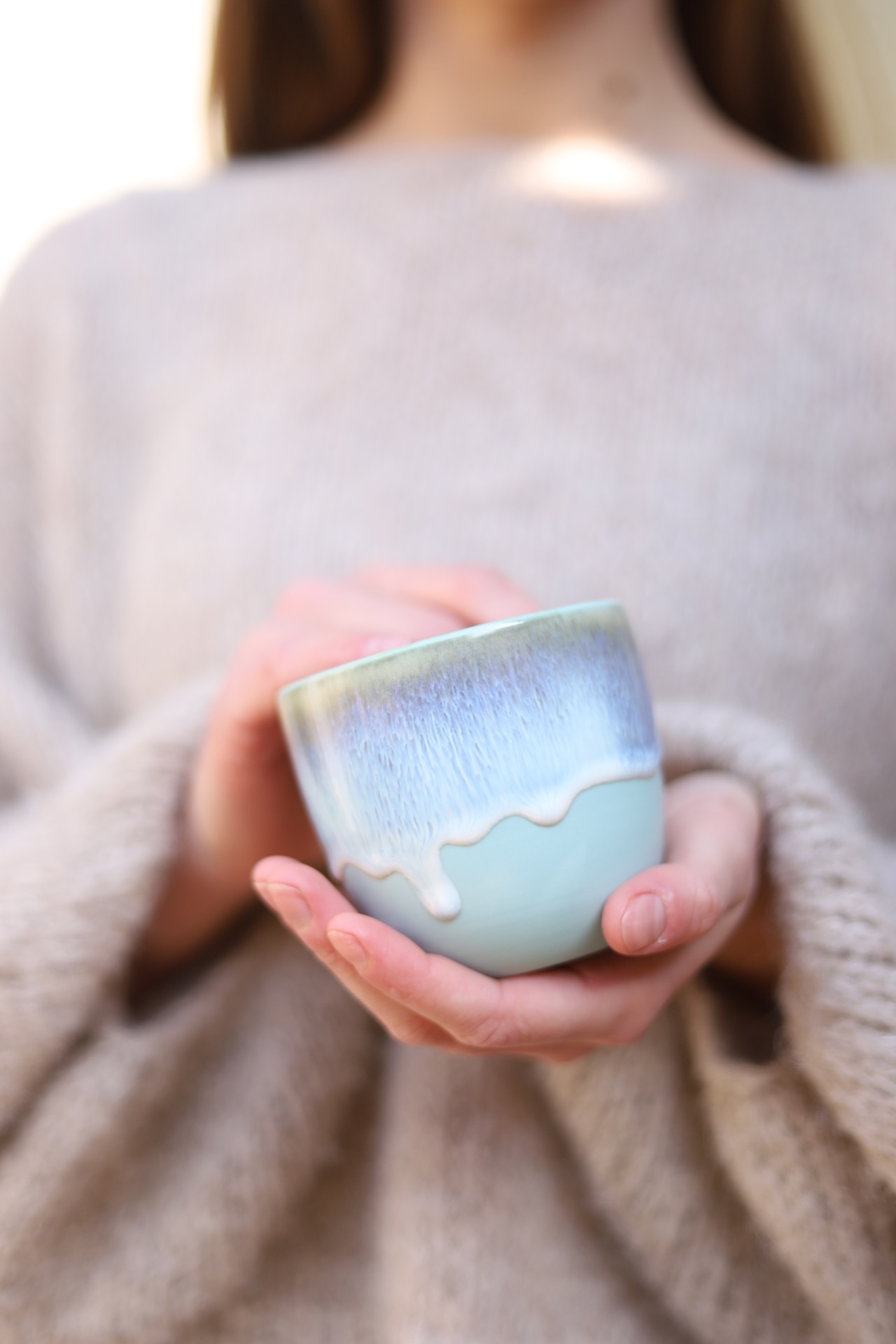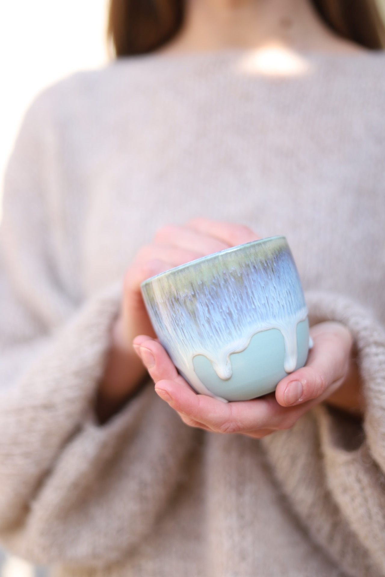 Kalíšek na kafe i čaj s objemem cca 250ml s bílo modrou roztékající se glazurou. Je vytočen z modrého porcelánu a vypálen na vysoké teploty.