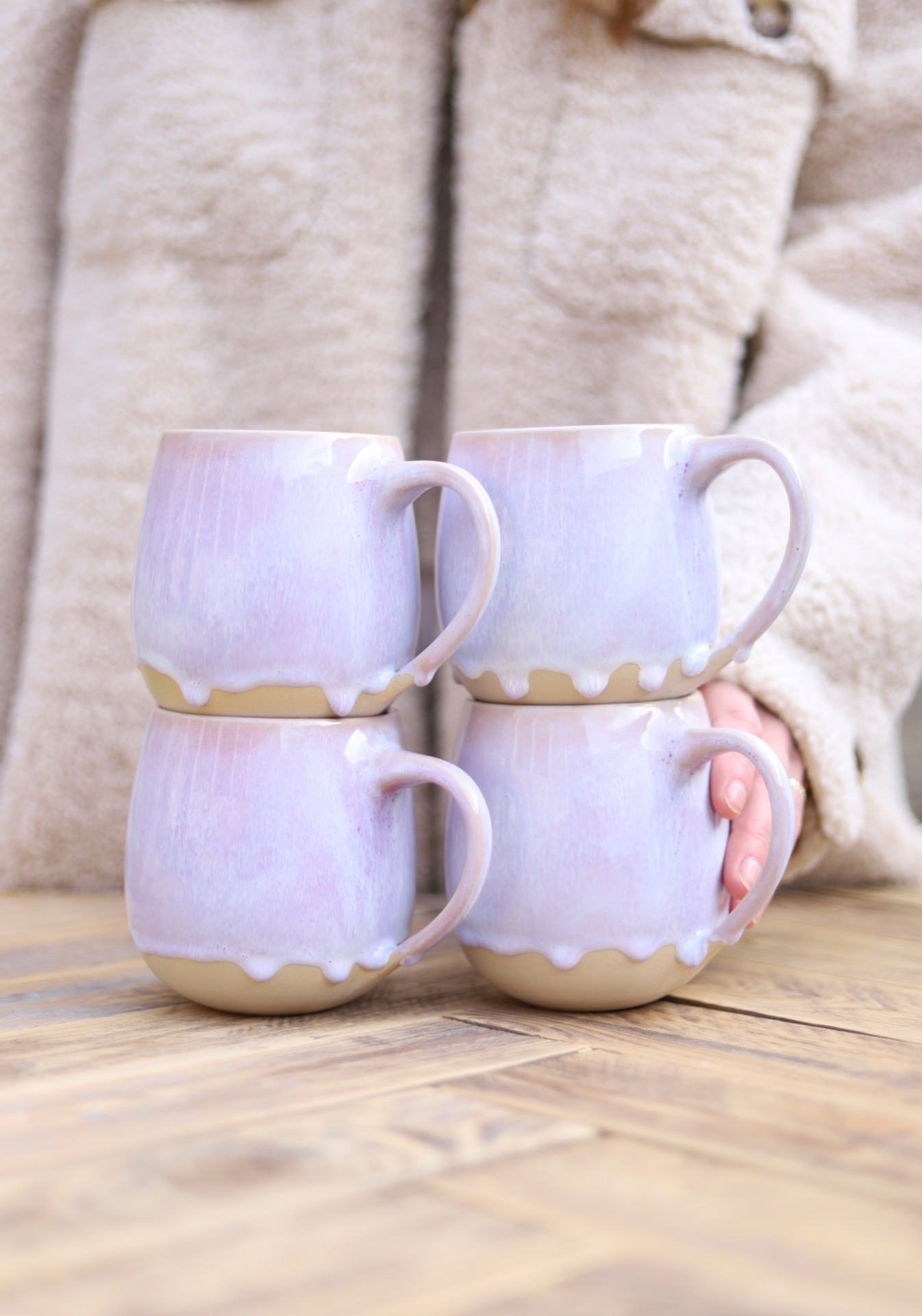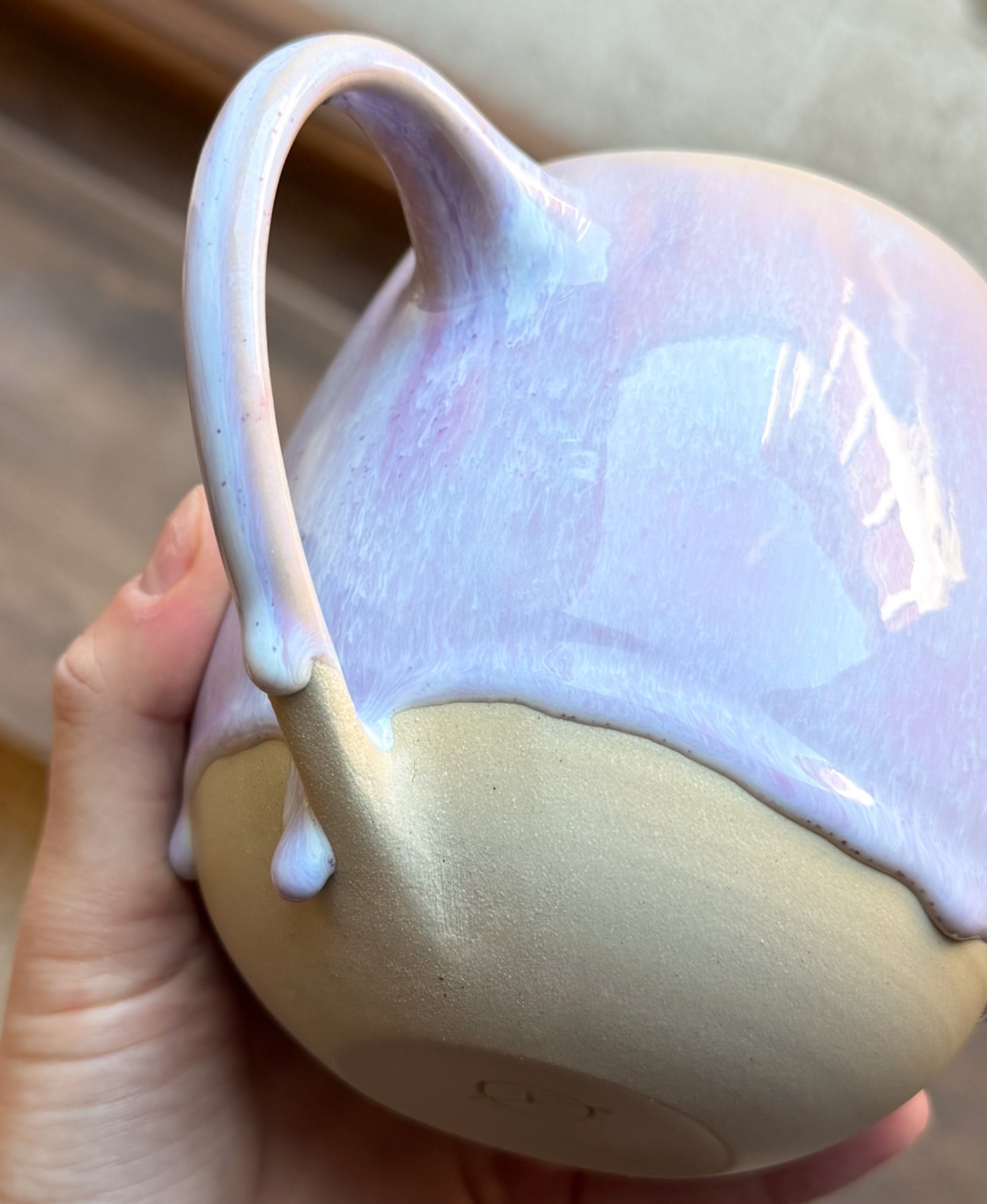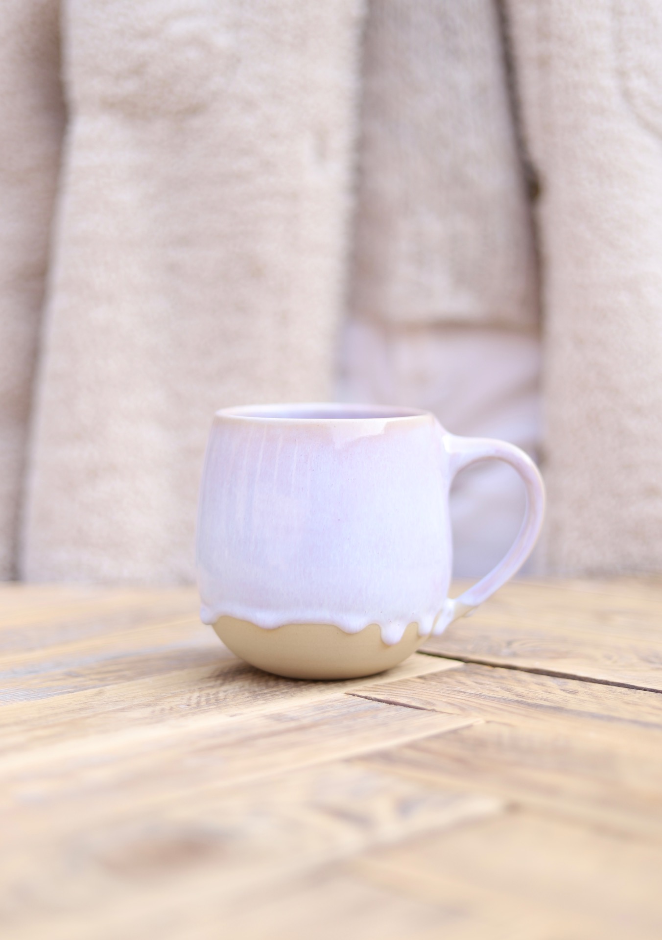 Hrnek s objemem cca 500ml se světle fialovou glazurou. Je vytočen z béžové kameniny a vypálena na vysoké teploty.