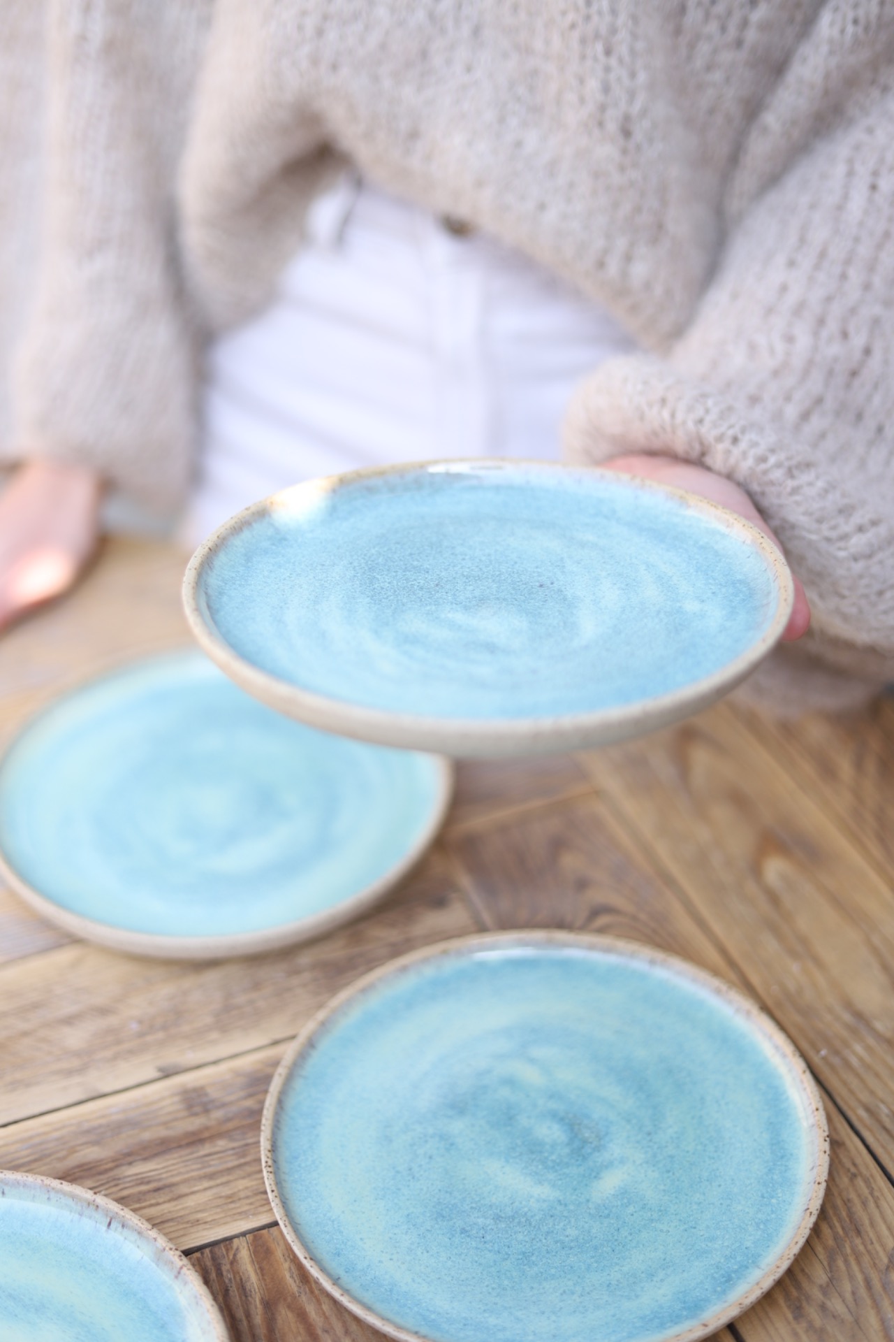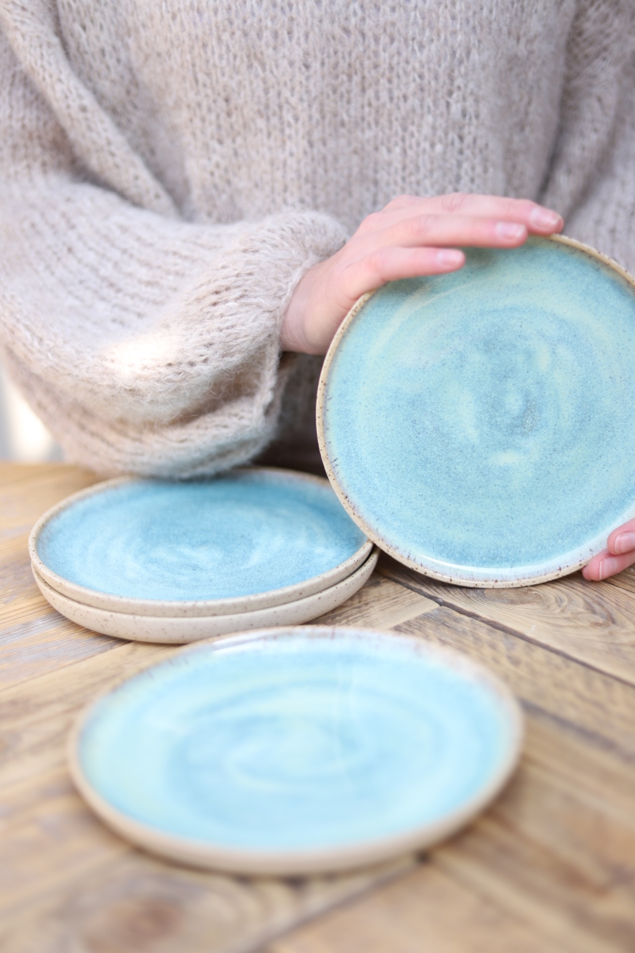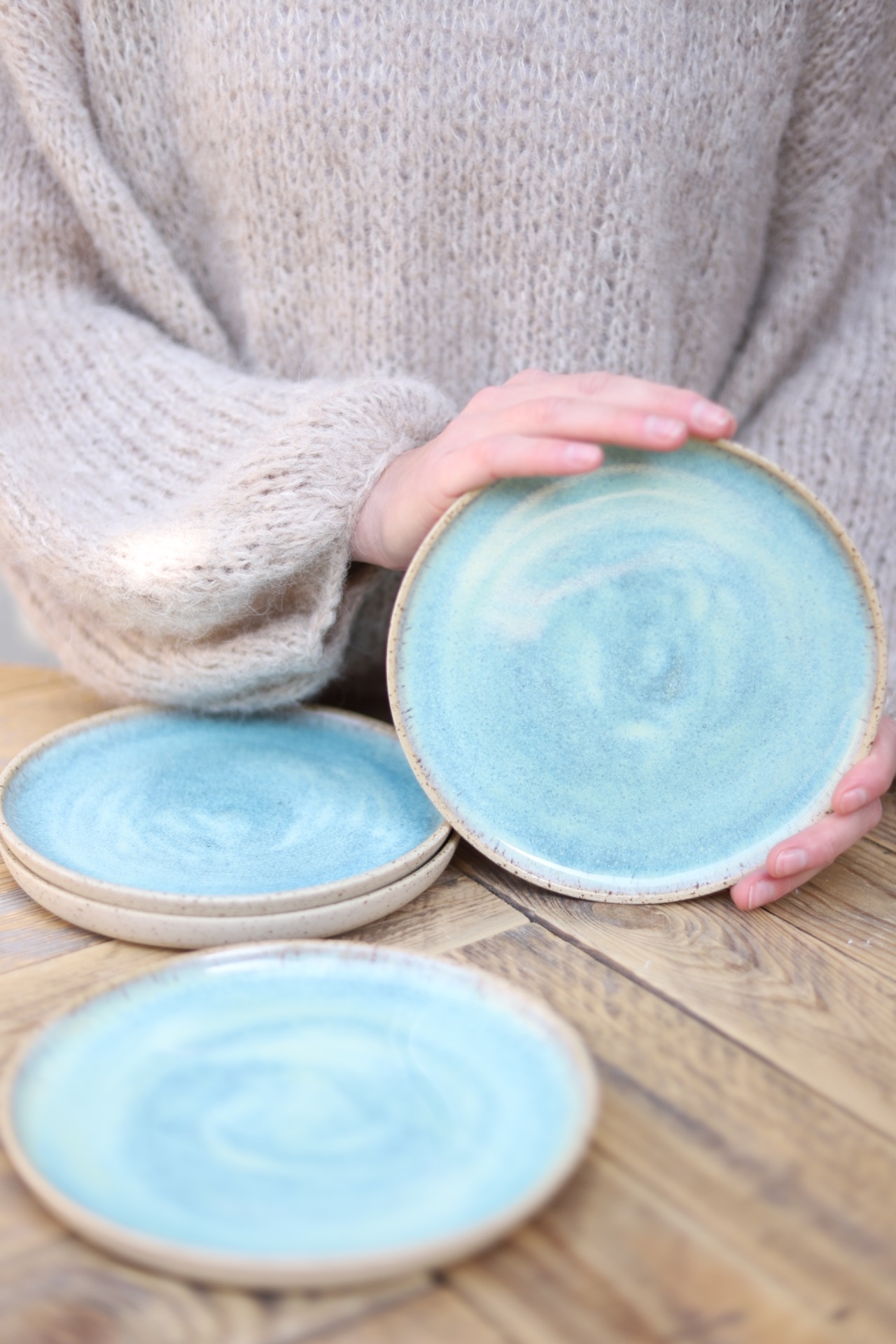 Dezertní talíř s průměrem cca 18cm se zeleno-modrou glazurou. Talíř je vytočen z tečkované kameniny a vypálen na vysoké teploty.