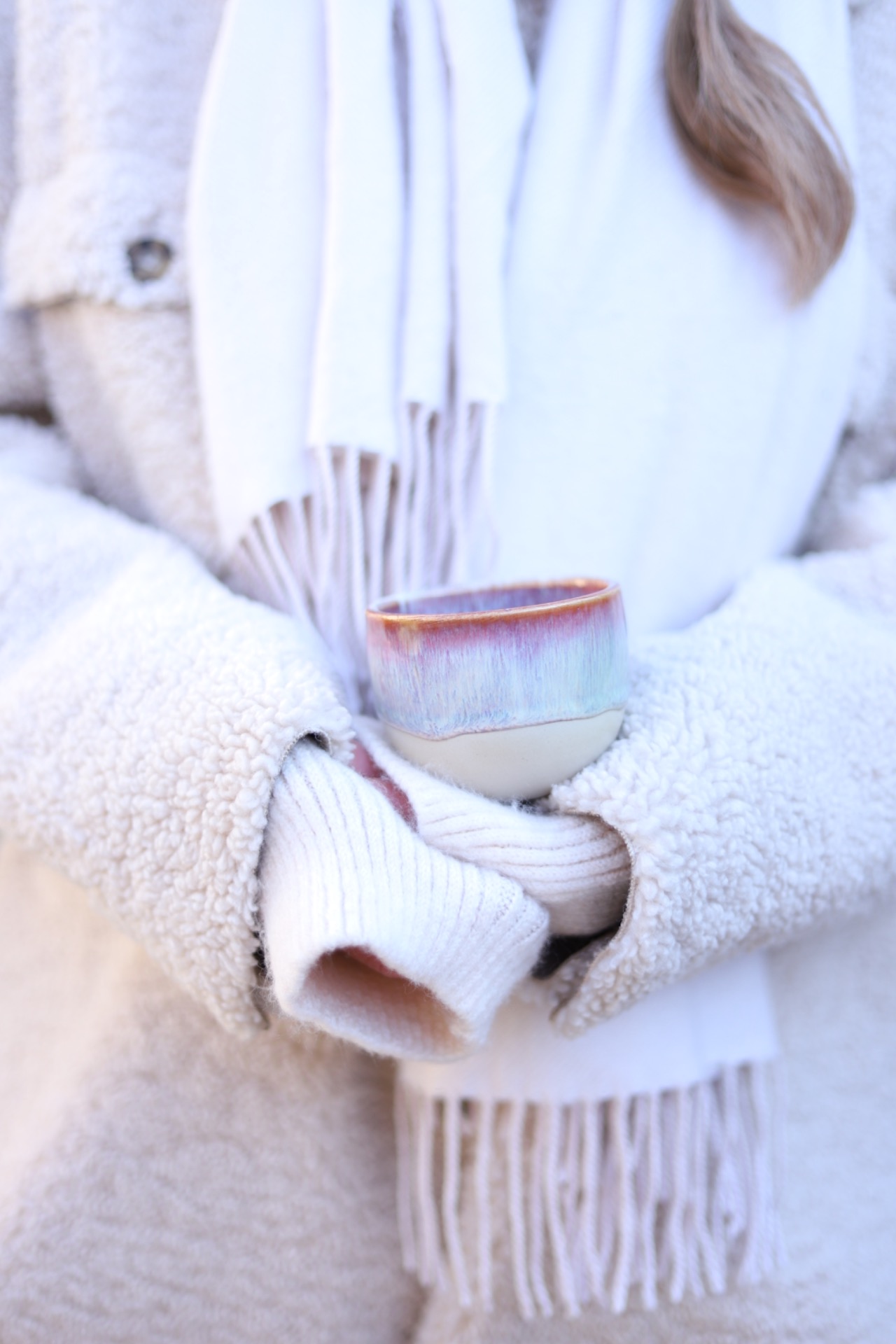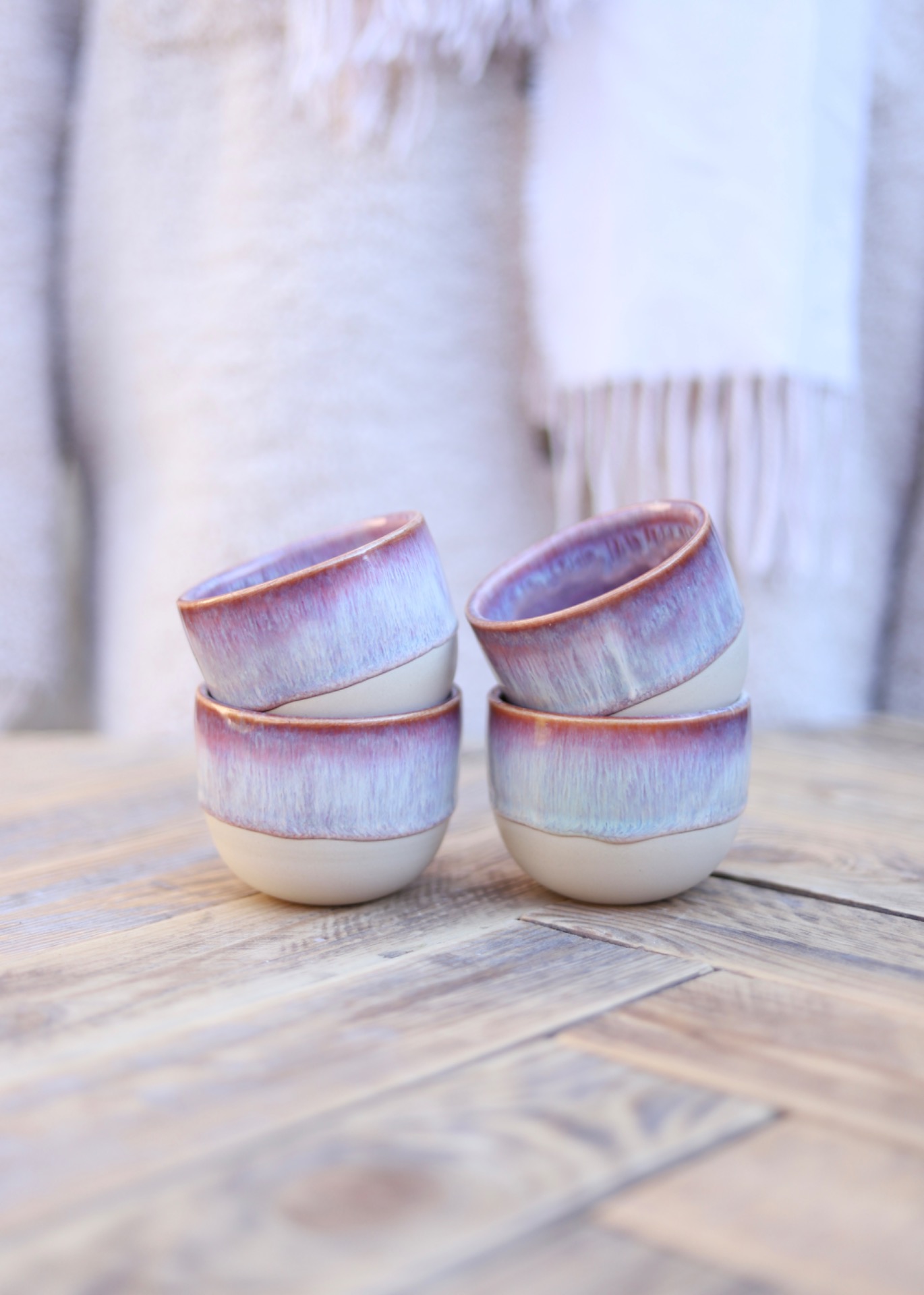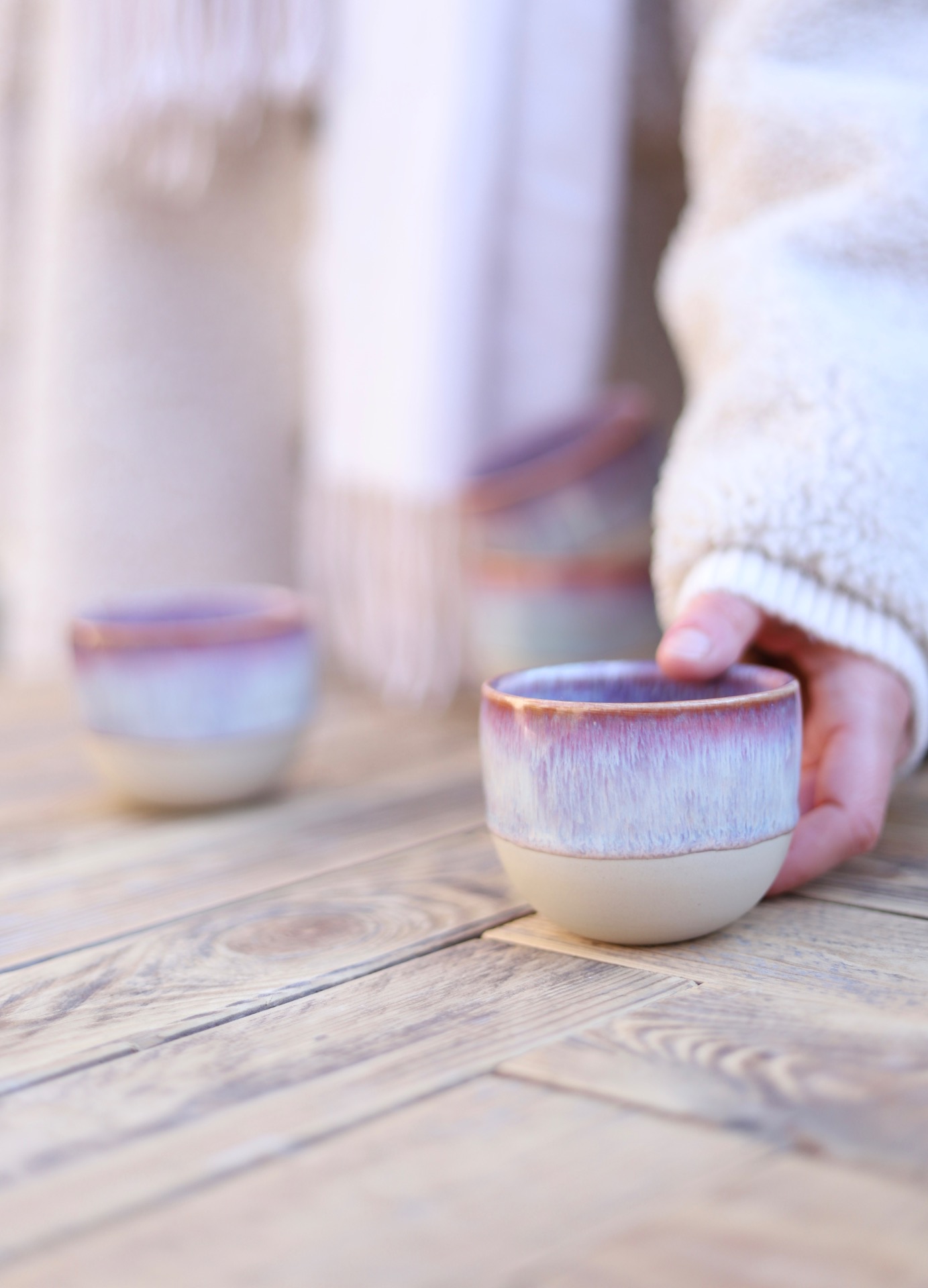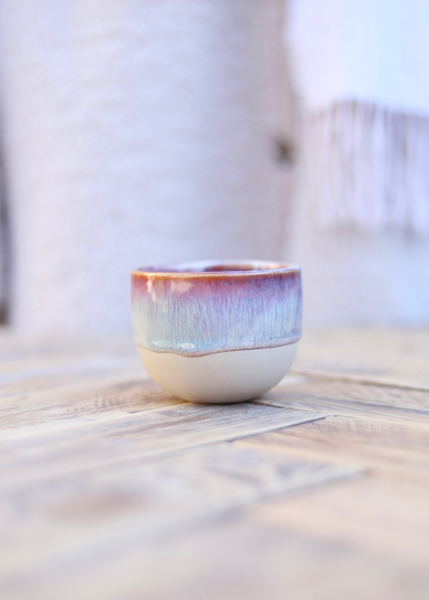 Kalíšek na kafe i čaj s objemem cca 160-180ml s efektní vínovo růžovou glazurou. Je vytočen z béžové kameniny a vypálen na vysoké teploty.
