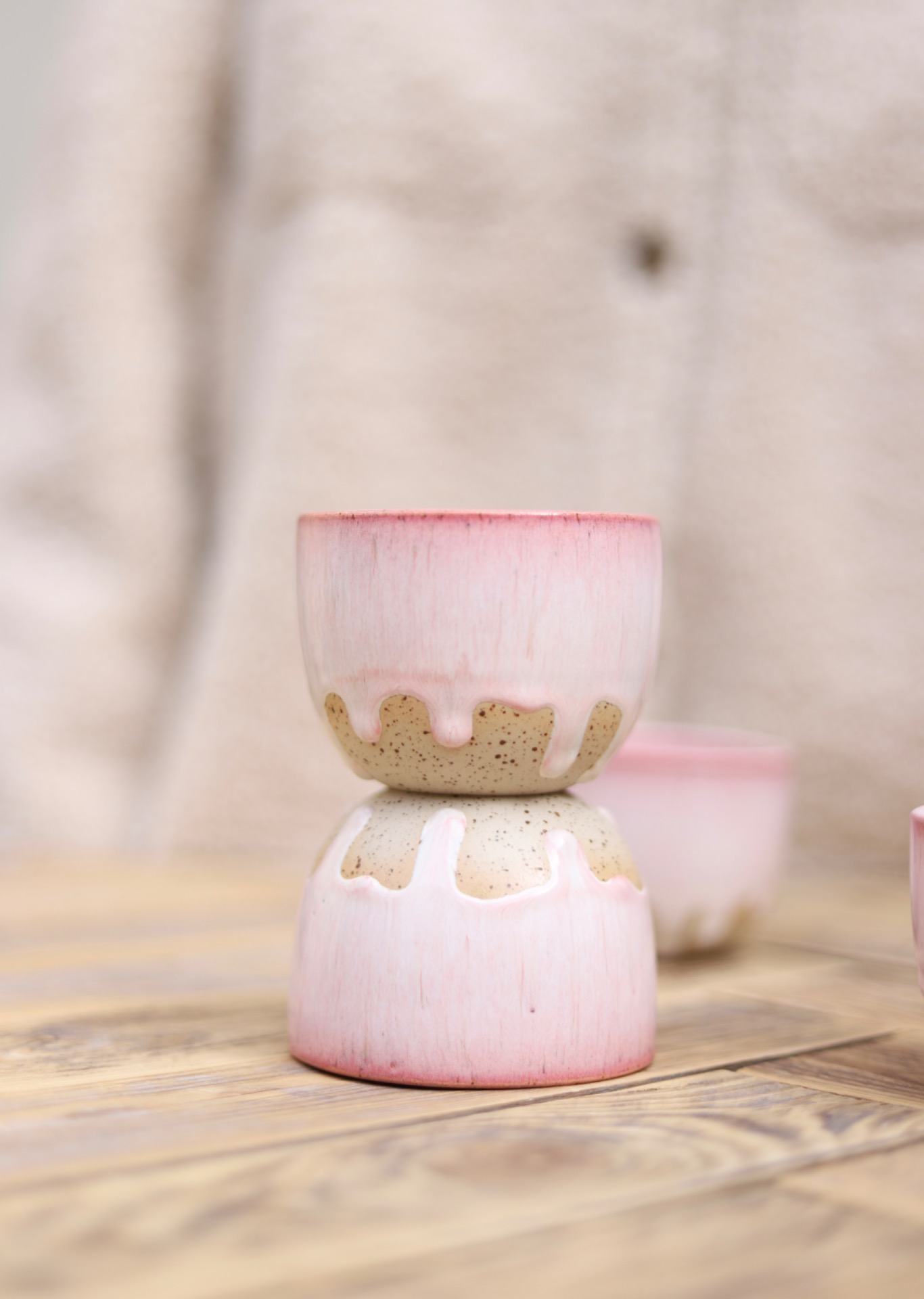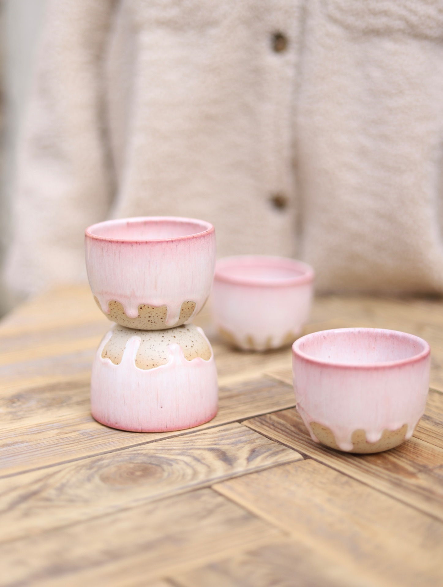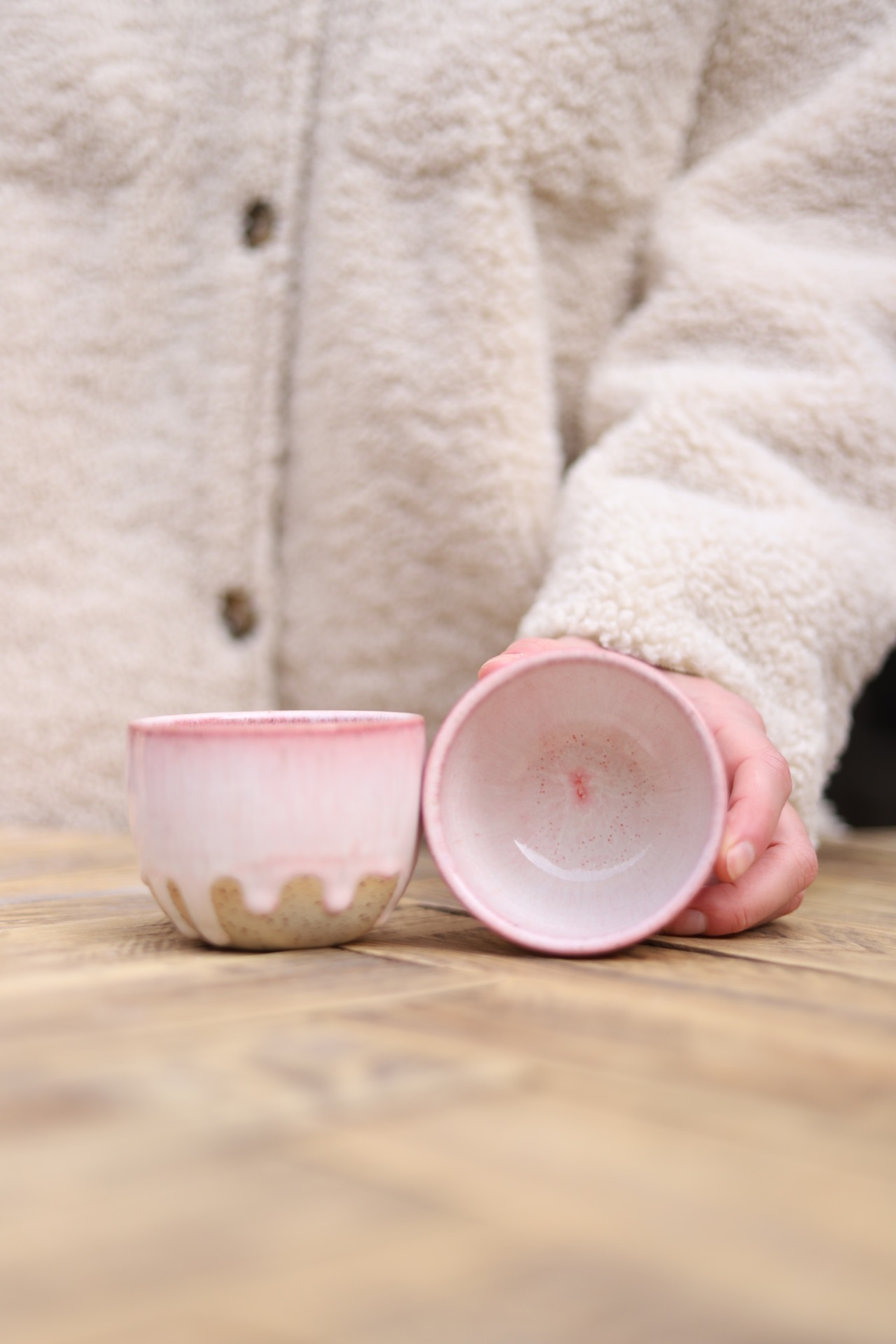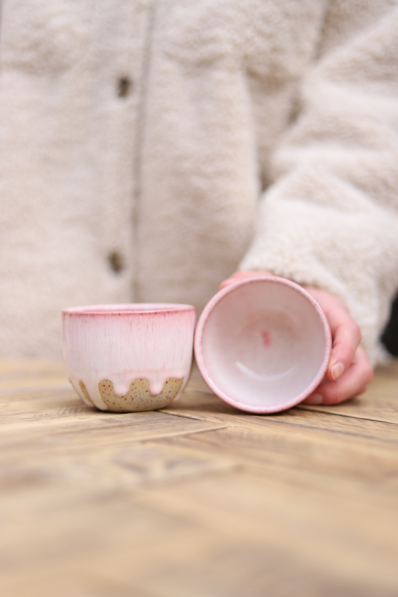 Kalíšek na kafe i čaj s objemem cca 180-200ml s krémově růžovou glazurou. Je vytočen z tečkované kameniny a vypálen na vysoké teploty.