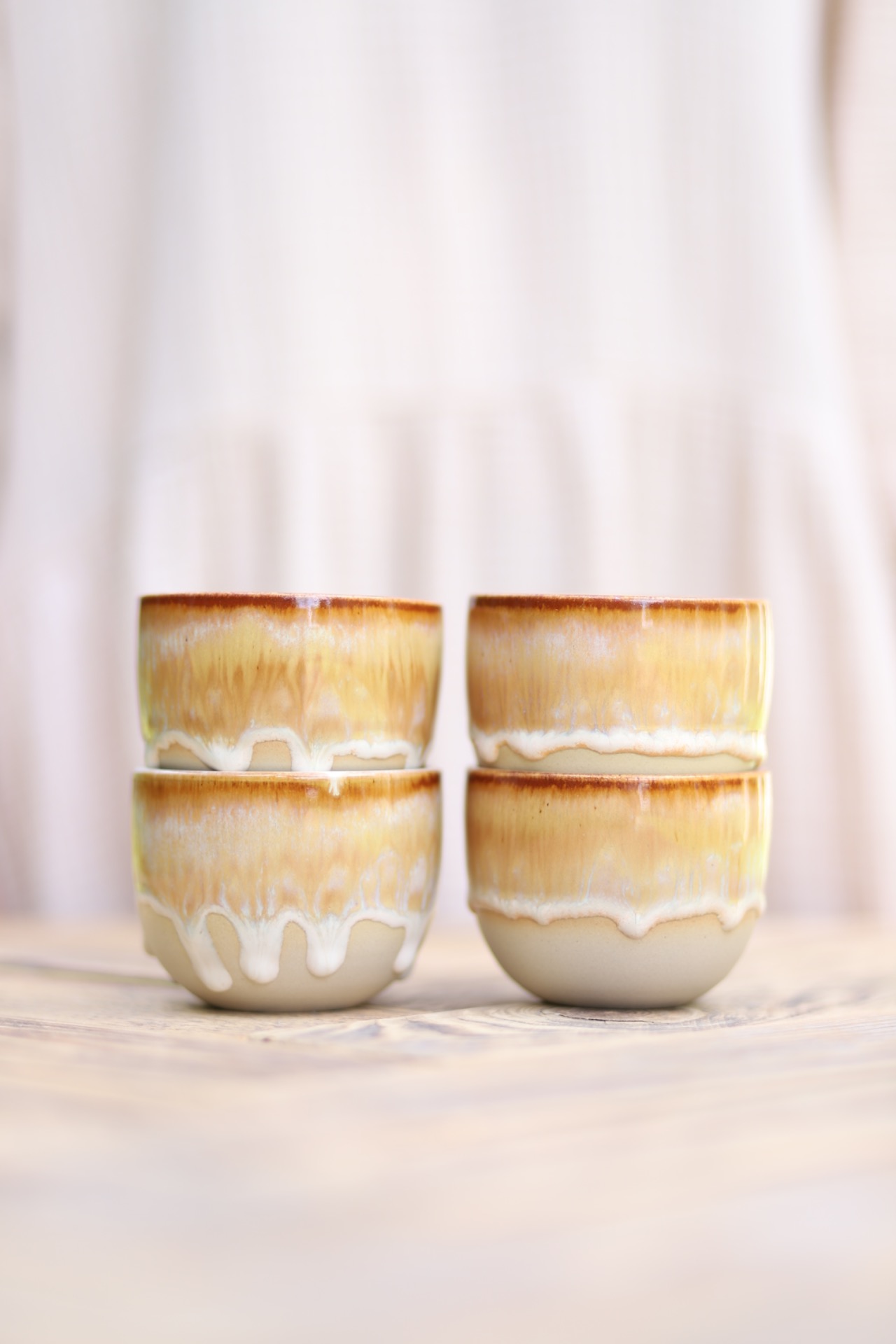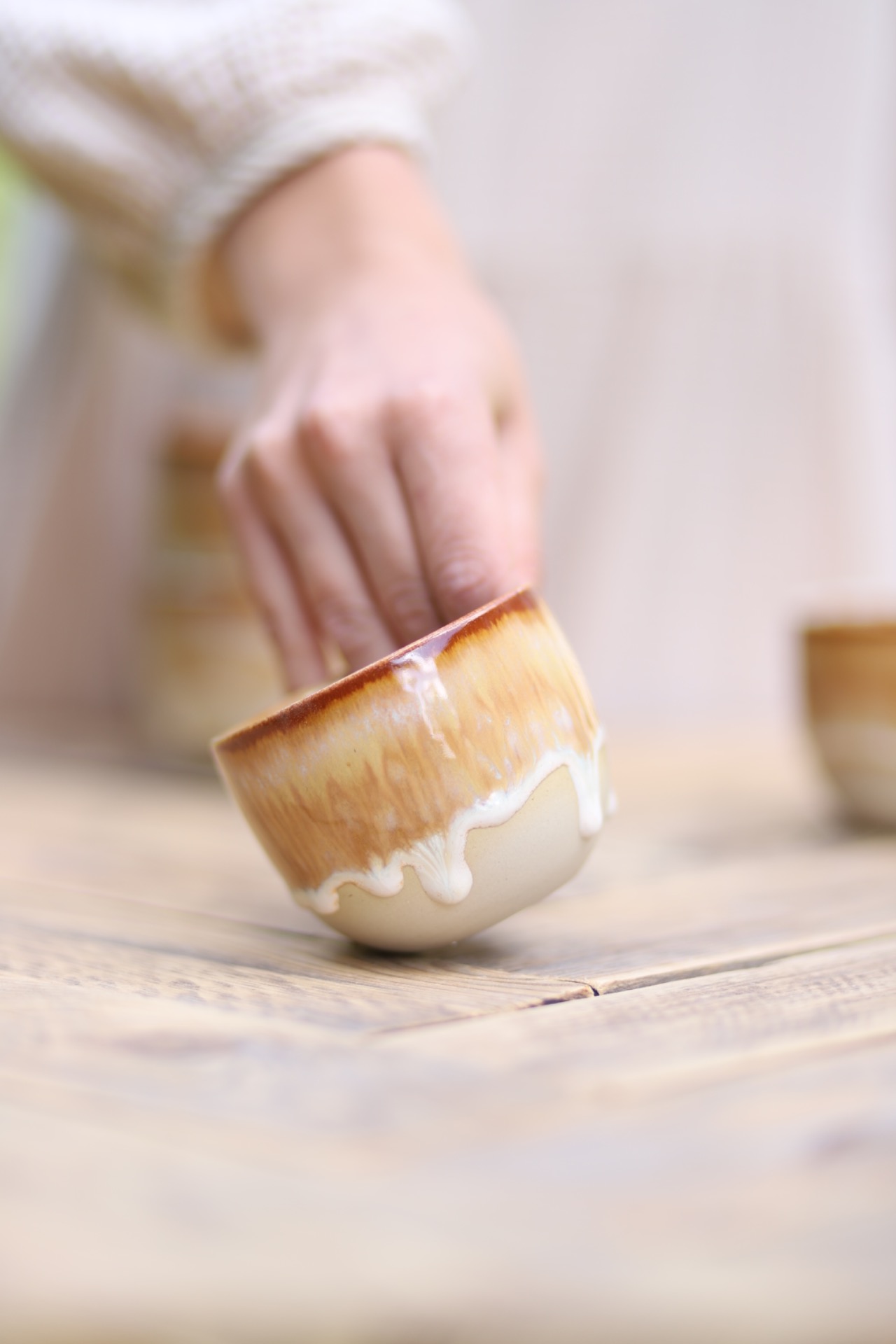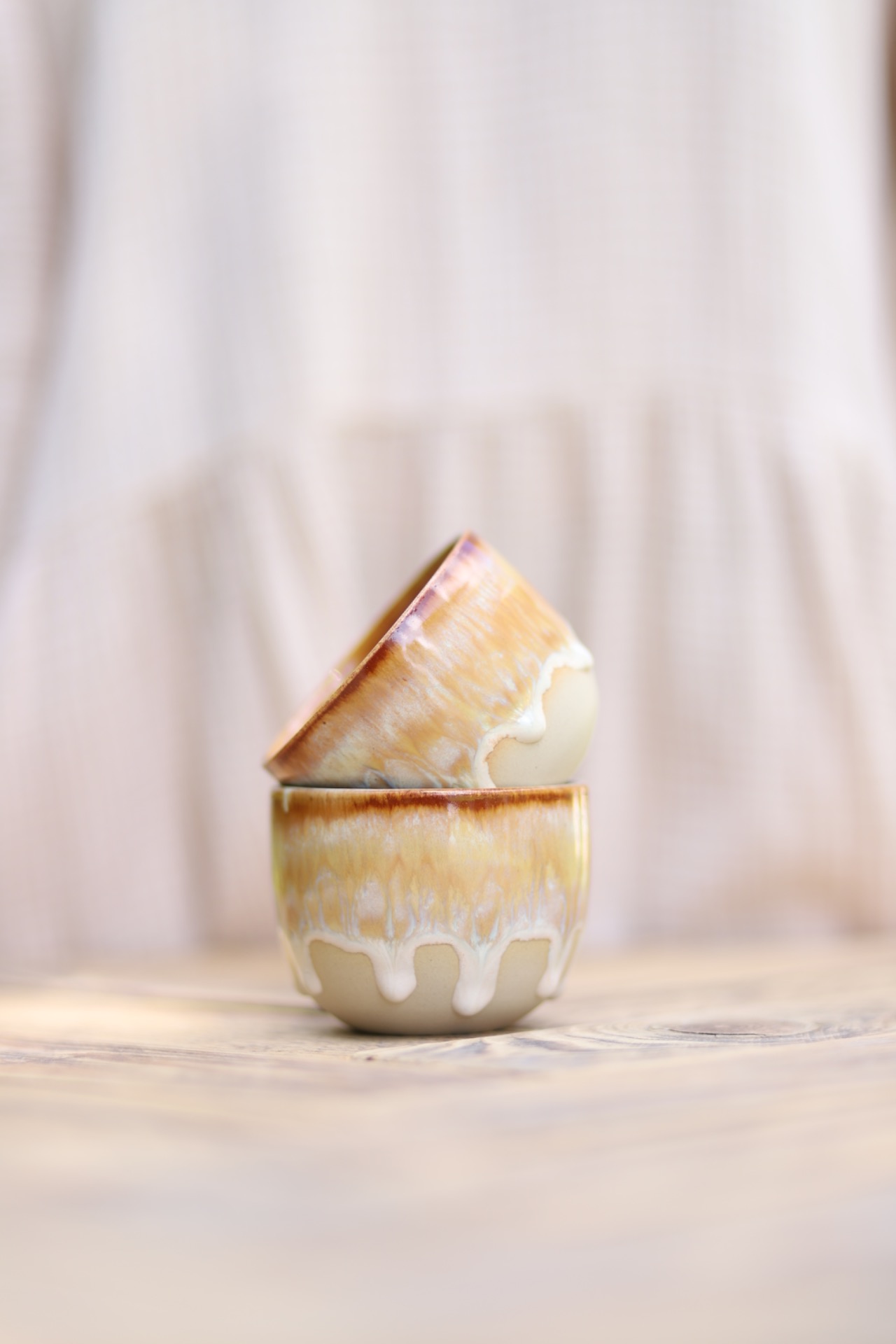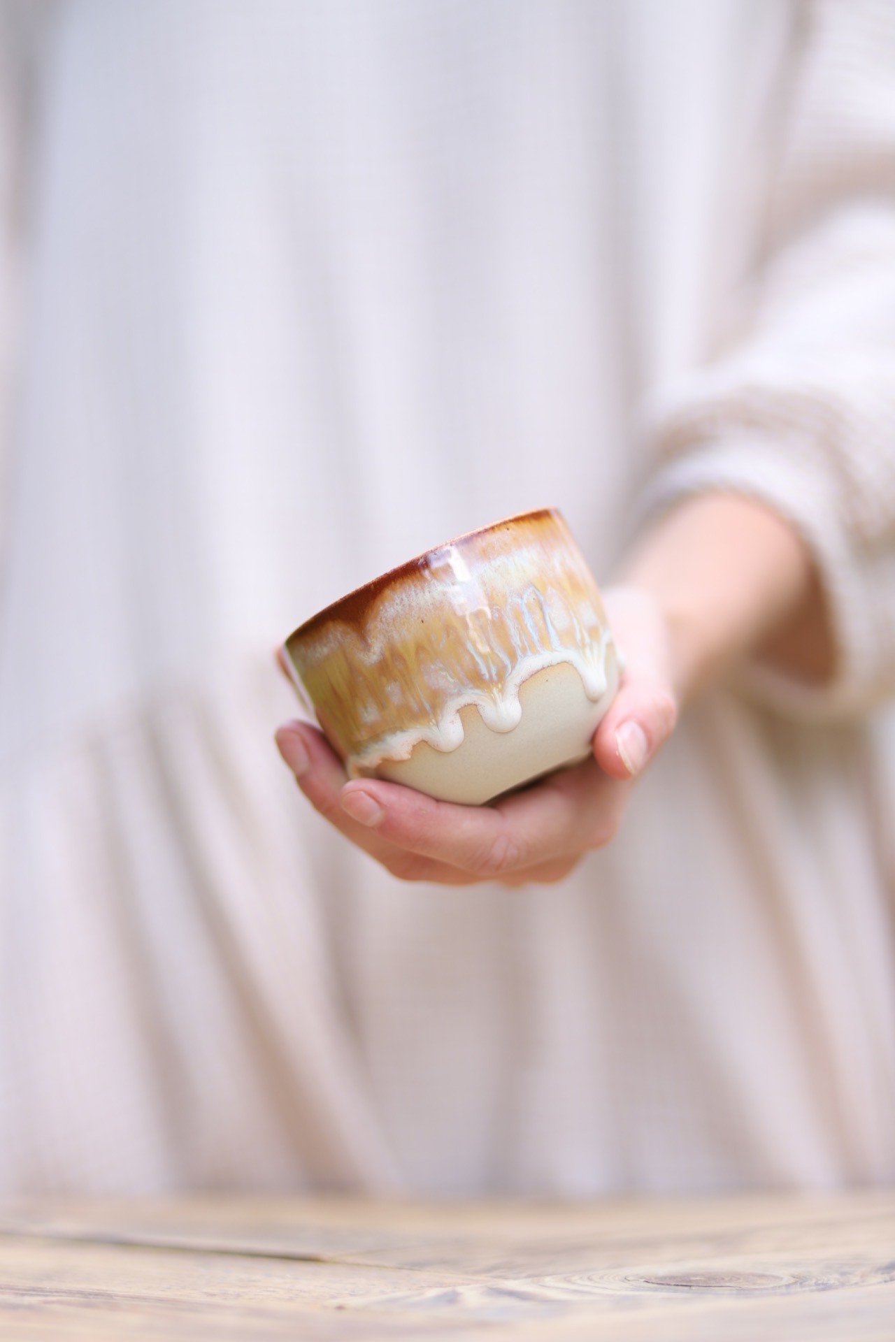 Kalíšek na kafe i čaj s objemem cca 160-180ml s karamelovou glazurou. Je vytočen z béžové kameniny a vypálen na vysoké teploty.