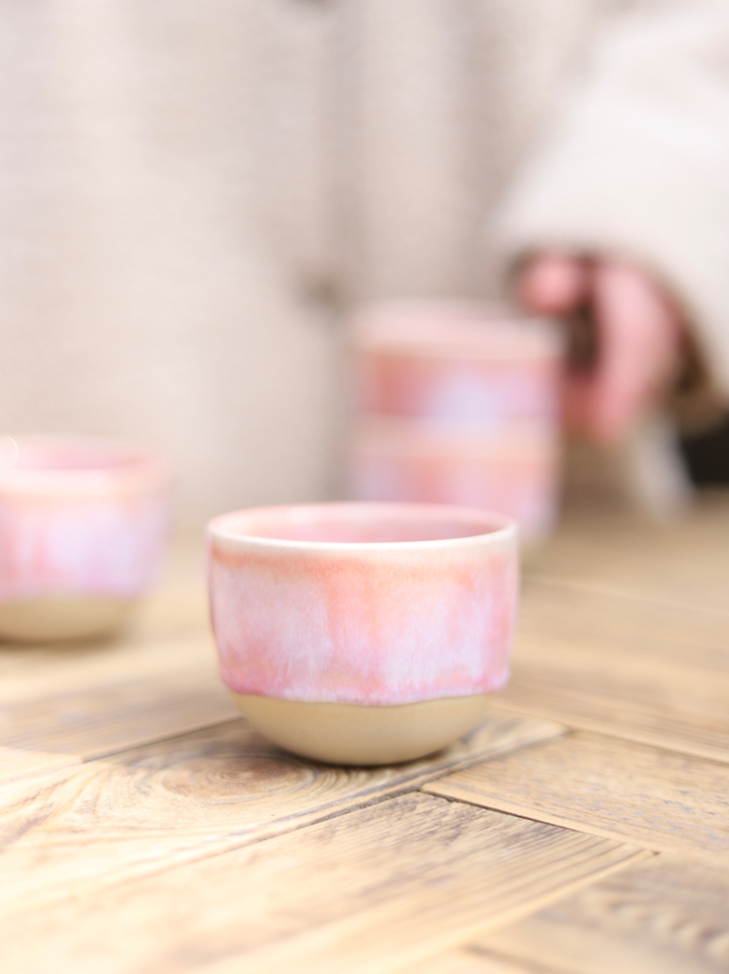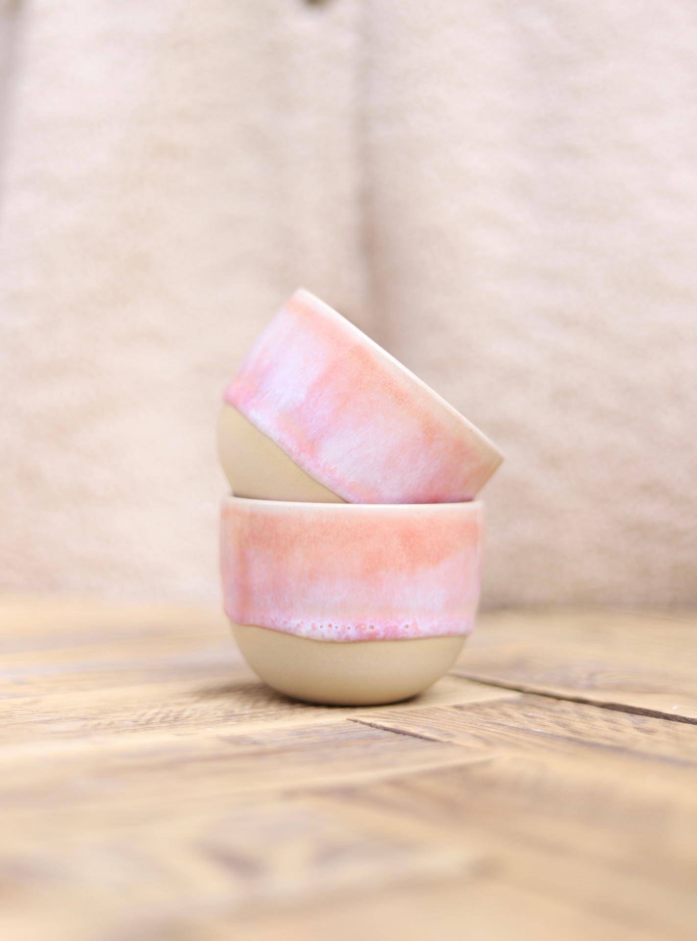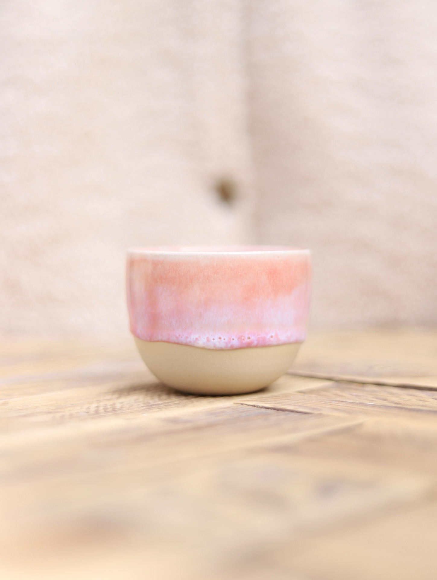 Kalíšek na kafe i čaj s objemem cca 180ml s růžovou glazurou. Je vytočen z béžové kameniny a vypálen na vysoké teploty.