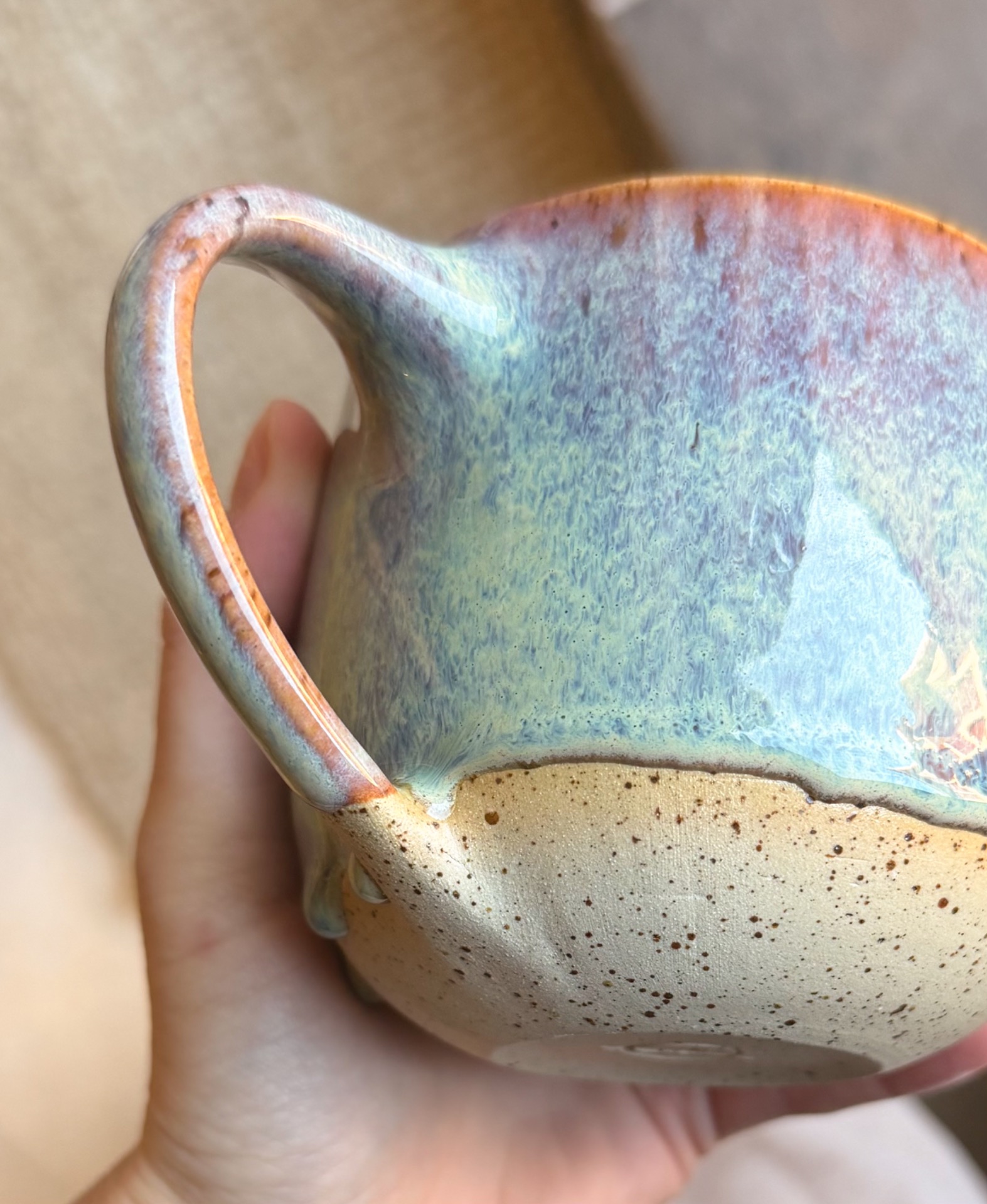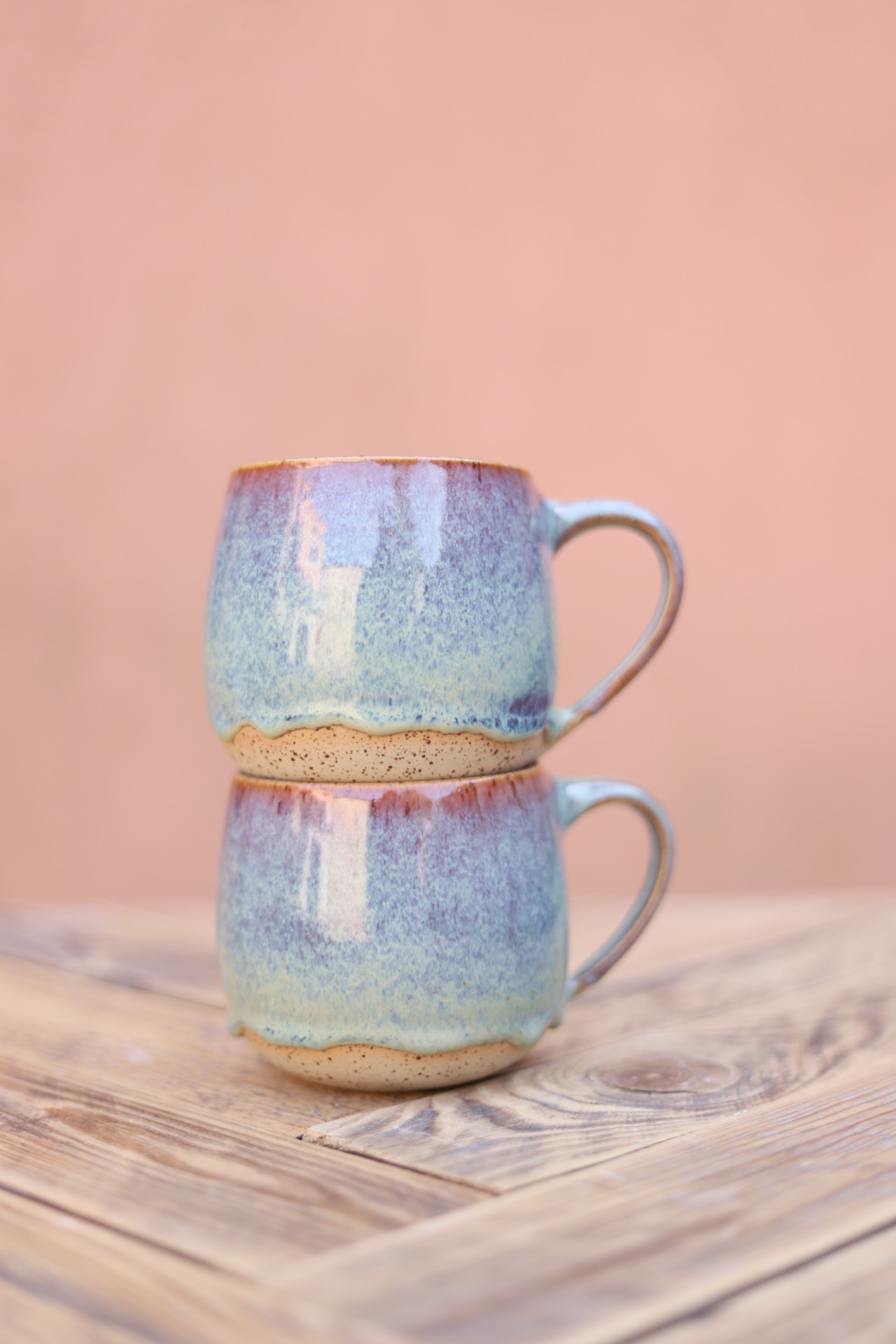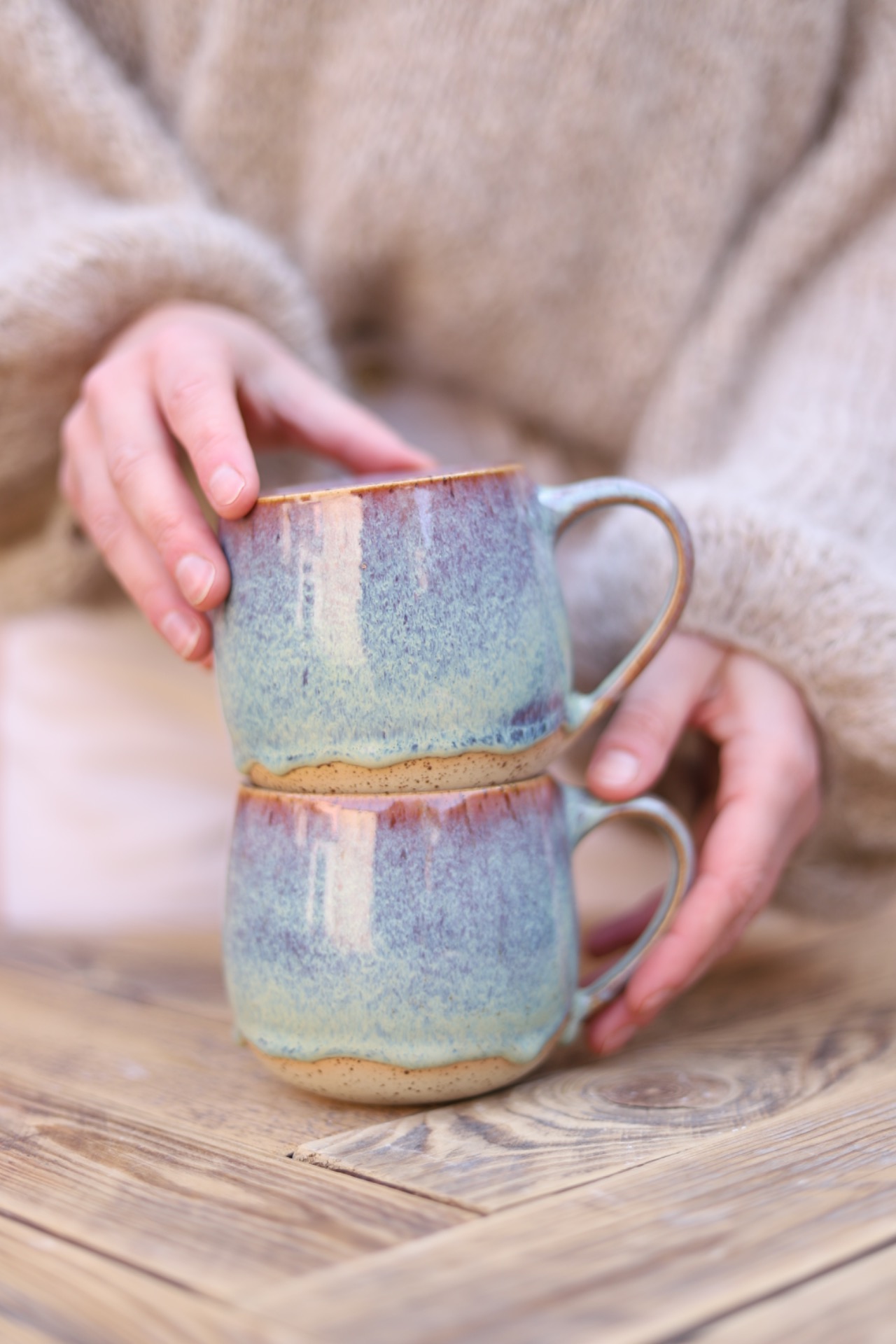 Hrnek s objemem cca 350-370ml s efektní růžovo-zelenou glazurou. Hrnek je vytočen z tečkované kameniny a vypálen na vysoké teploty.