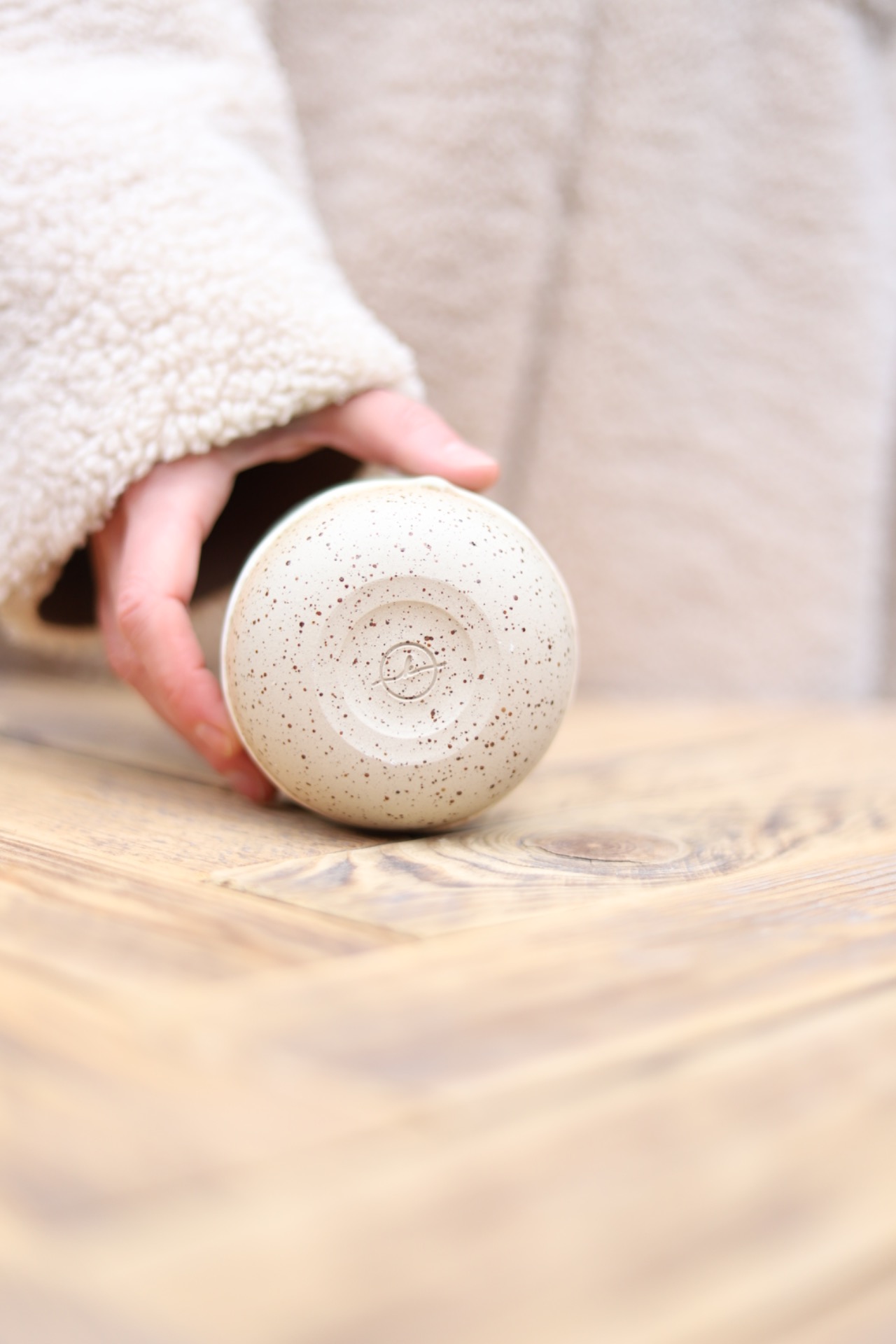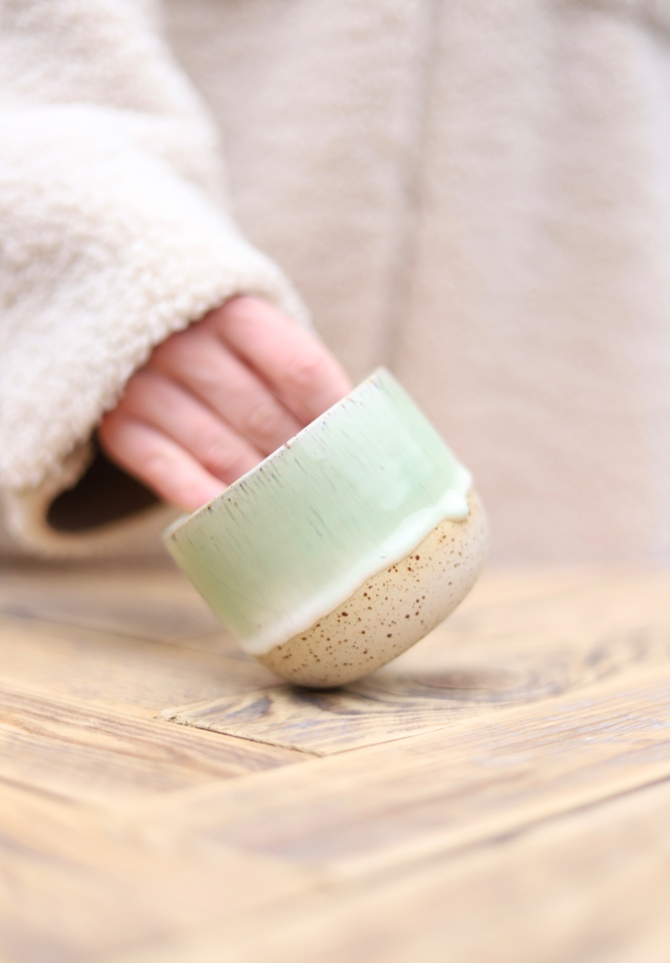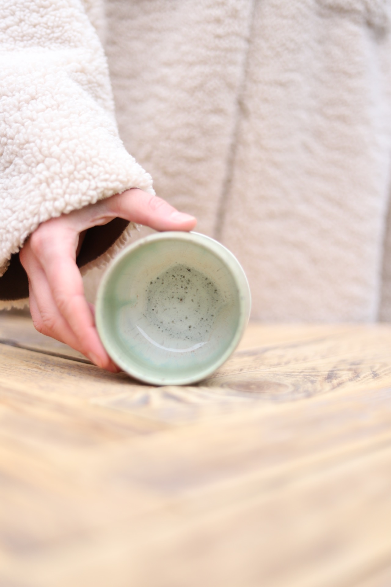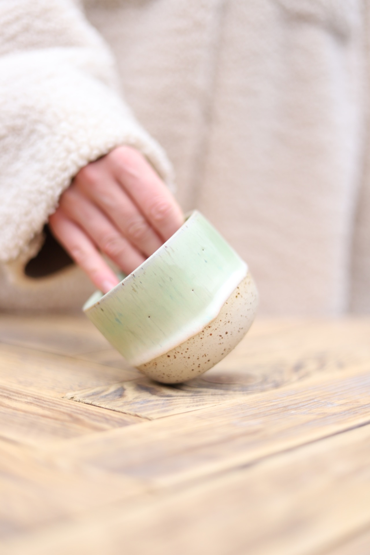 Kalíšek na kafe i čaj s objemem cca 260ml se zeleno-bílou glazurou. Kalíšek je vytočen z tečkované kameniny a vypálen na vysoké teploty.