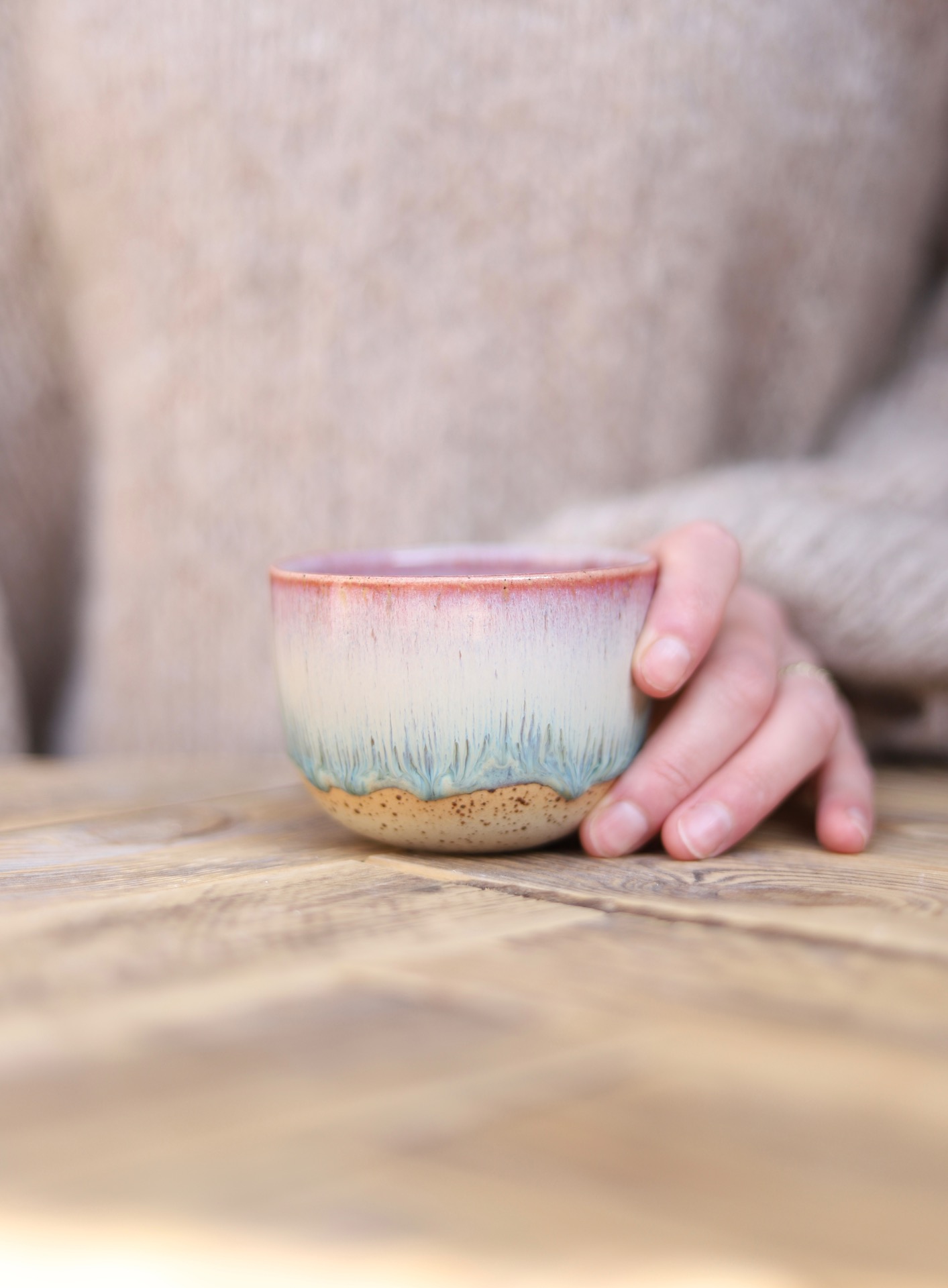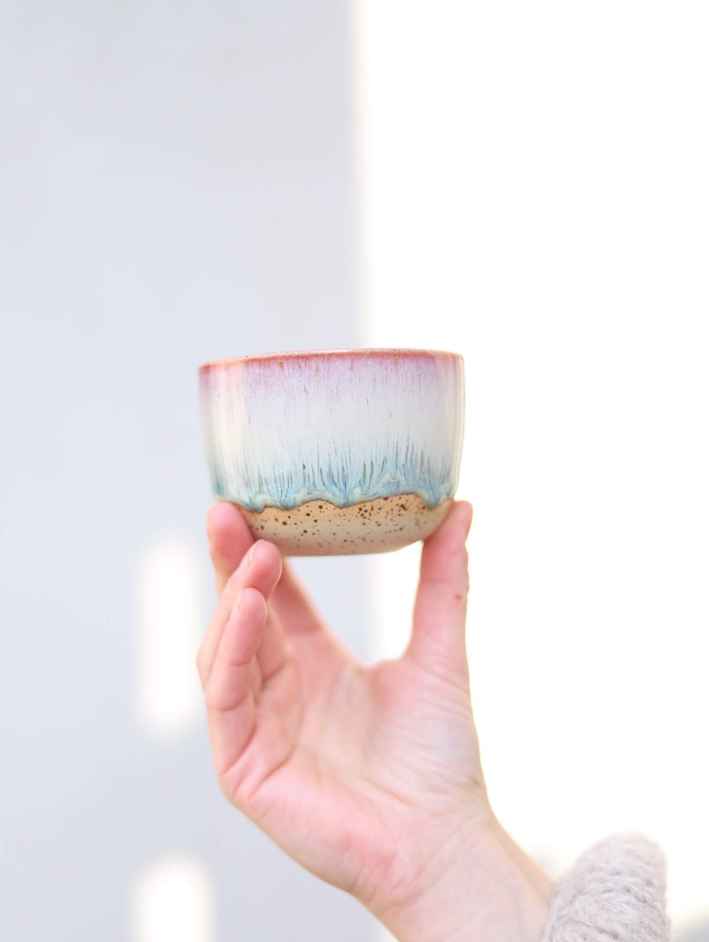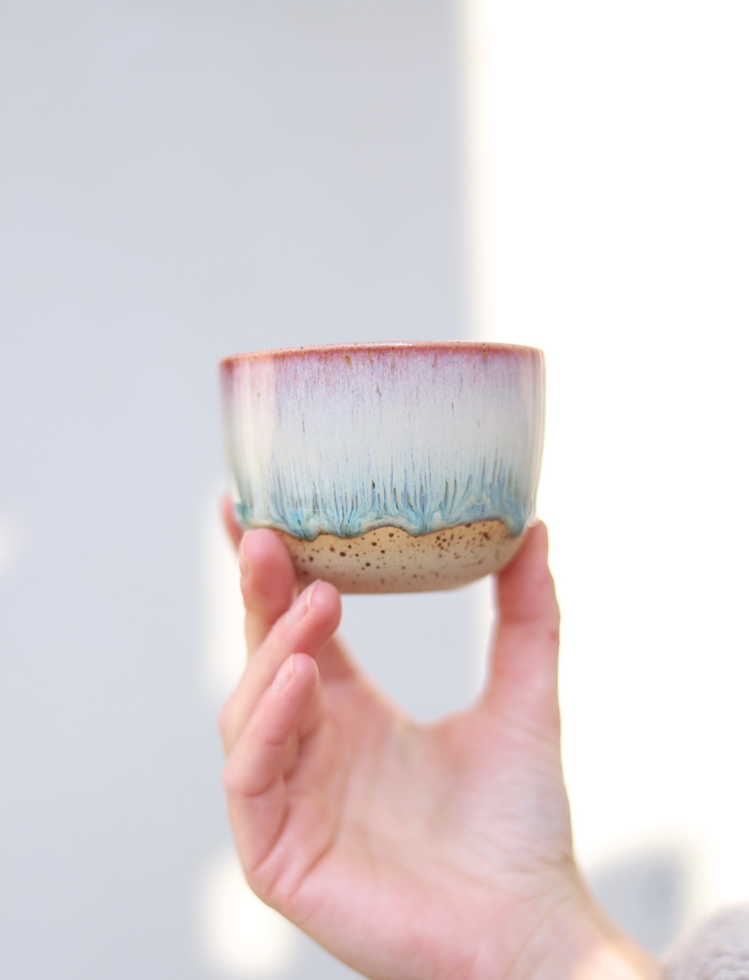 Kalíšek na kafe i čaj s objemem cca 180ml s barevnou efektní glazurou. Kalíšek je vytočen z tečkované kameniny a vypálen na vysoké teploty.