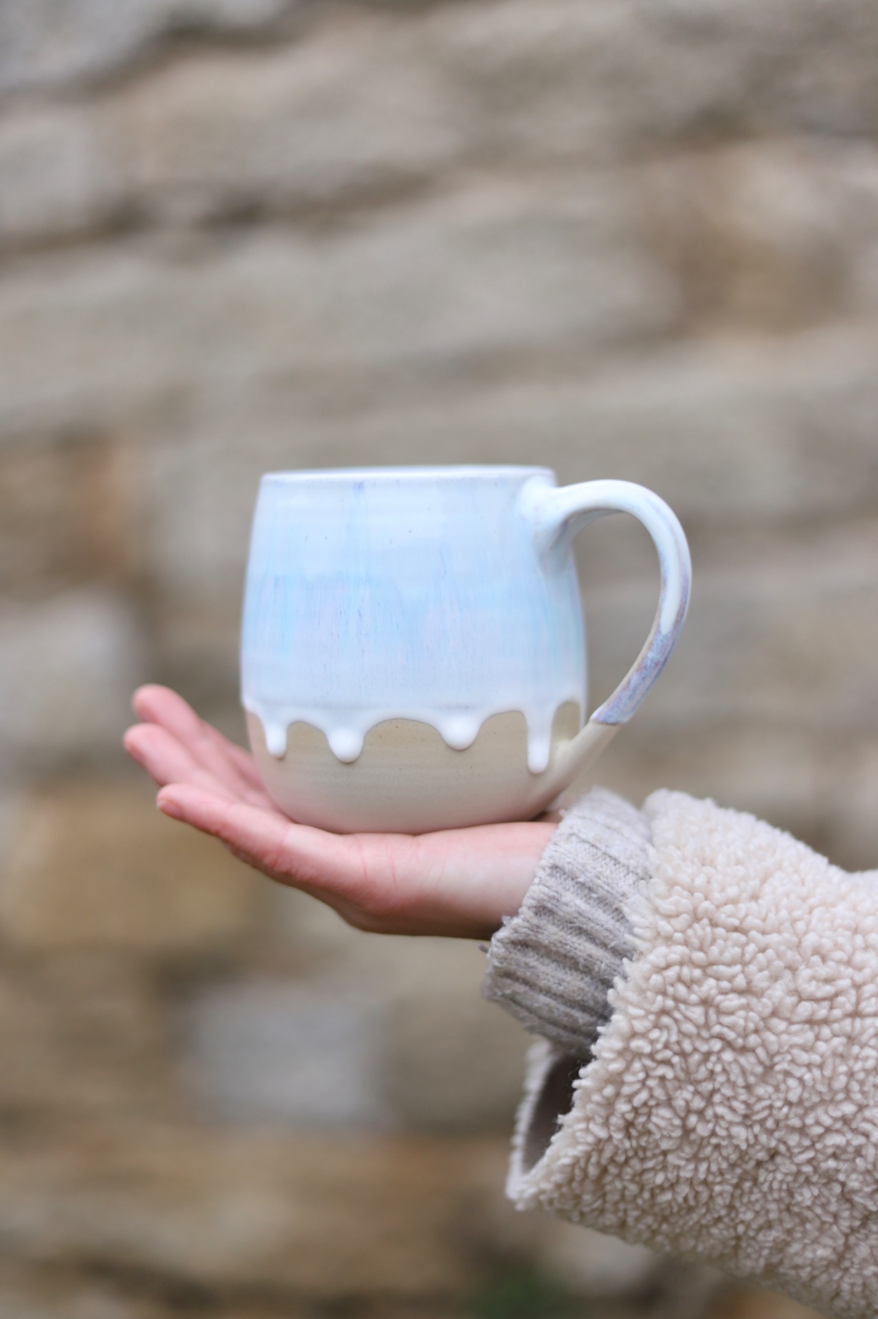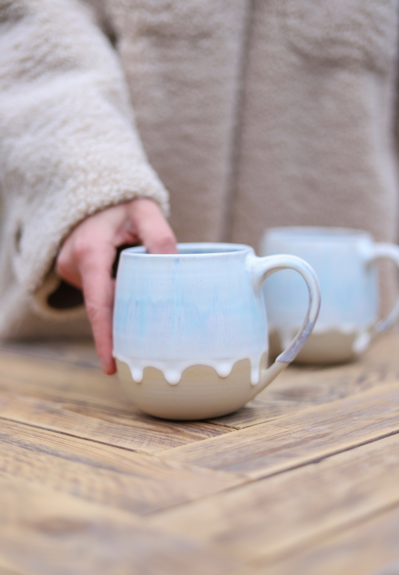 Hrnek na čaj s objemem cca 500ml s bílo modrou glazurou. Tahle glazura nás při focení vždy trochu potrápí, protože je opravdu velmi světlá. Spodní půlka je lehce do modra, horní je bílo béžová a nahoře se objevují zlaté krystaly. Je to zapeklitá glazura, ale jedinečná.