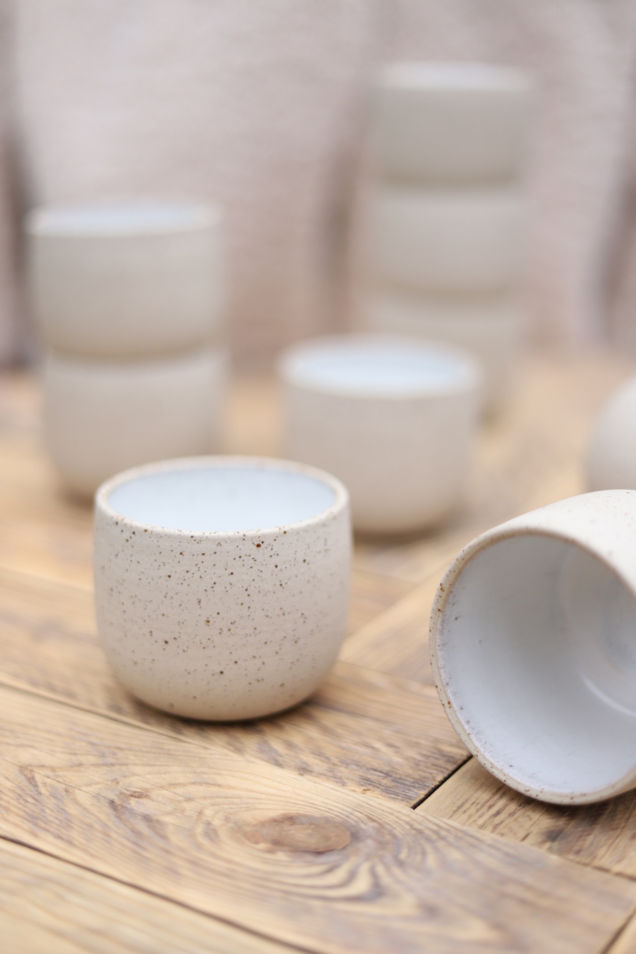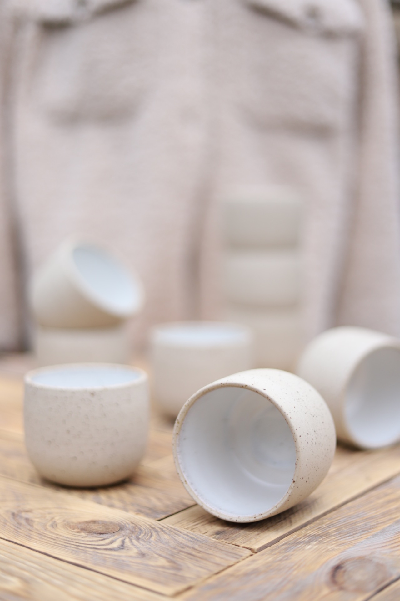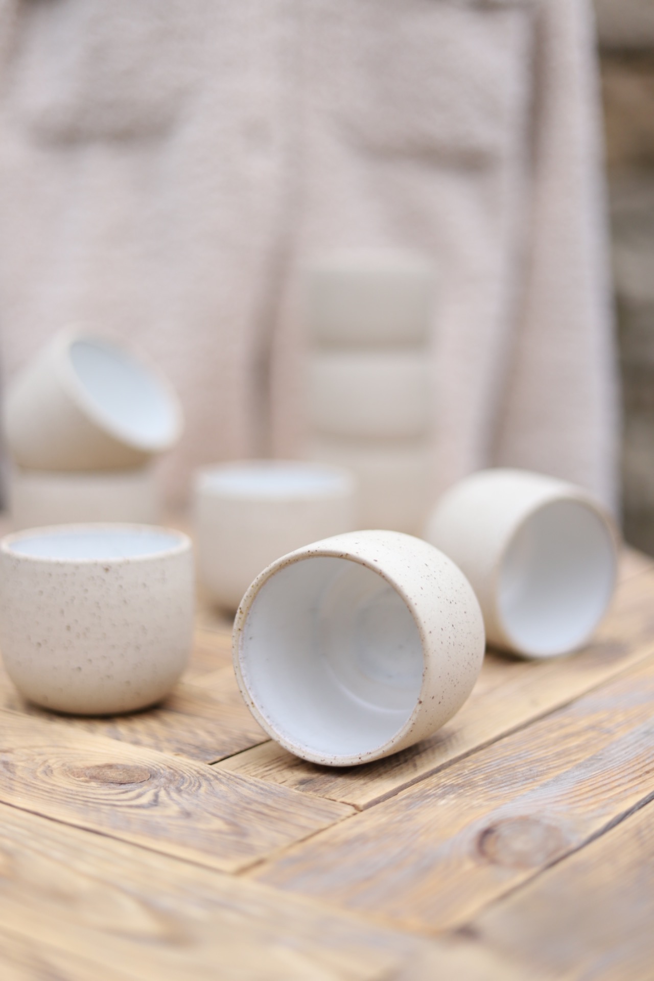 Kalíšek na kafe i čaj s objemem cca 220ml s bílou glazurou pouze uvnitř, venkovní strana je do jemna vybroušená. Kalíšek je vytočen z tečkované kameniny a vypálen na vysoké teploty.