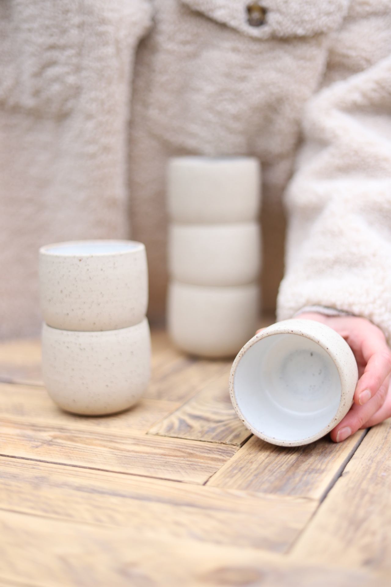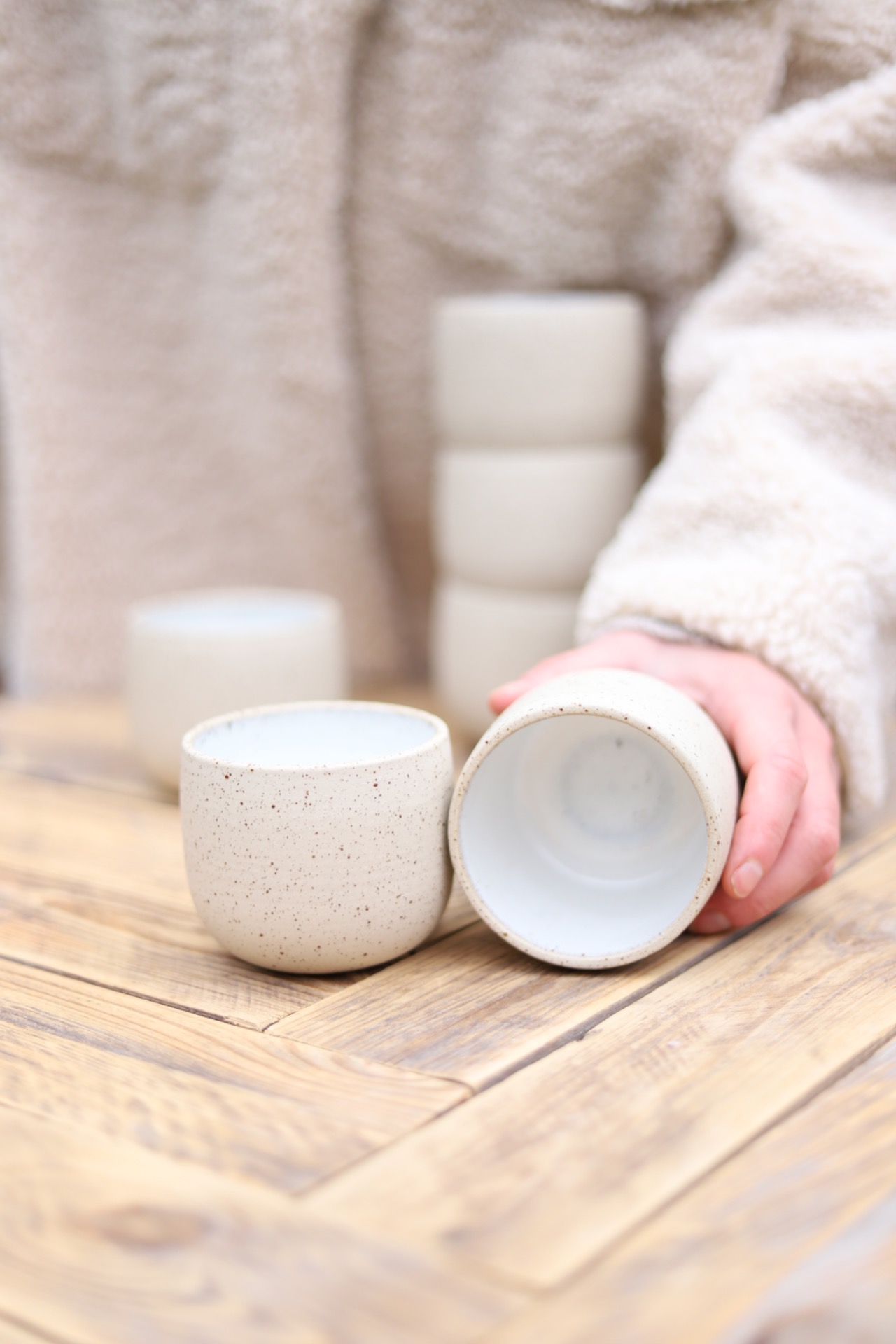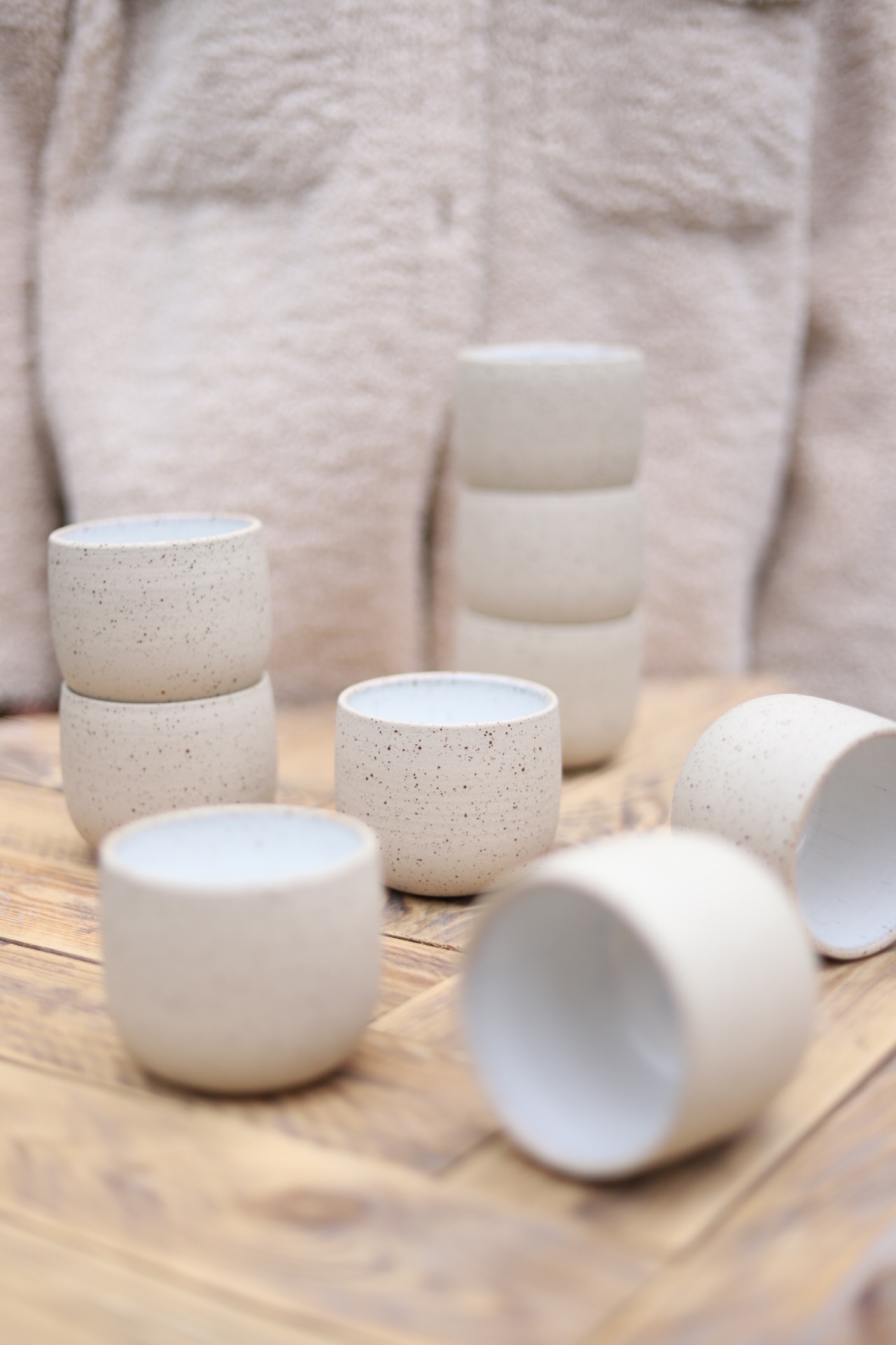 Kalíšek na kafe i čaj s objemem cca 220ml s bílou glazurou pouze uvnitř, venkovní strana je do jemna vybroušená. Kalíšek je vytočen z tečkované kameniny a vypálen na vysoké teploty.