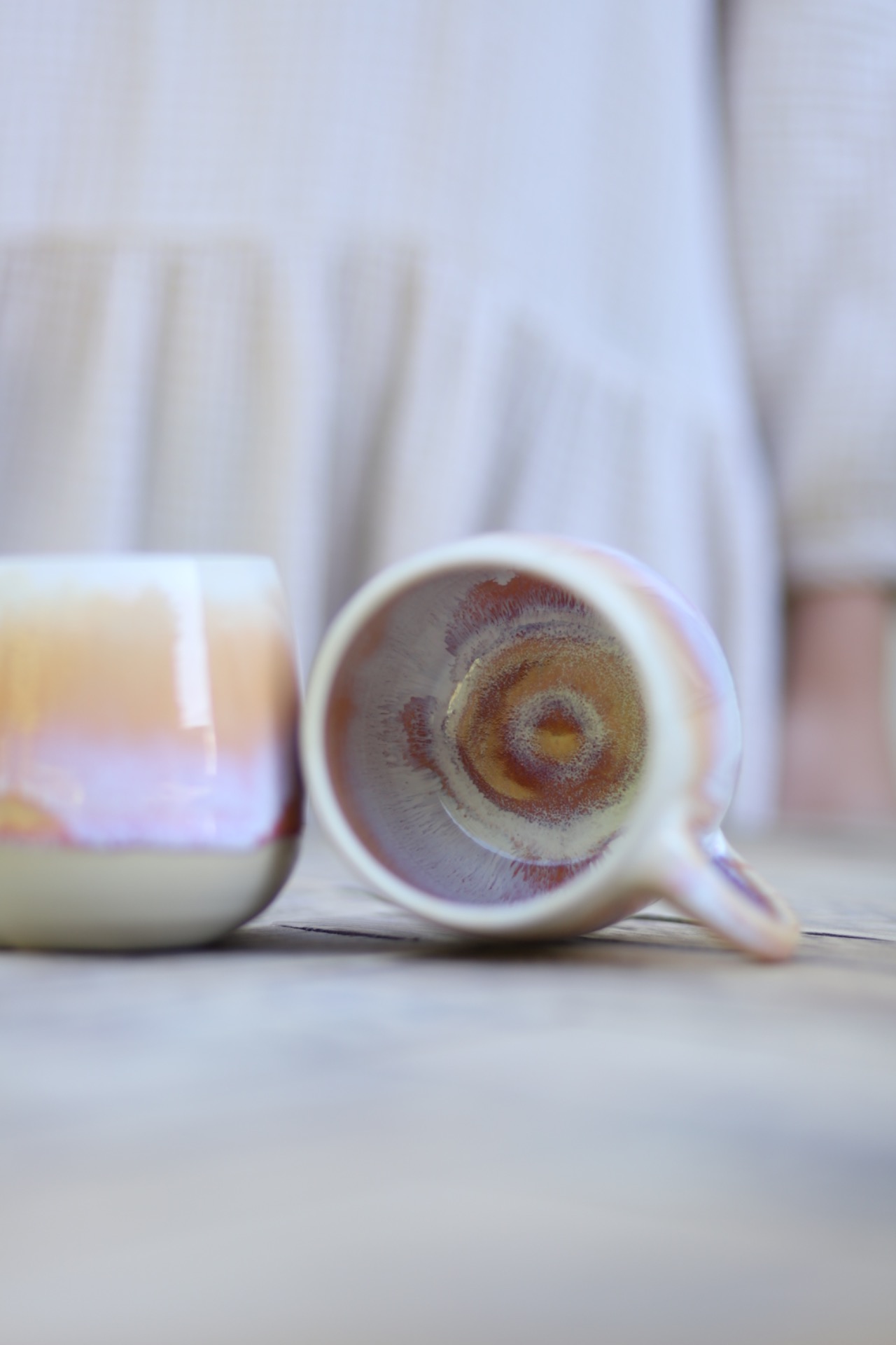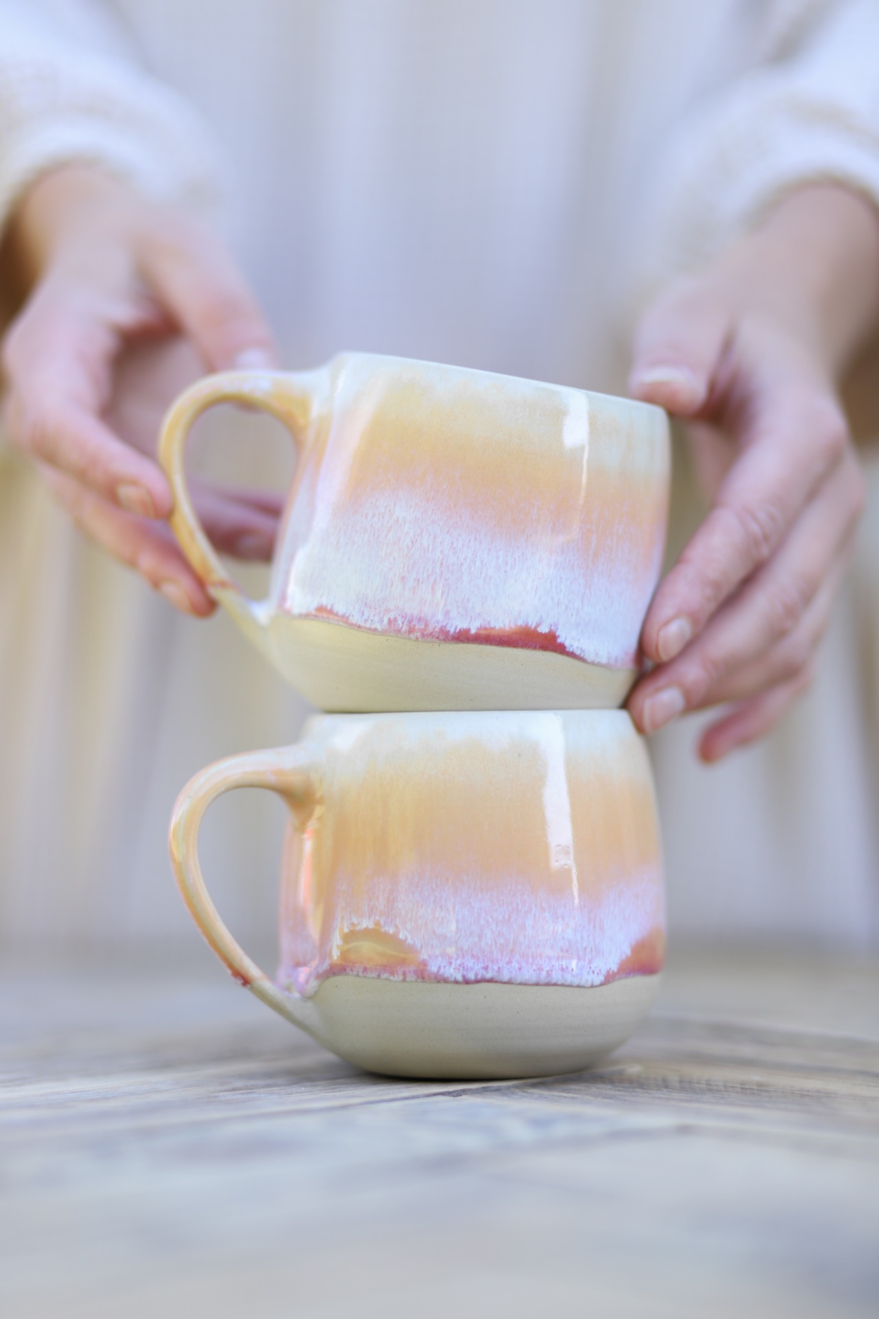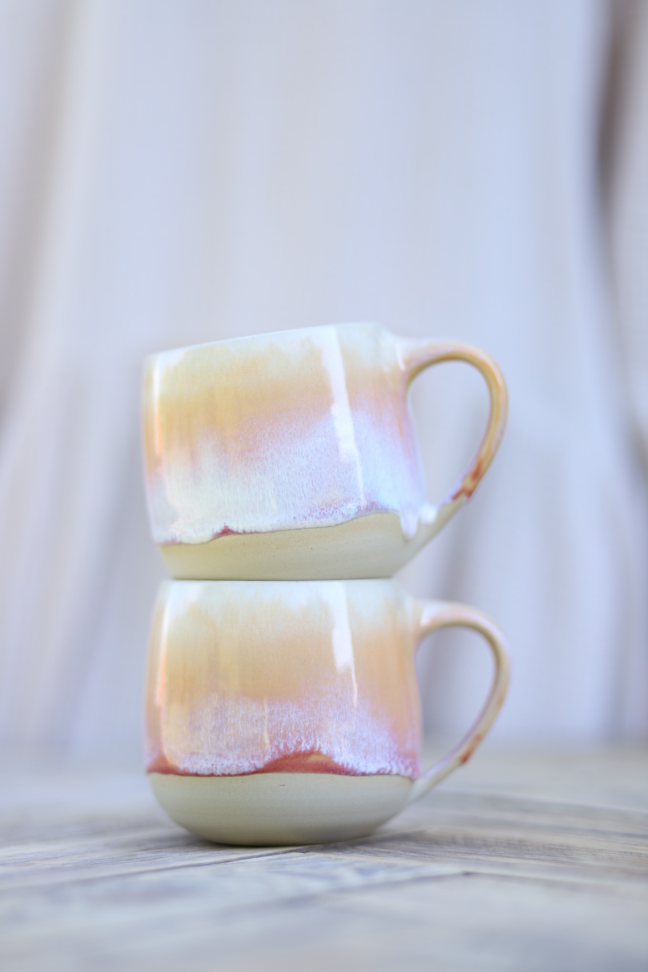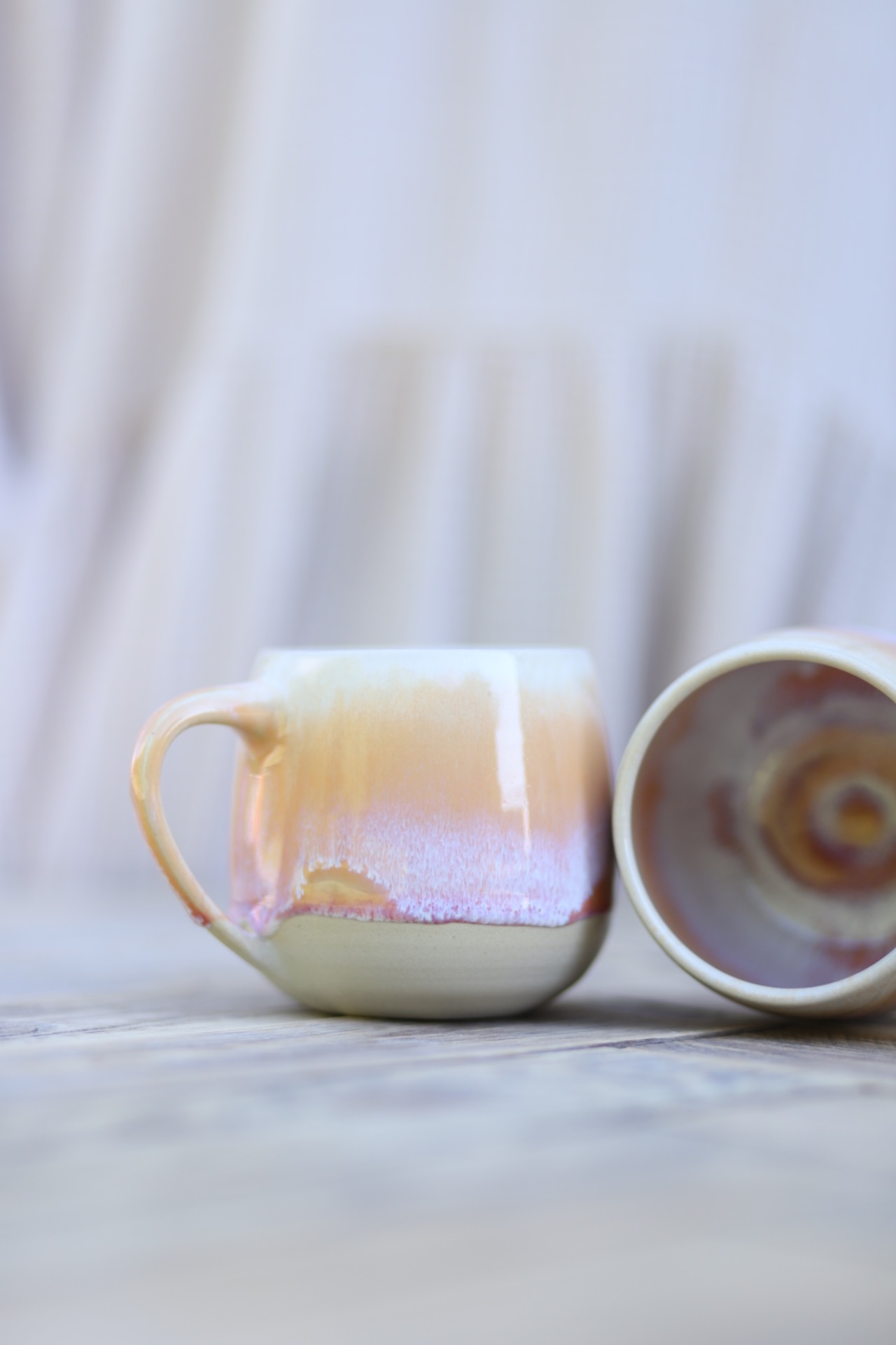 Hrnek s objemem cca 360ml s efektní oranžovo růžovou bílou glazurou v tenké tloušťce. Hrnek je vytočen z béžové kameniny a vypálen na vysoké teploty.