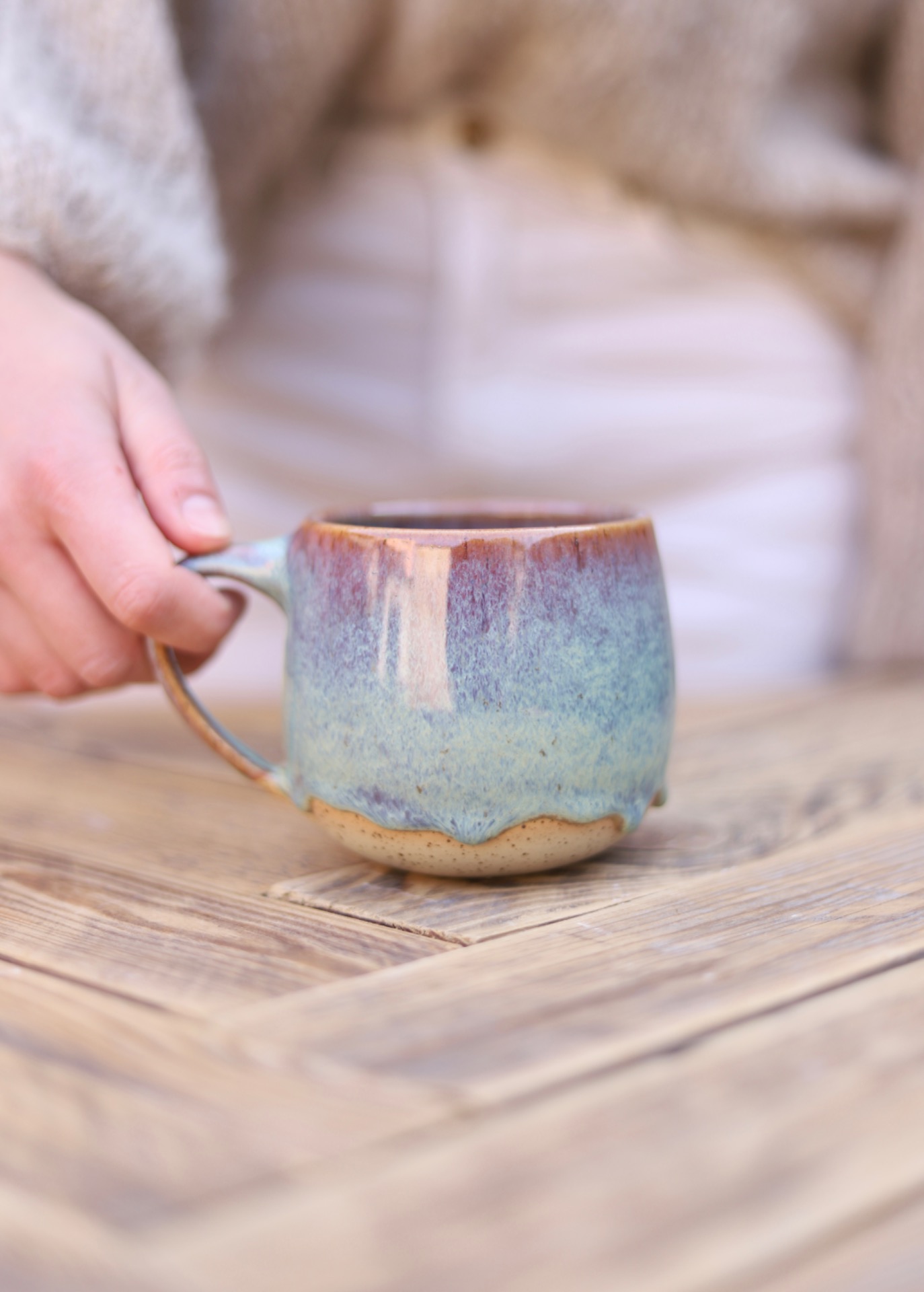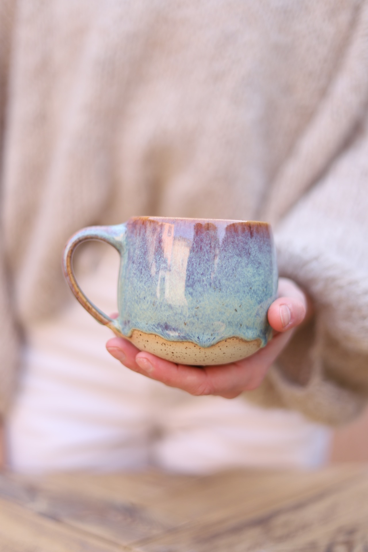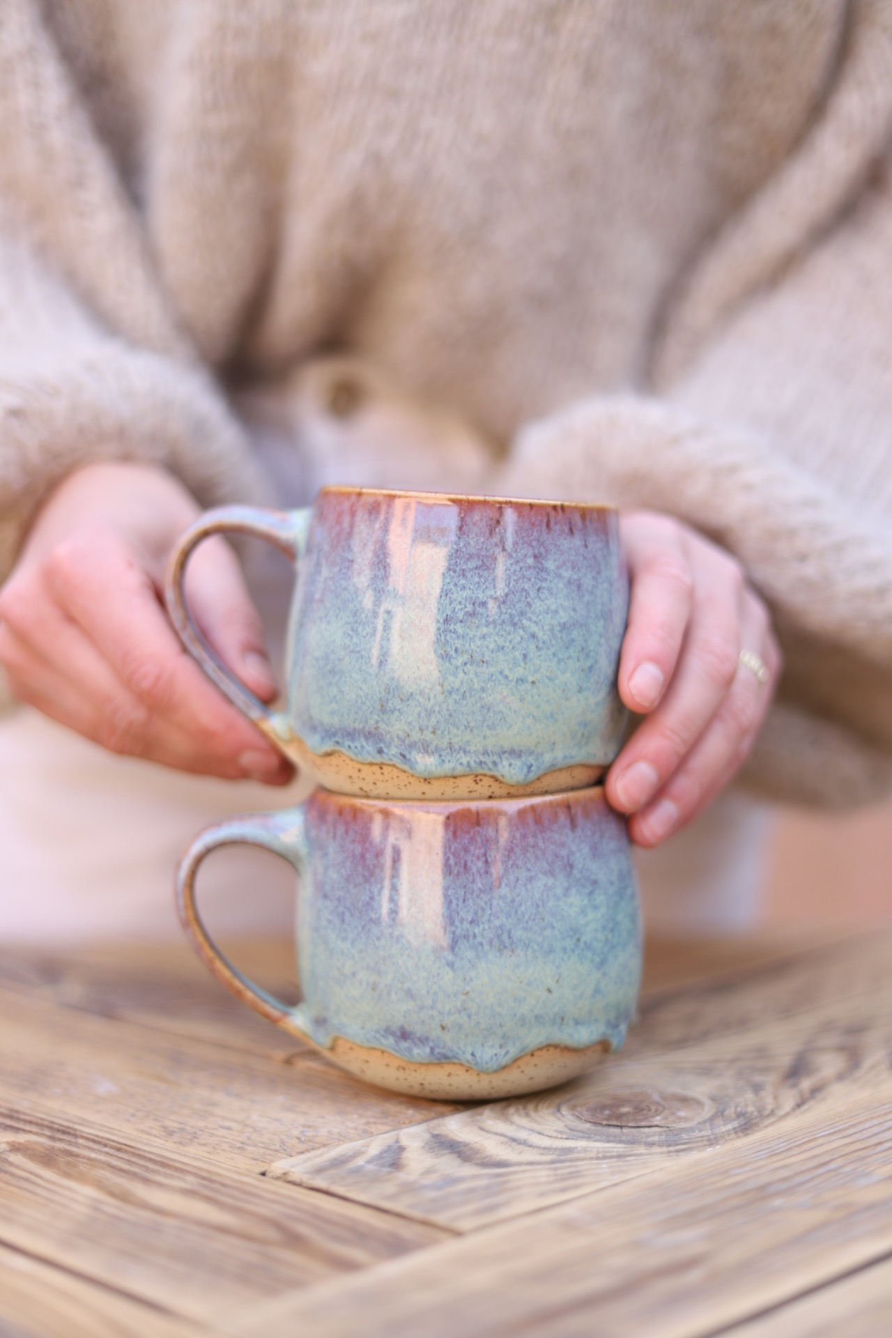 Hrnek s objemem cca 350-370ml s efektní růžovo-zelenou glazurou. Hrnek je vytočen z tečkované kameniny a vypálen na vysoké teploty.