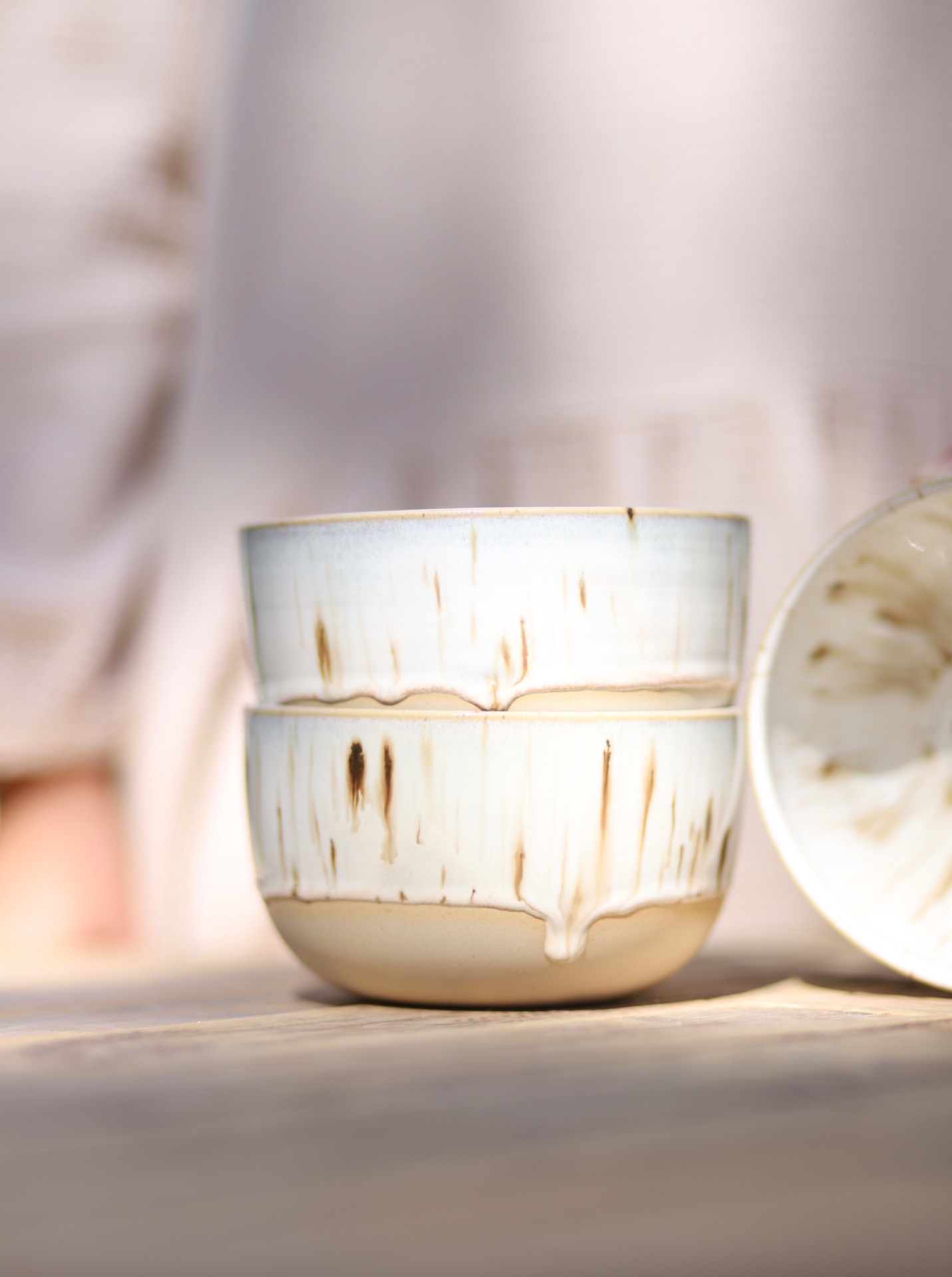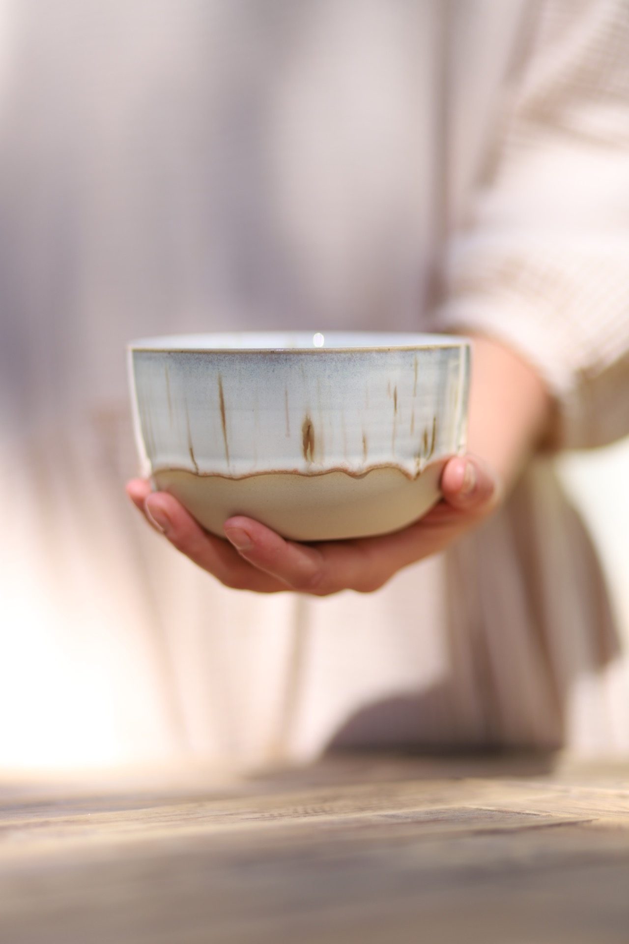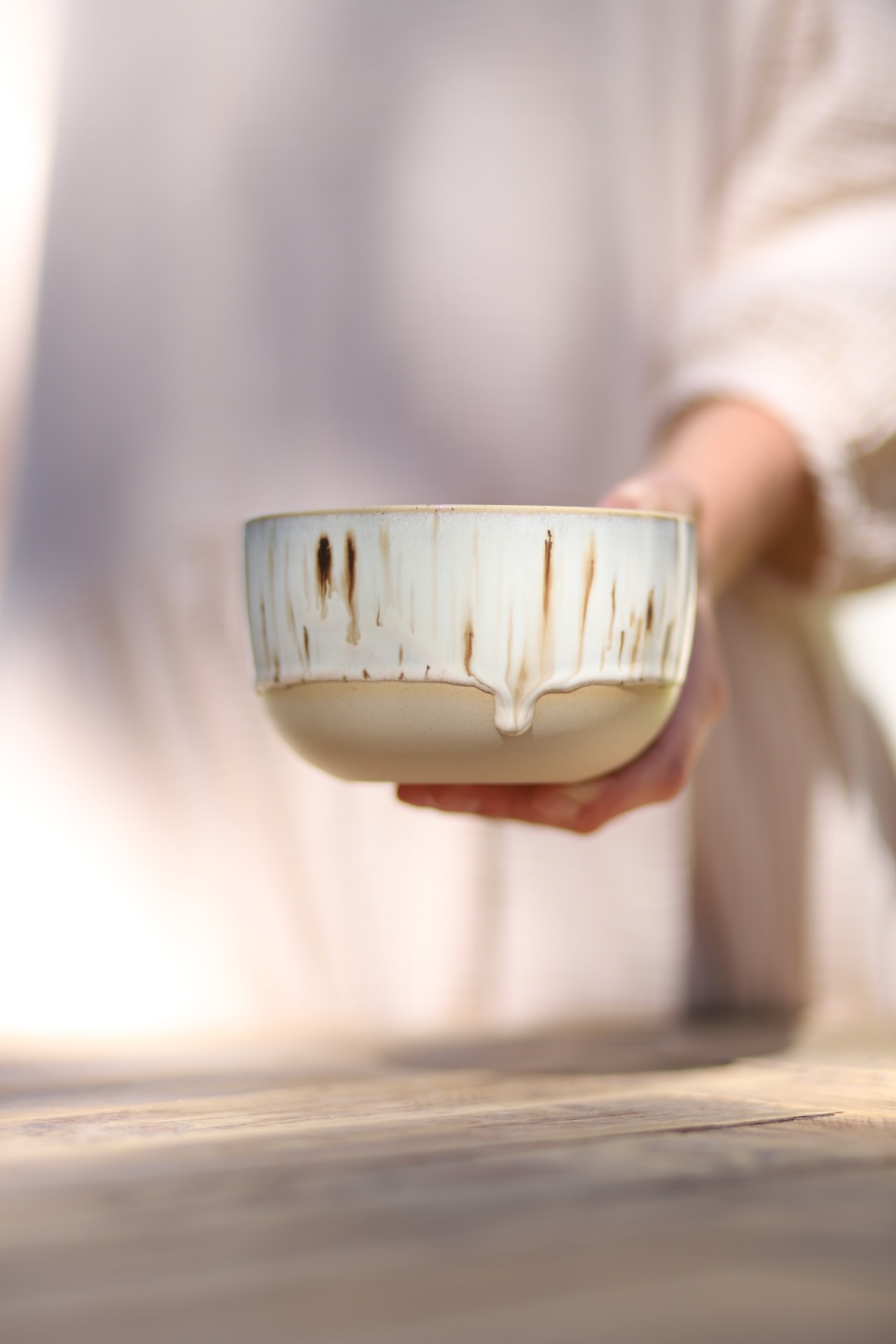 Miska s objemem cca 550-600ml s krémovou glazurou s hnědými floty. Je vytočena z béžové kameniny a vypálena na vysoké teploty.