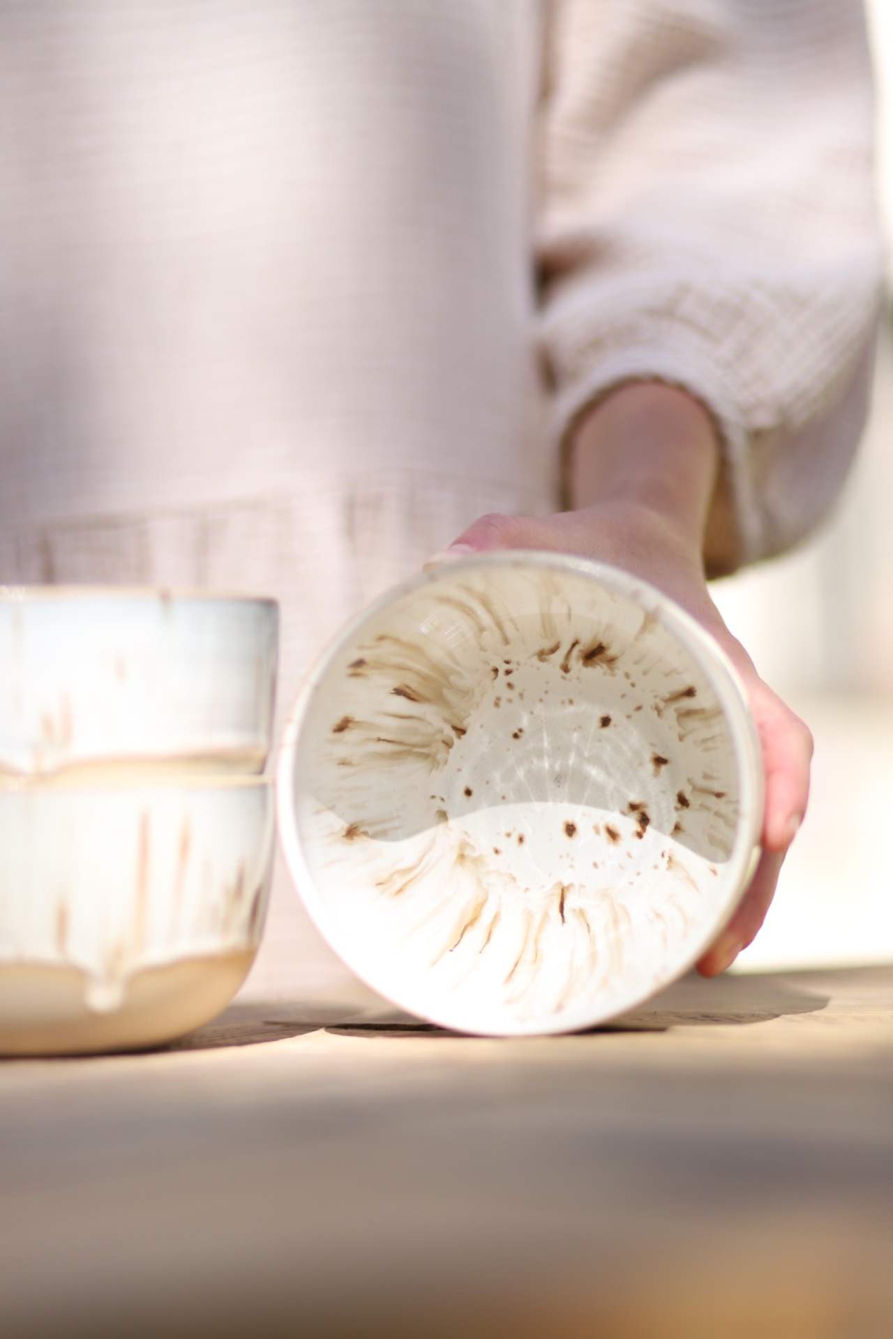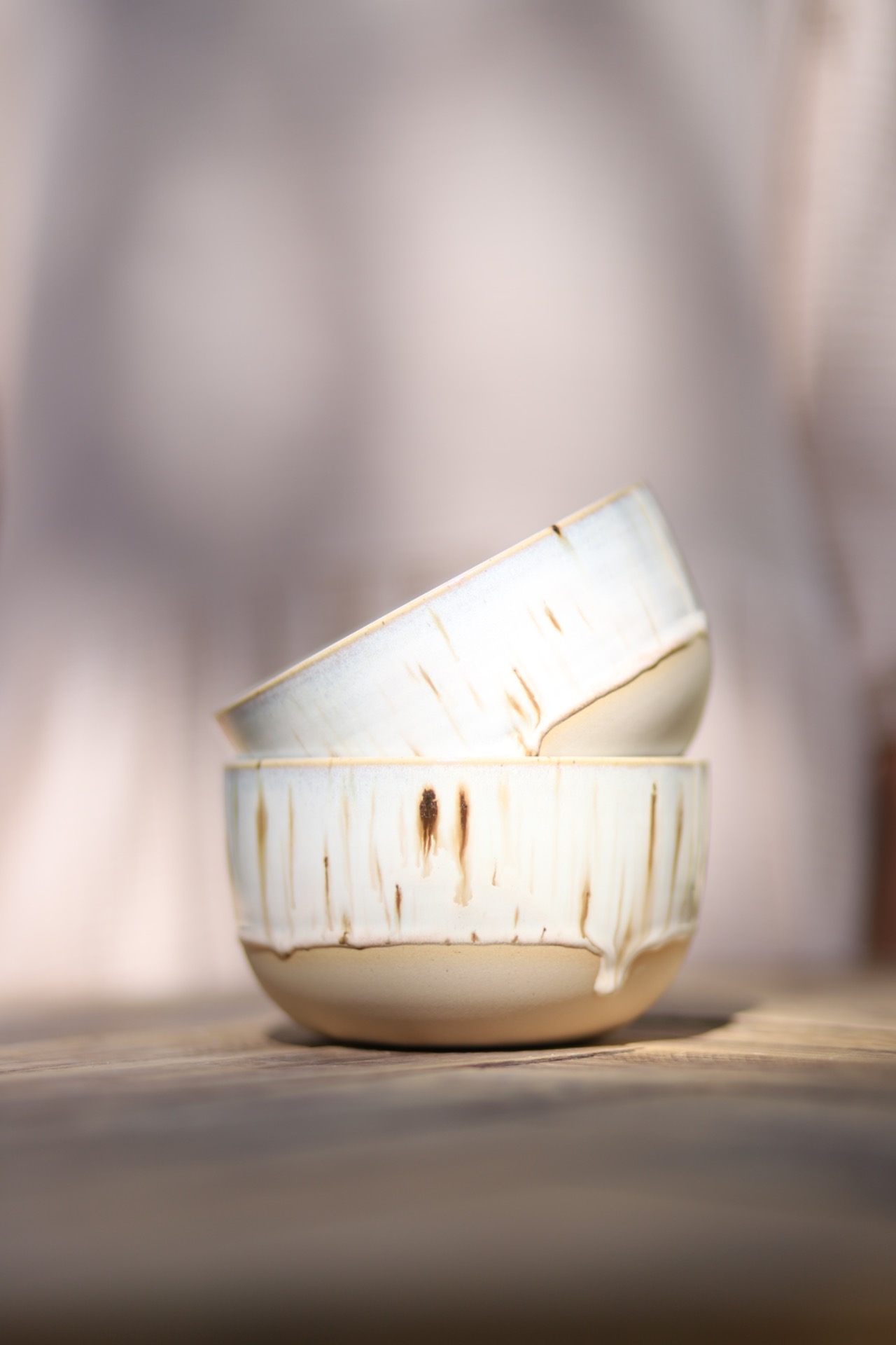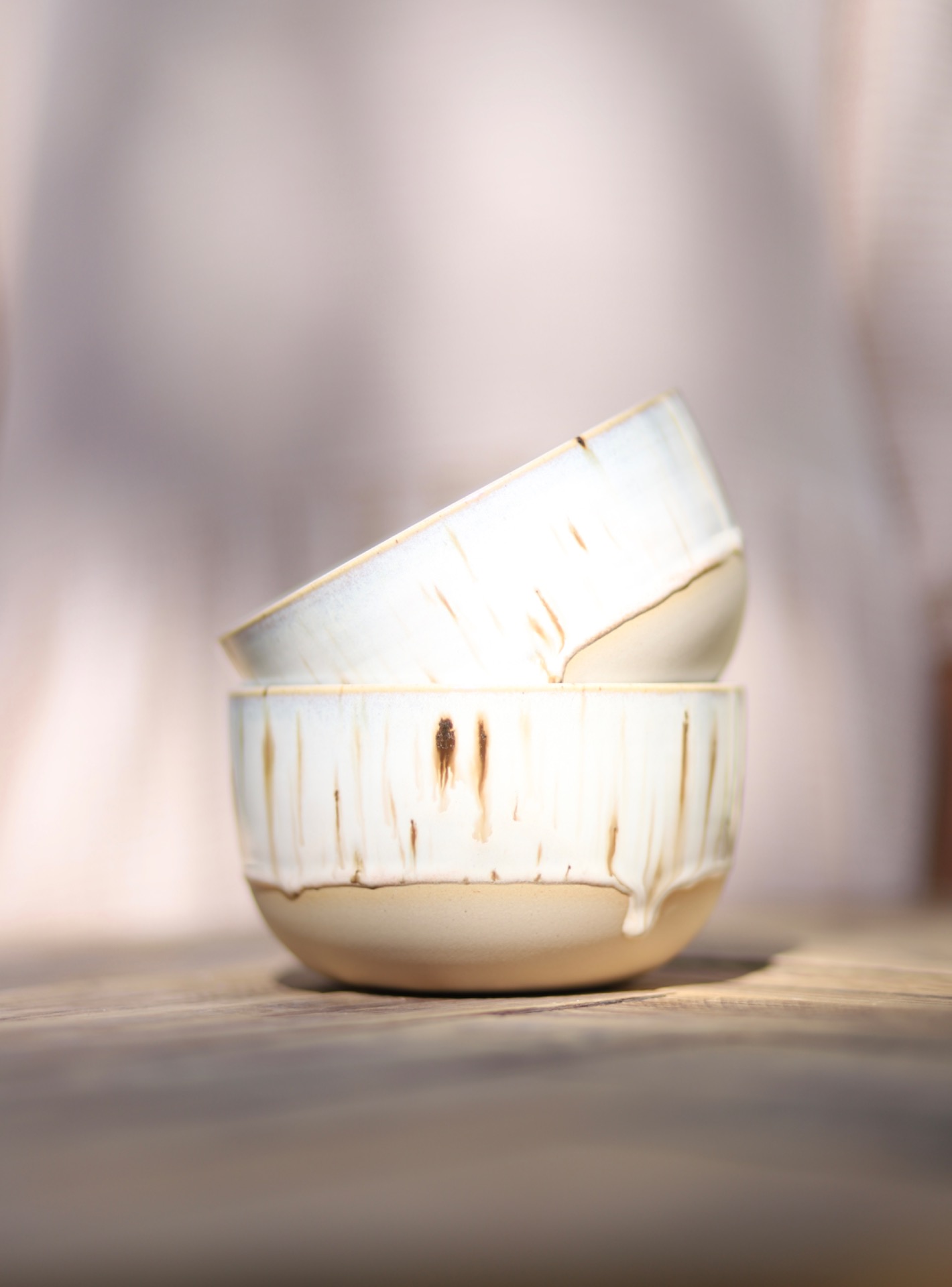 Miska s objemem cca 550-600ml s krémovou glazurou s hnědými floty. Je vytočena z béžové kameniny a vypálena na vysoké teploty.