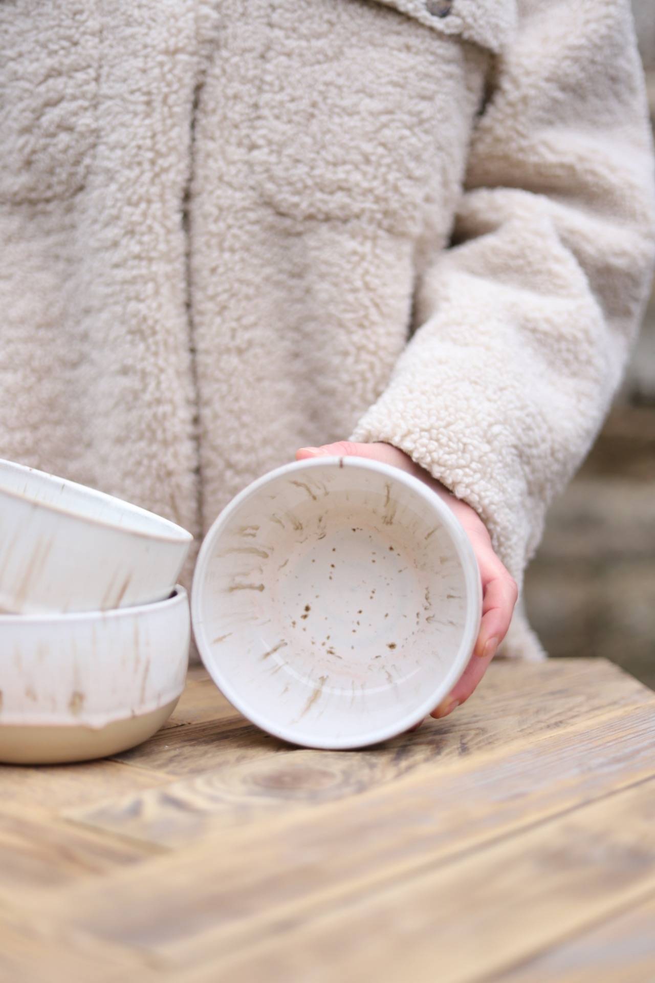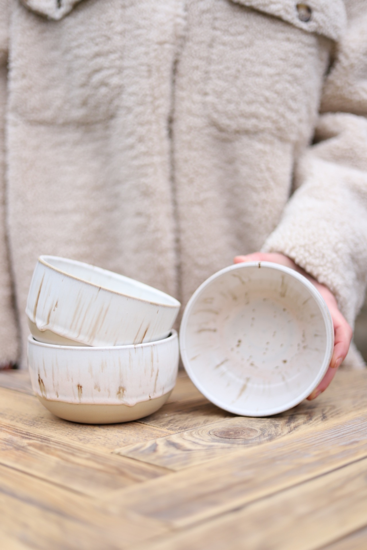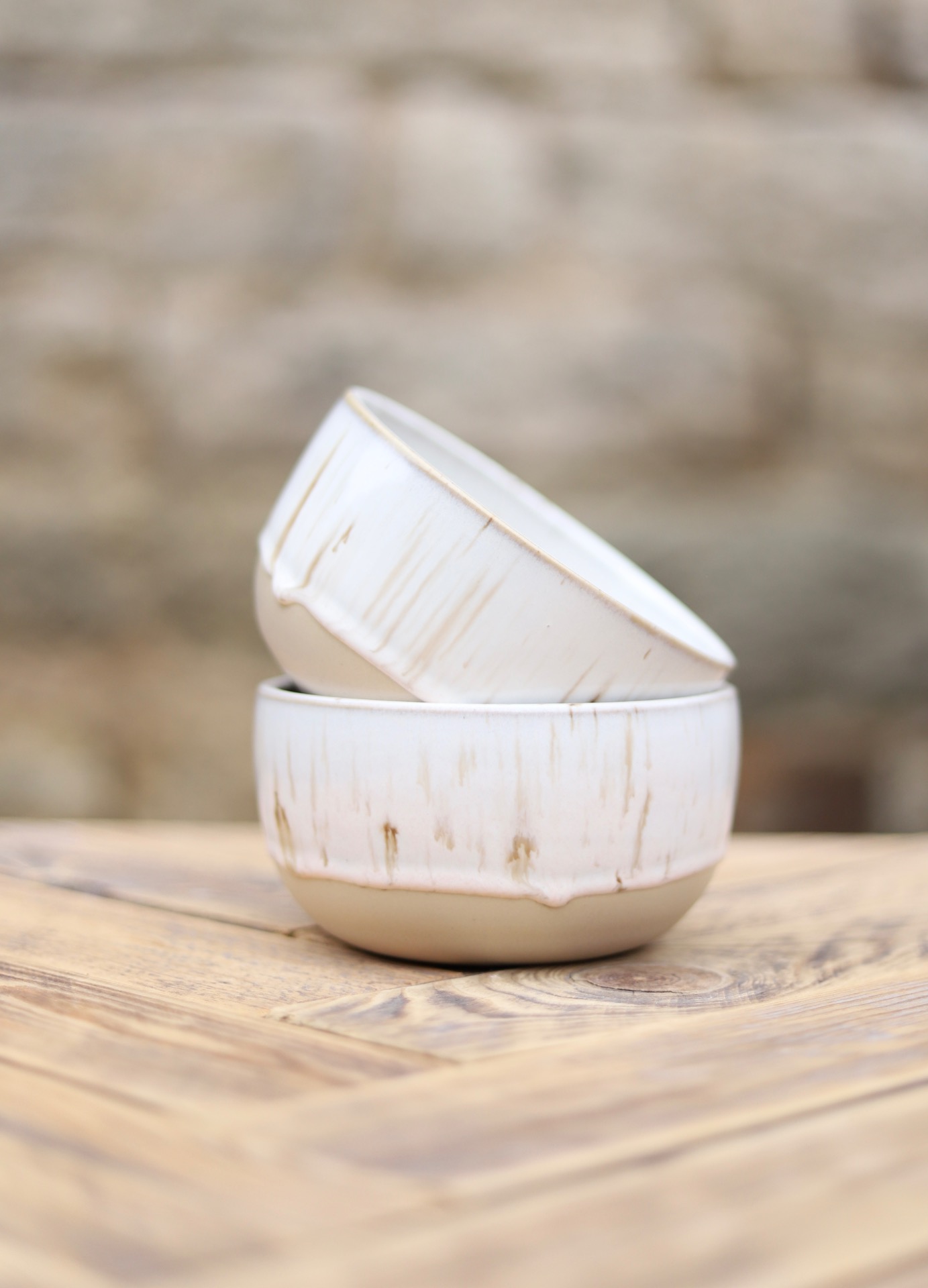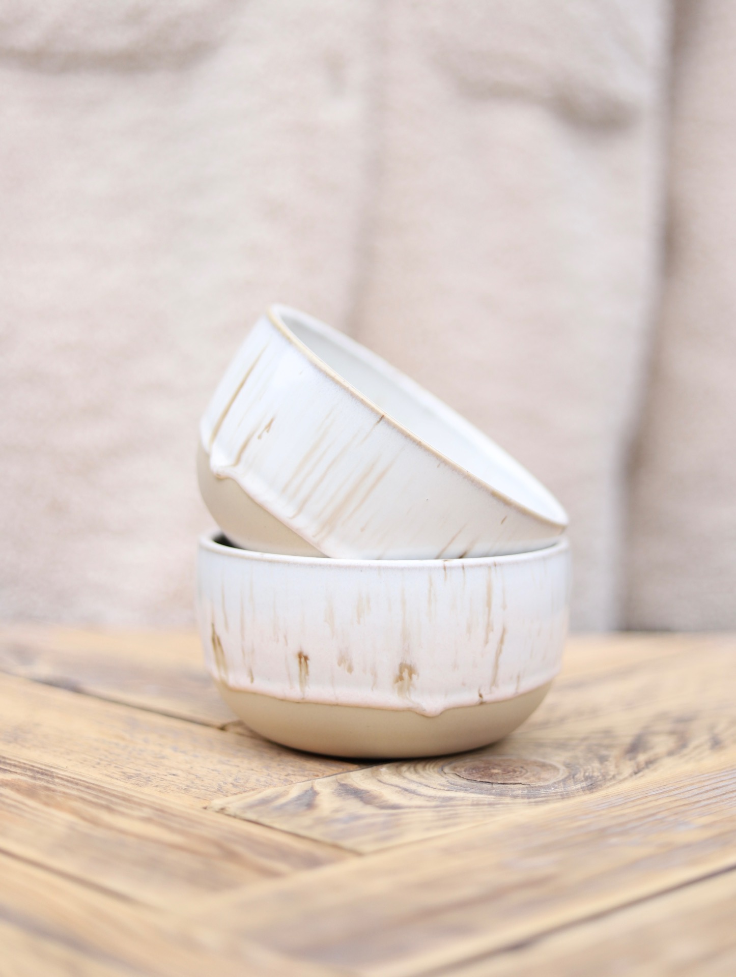 Miska s objemem cca 550ml s krémovou glazurou s hnědými floty. Je vytočena z béžové kameniny a vypálena na vysoké teploty.