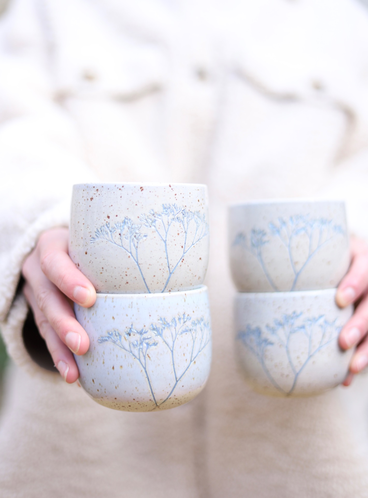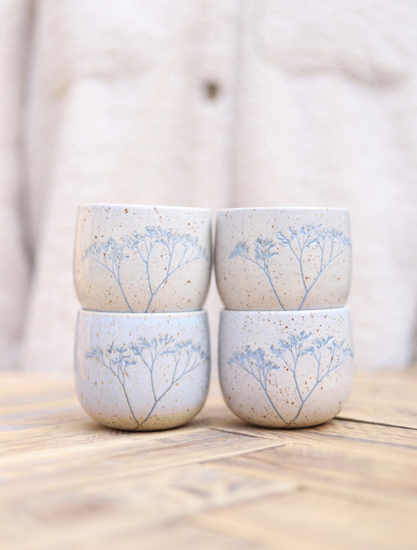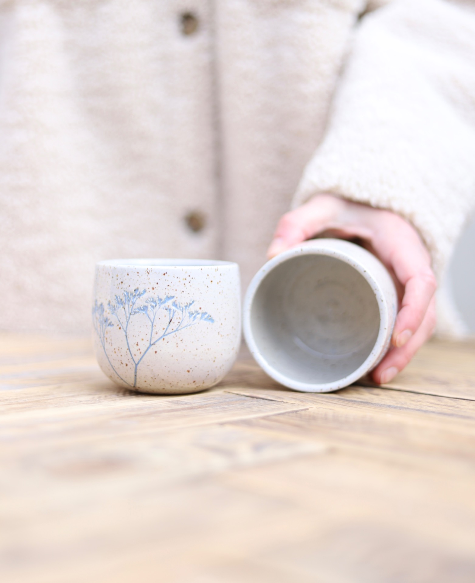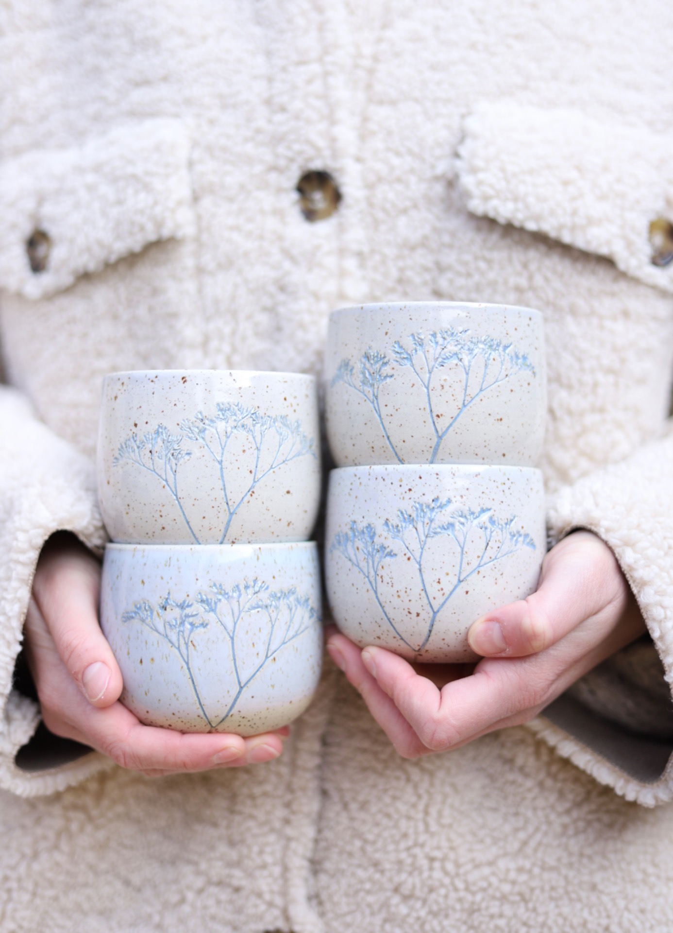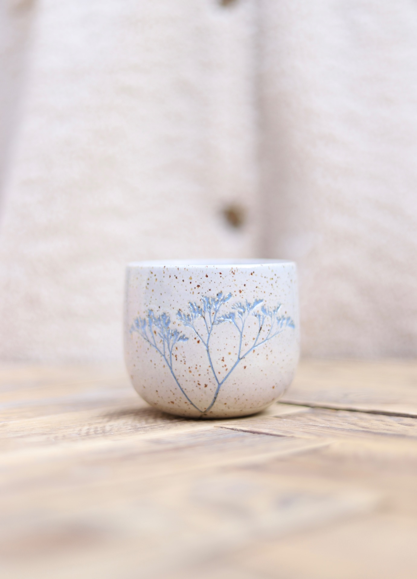 Kalíšek na kafe i čaj s objemem cca 250ml s přirodním obtiskem a světle modrou galzurou. Je vytočen z tečkované kameniny a vypálen na vysoké teploty.
