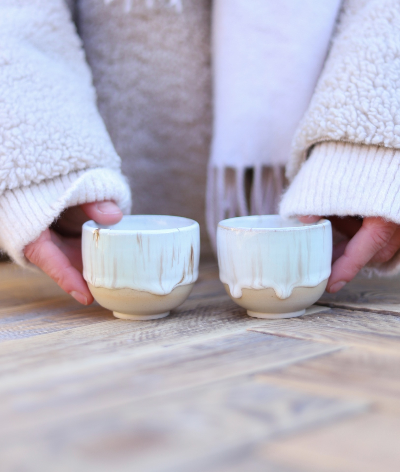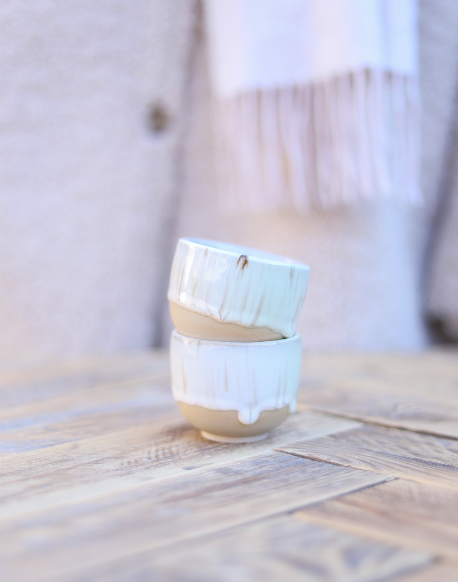 Kalíšek na espresso s objemem cca 80ml s krémovou glazurou s hnědými floty. Kalíšek je vytočen z béžové kameniny a vypálen na vysoké teploty.