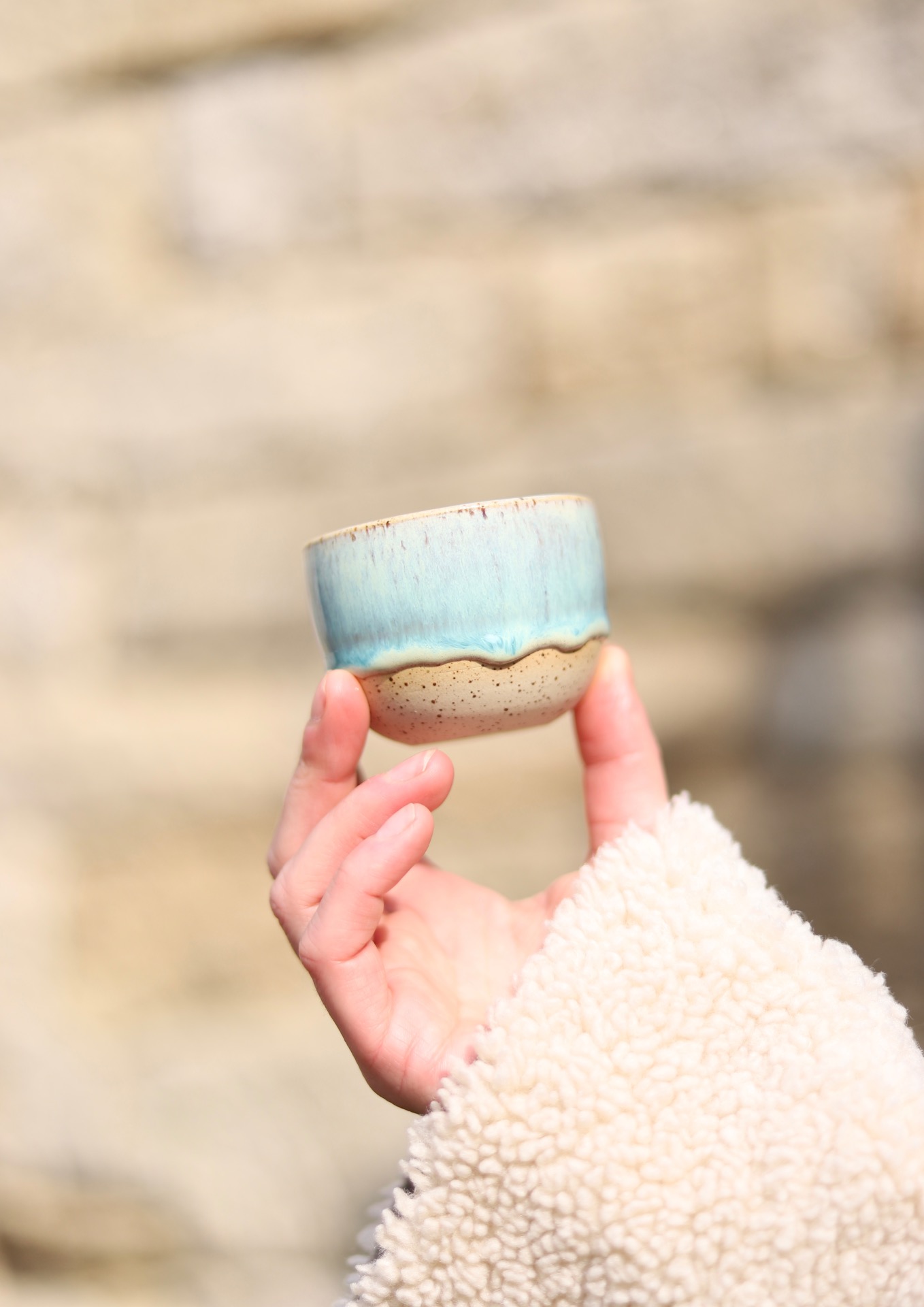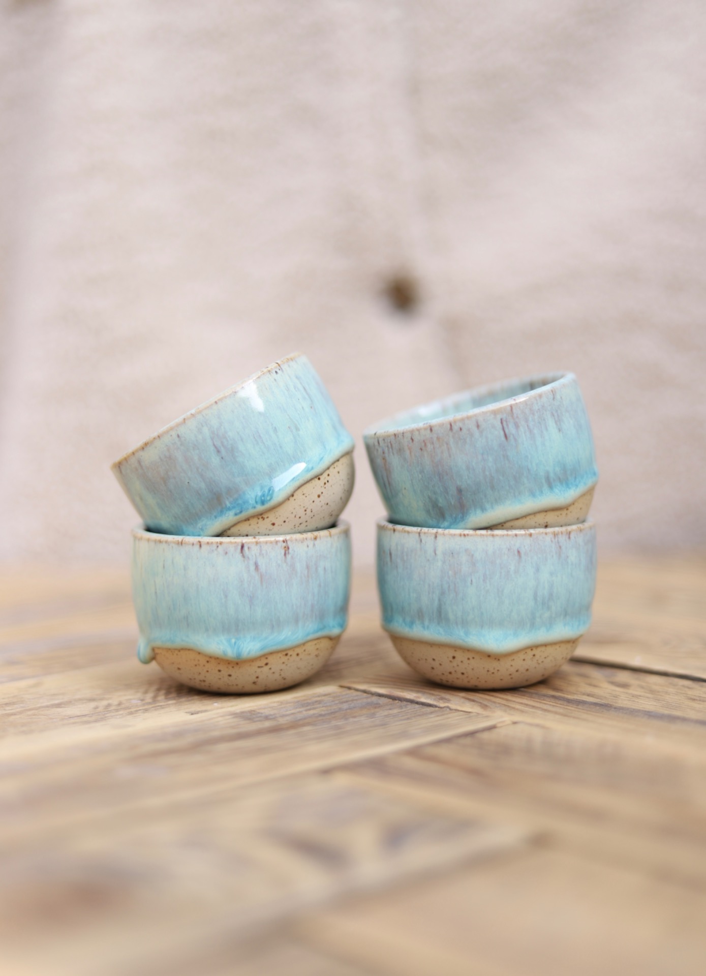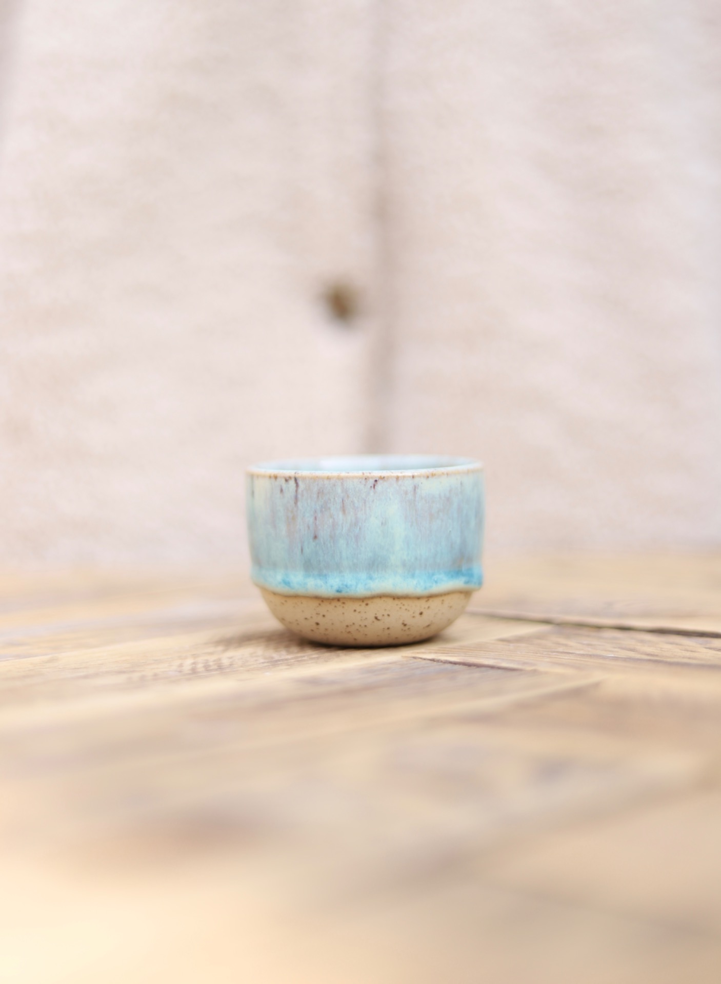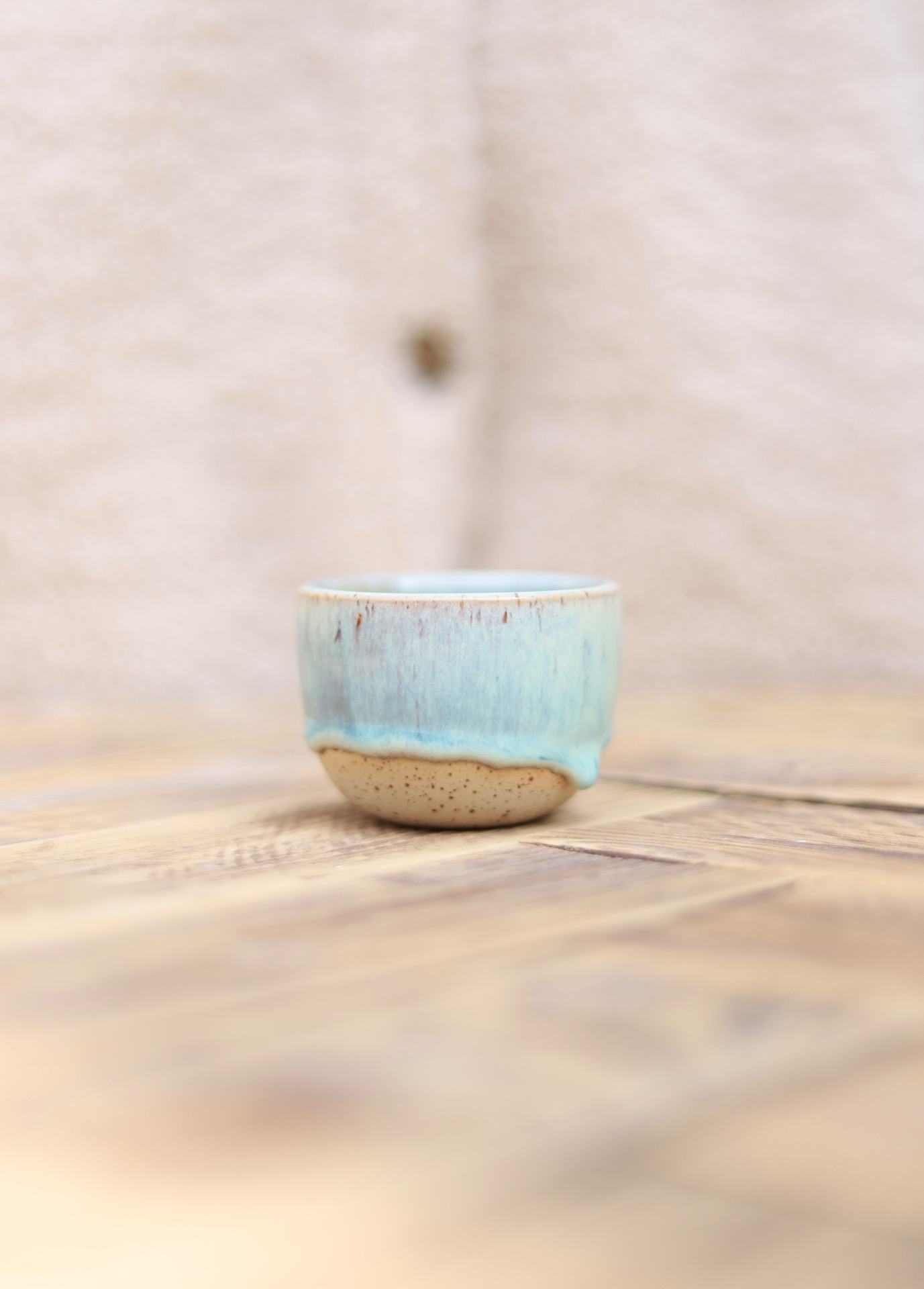 Kalíšek na espresso s objemem cca 90ml se zeleno-modrou glazurou. Kalíšek je vytočen z tečkované kameniny a vypálen na vysoké teploty.
