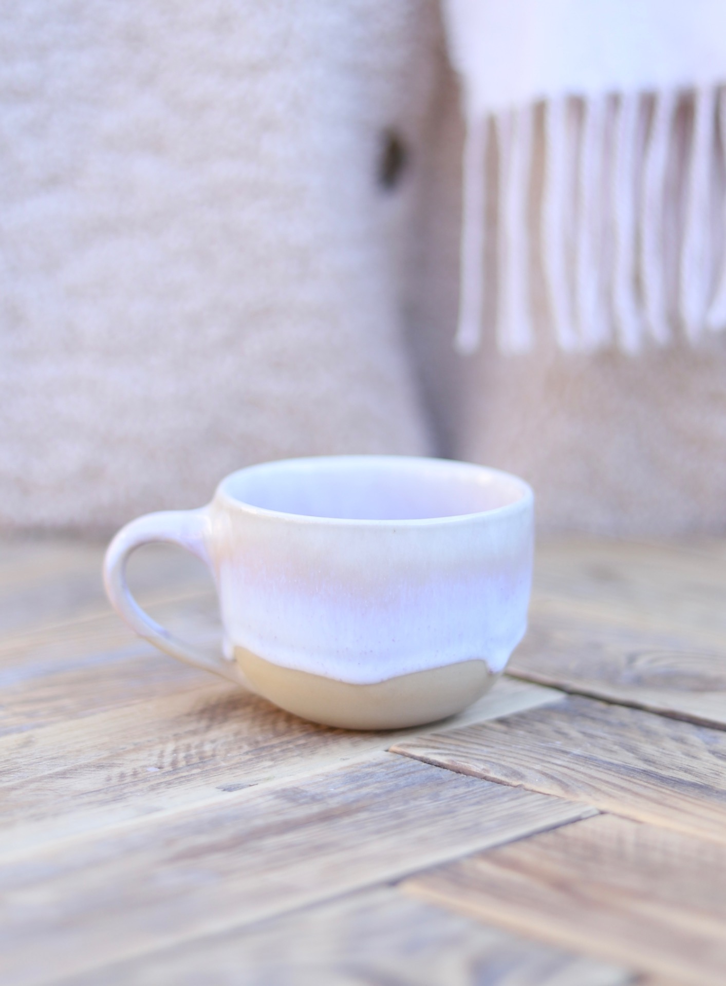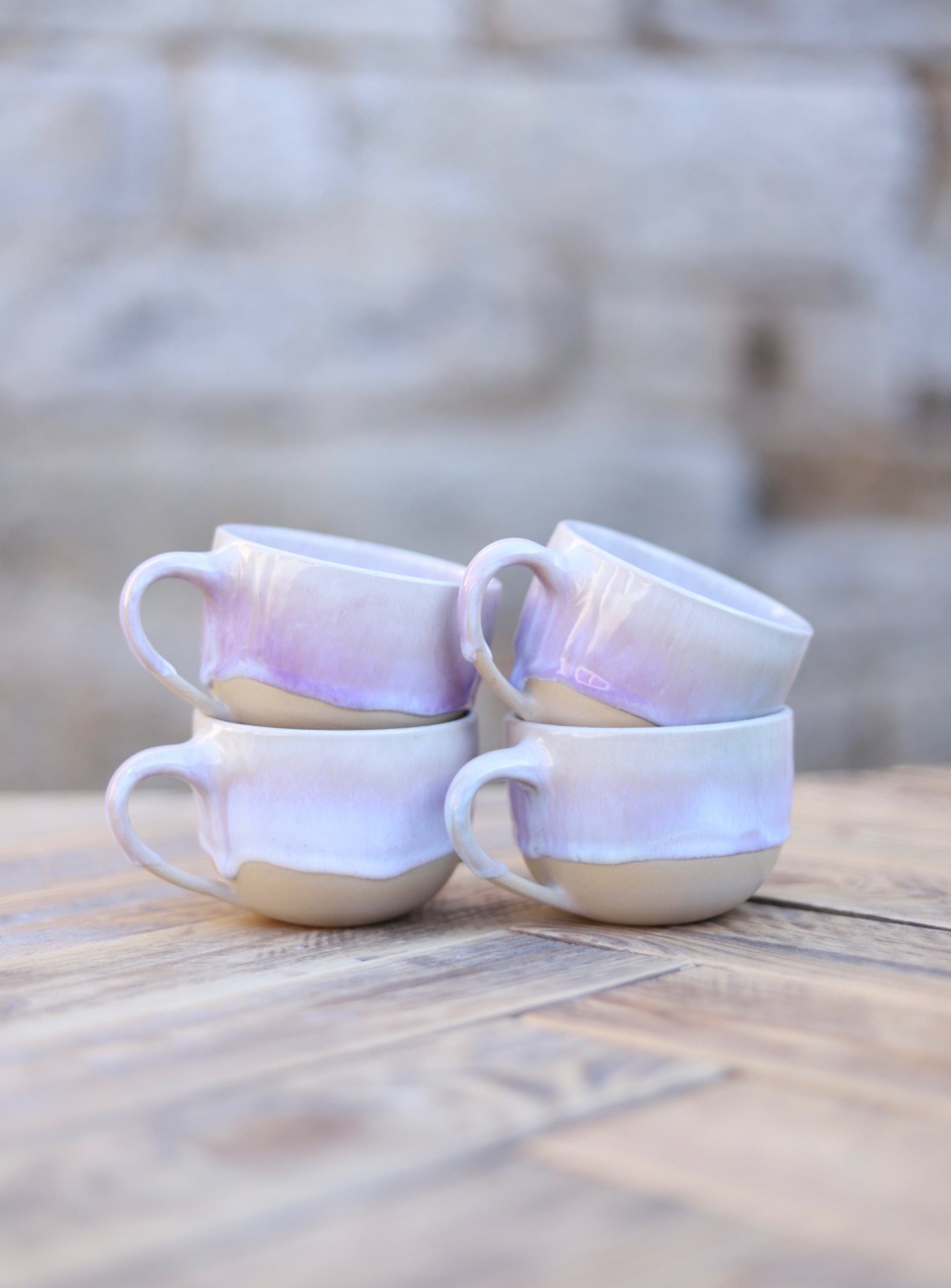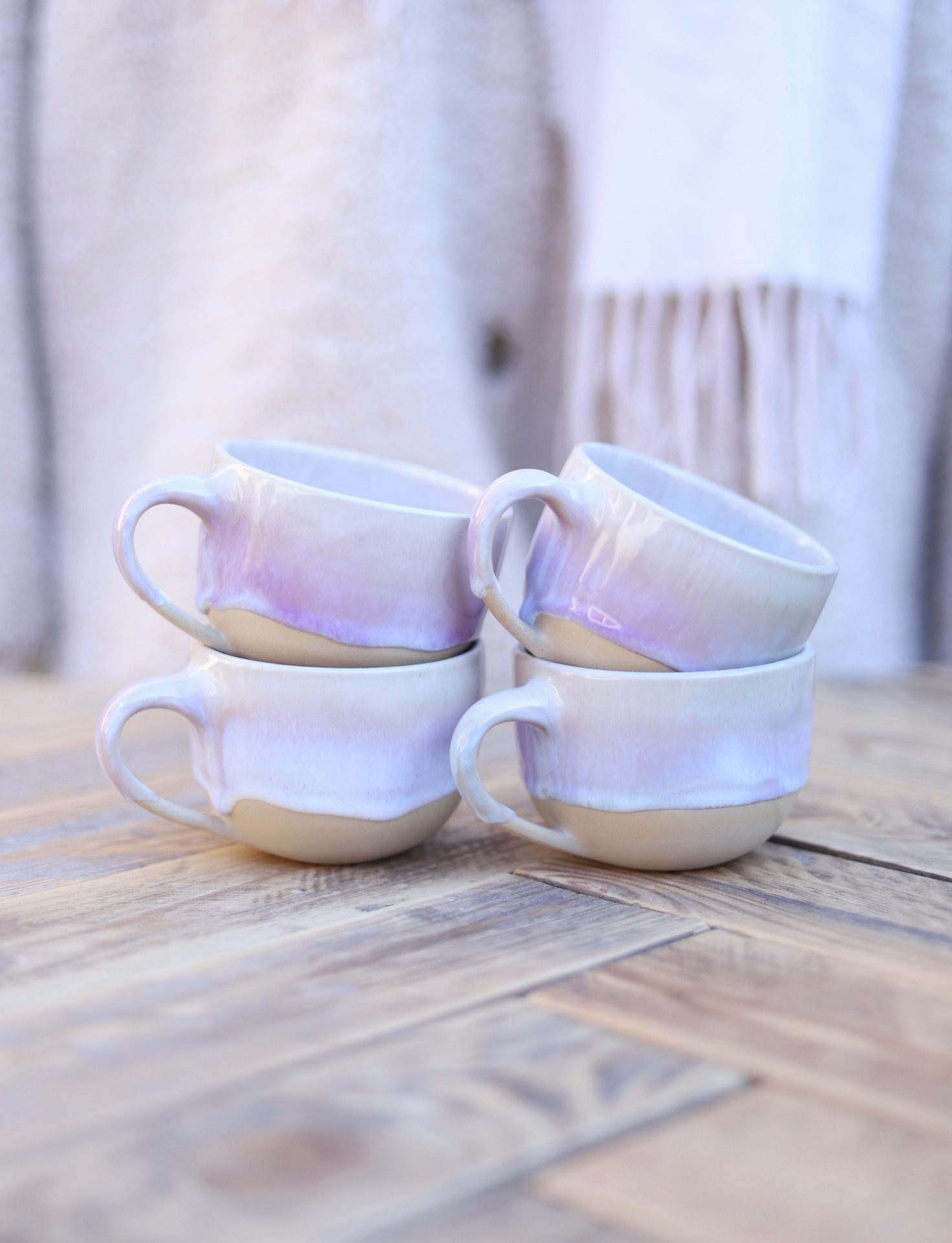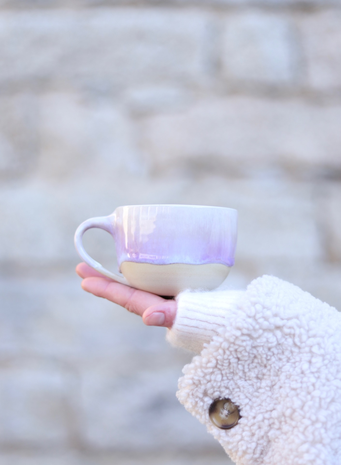 Hrnek s objemem cca 180-200ml s efektní světlou bílo-fialovou glazurou. Je vytočen z béžové kameniny a vypálen na vysoké teploty.