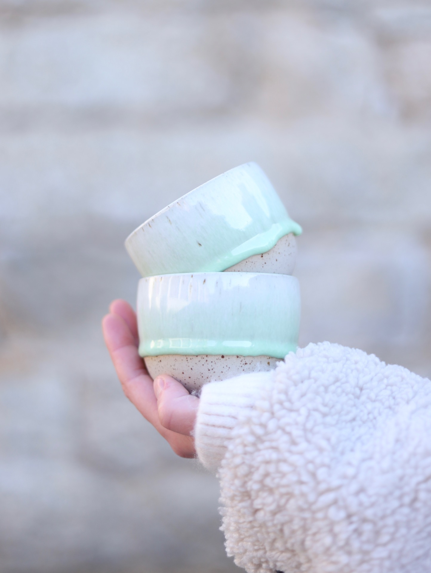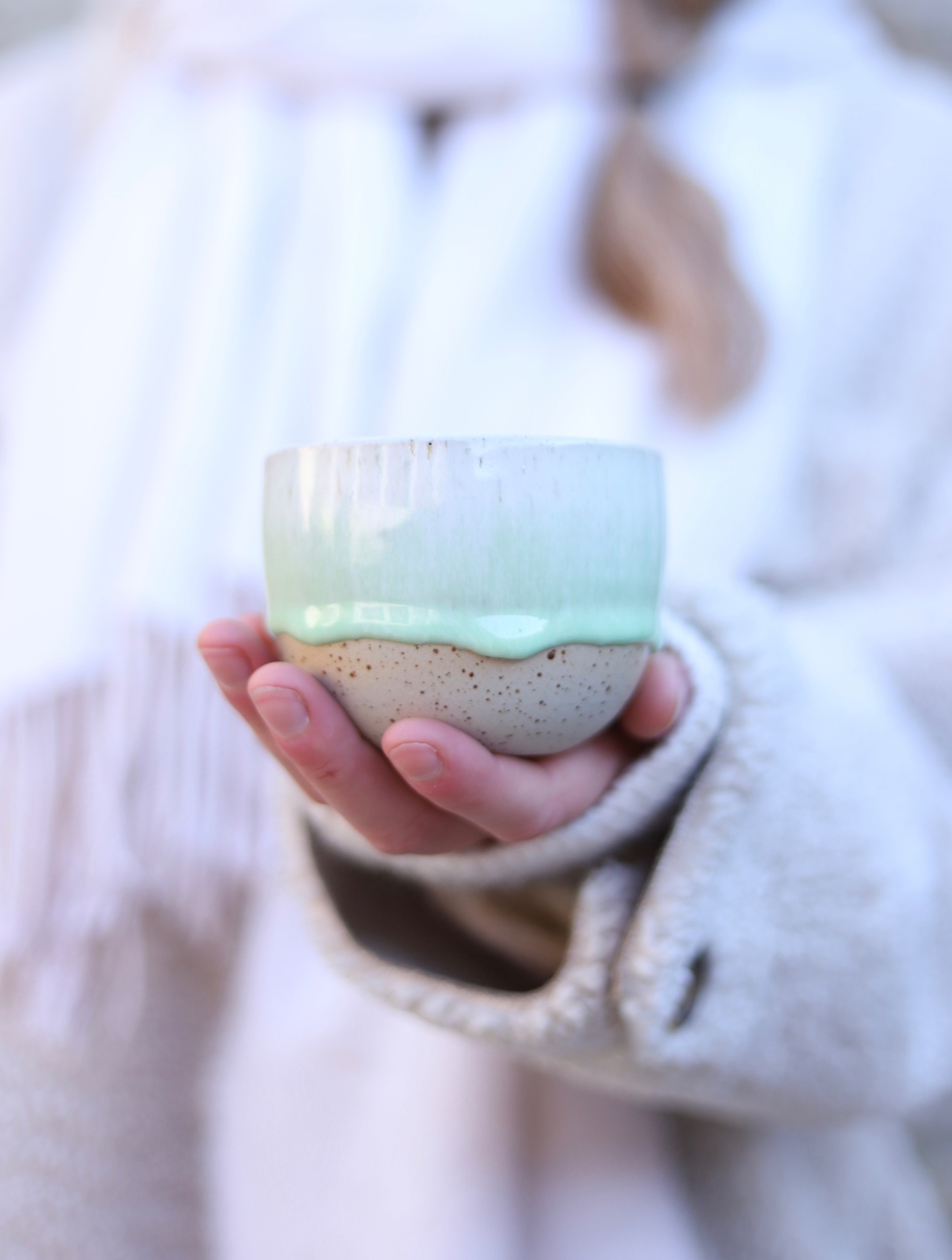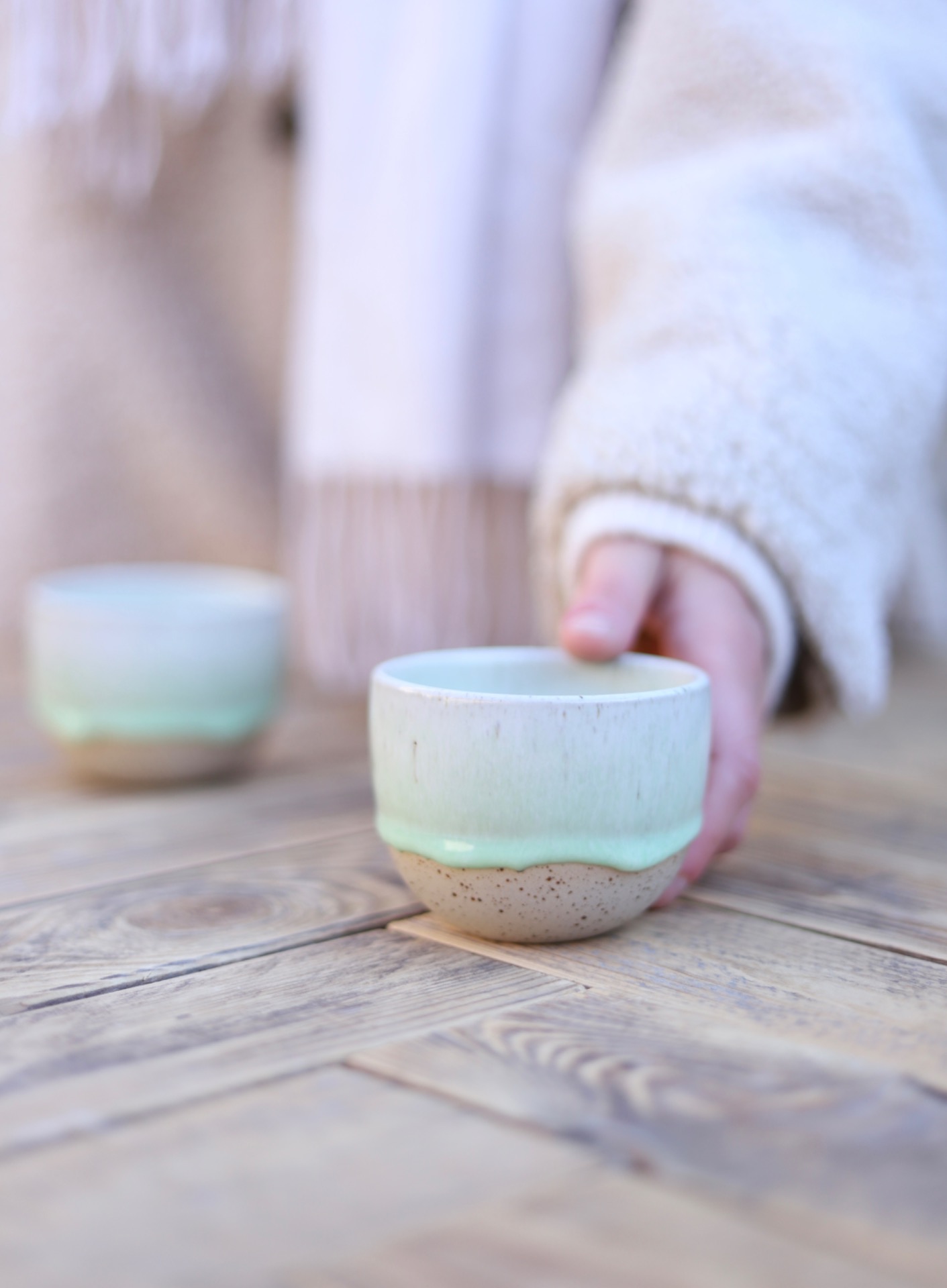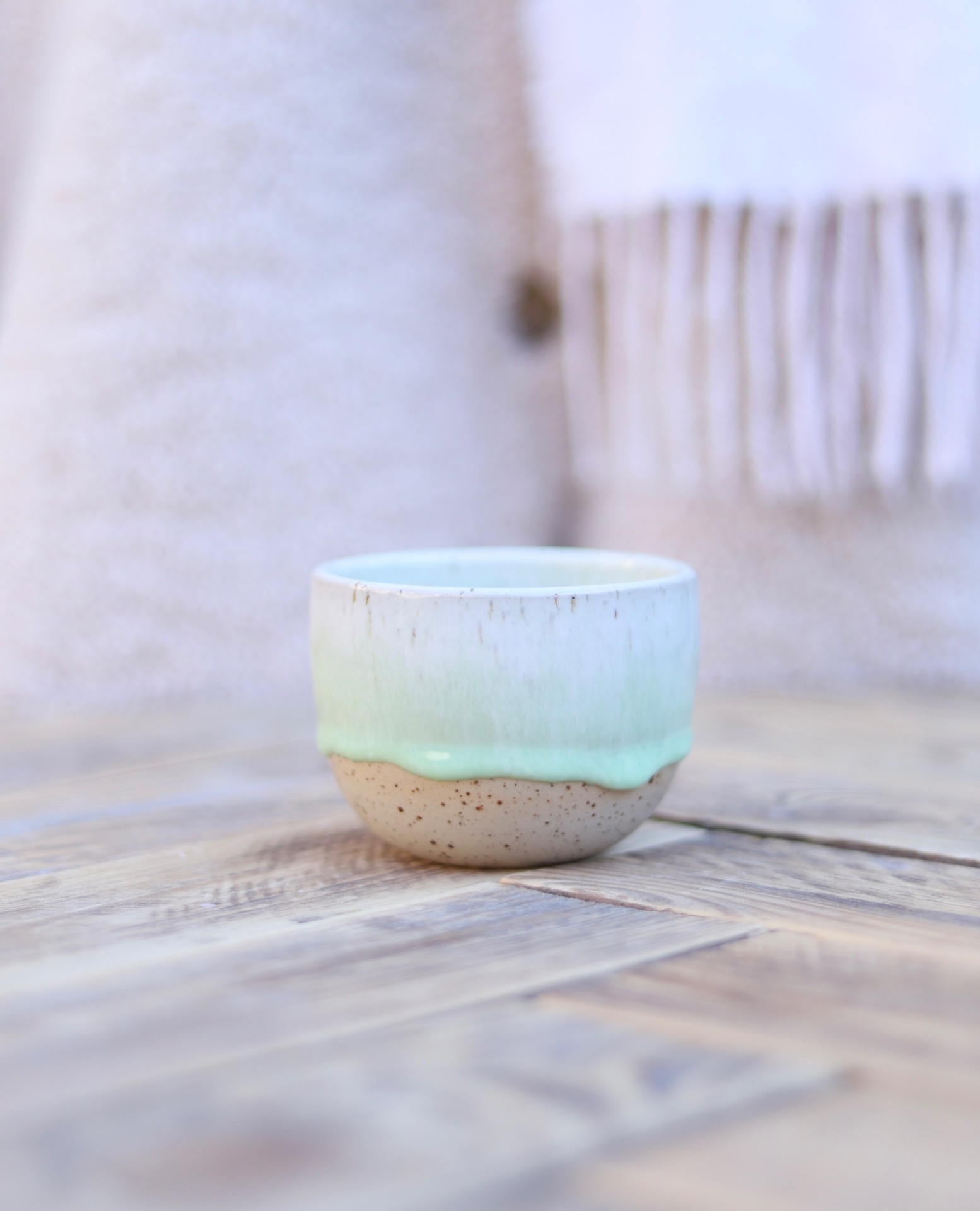Kalíšek na kafe i čaj s objemem cca 160-180ml se světle zelenou glazurou. Je vytočen z tečkované kameniny a vypálen na vysoké teploty.