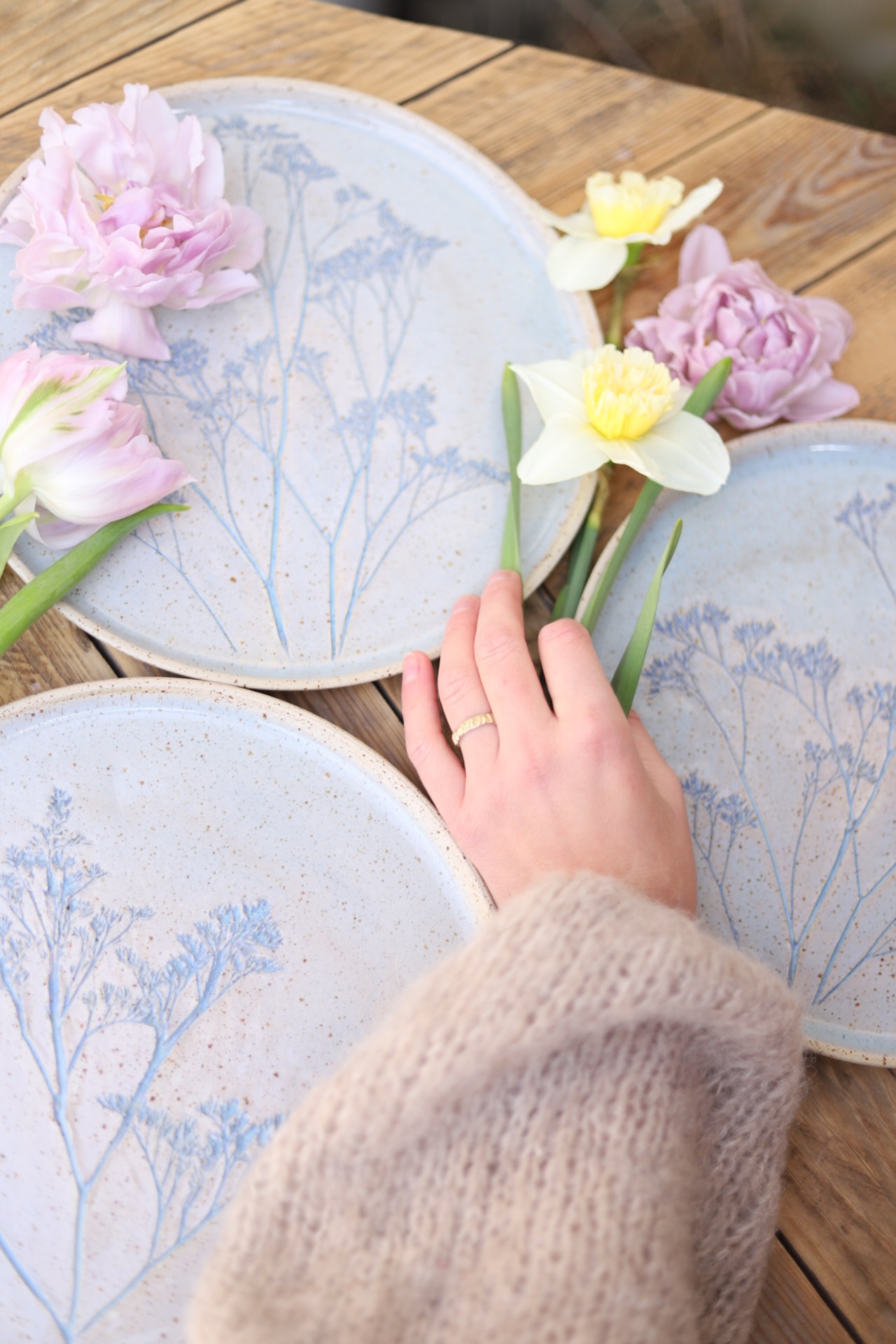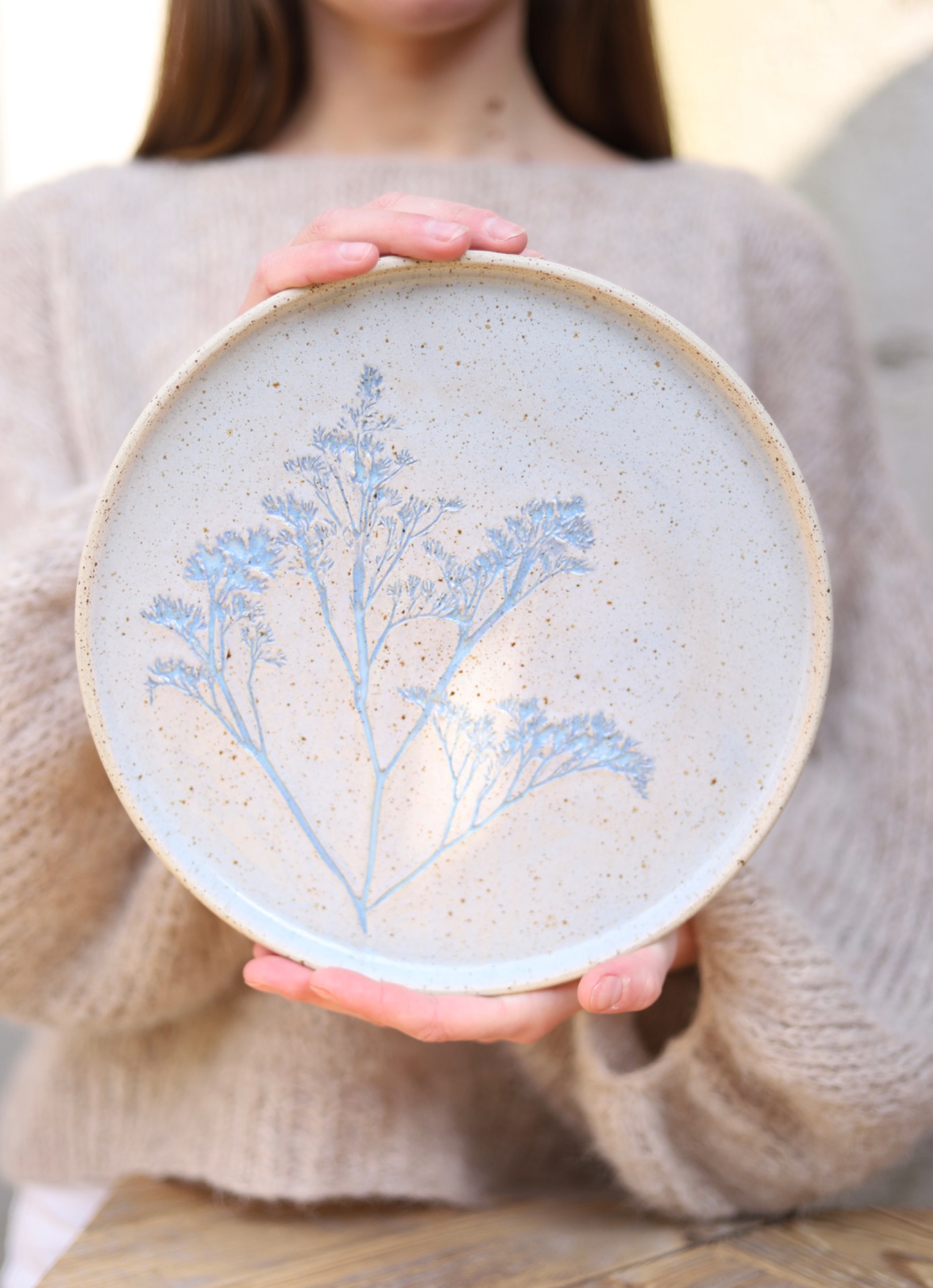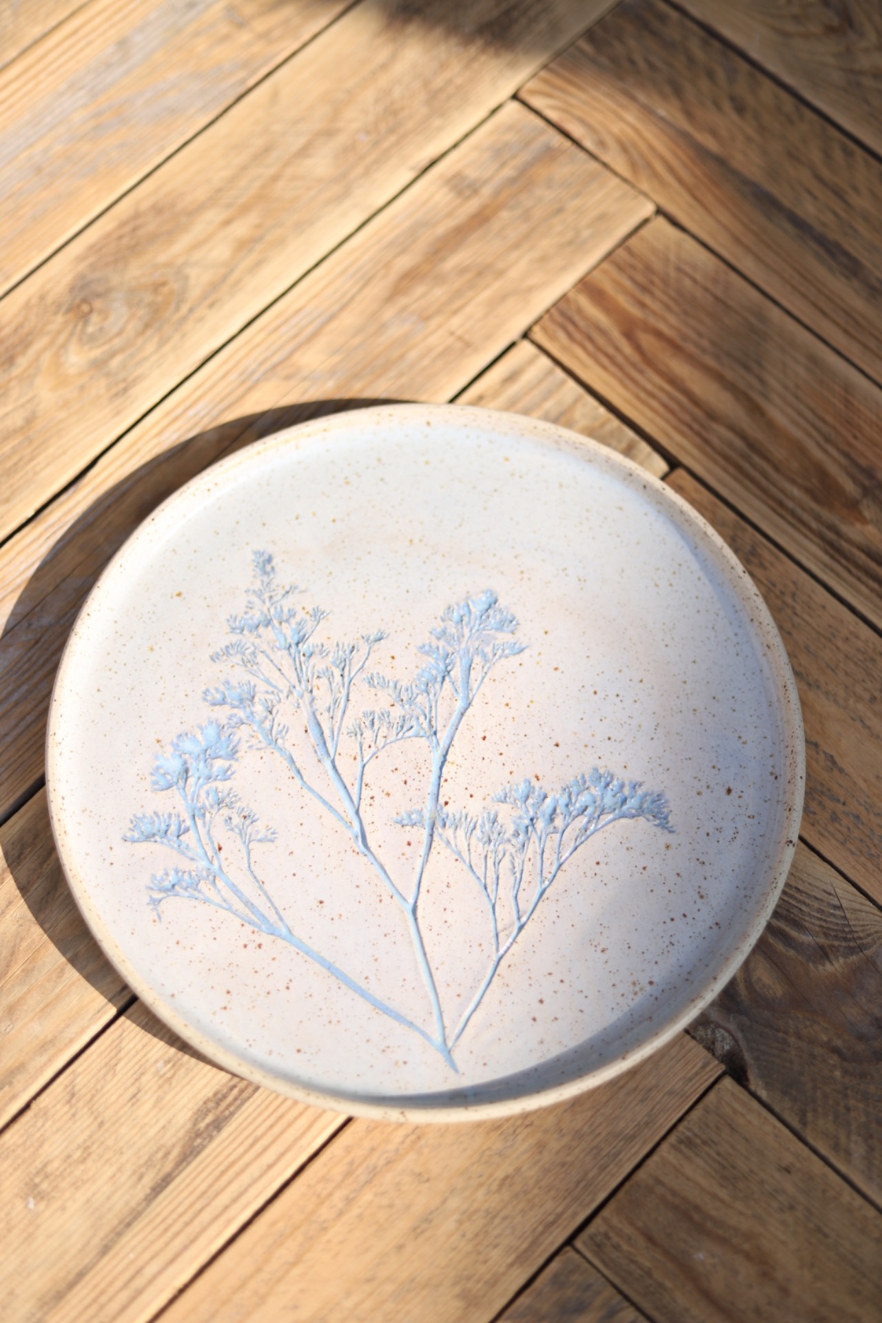 Servírovací talíř s průměrem 25cm s obtisky Limonia. Talíř je vytočený z tečkované kameniny a vypálen na vysoké teploty.