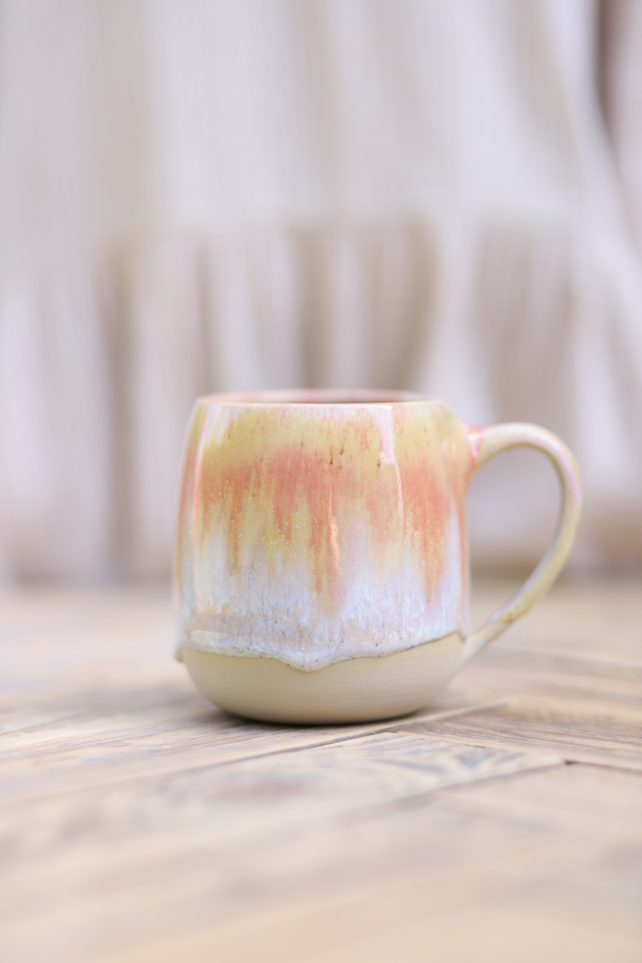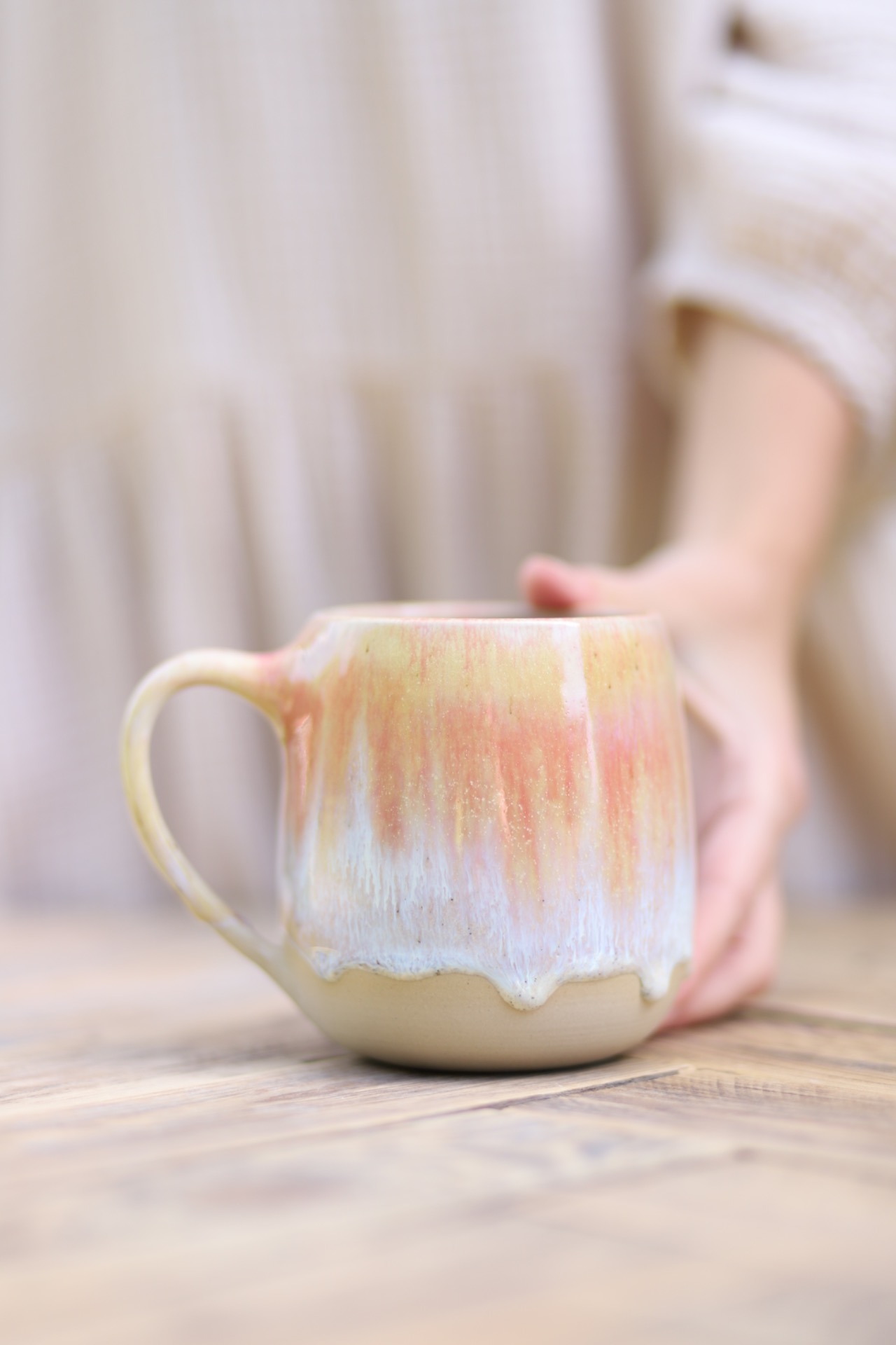 Hrnek na čaj s objemem cca 500-550ml s efektní oranžovou glazurou. Hrnek je vytočen z béžové kameniny a vypálen na vysoké teploty.