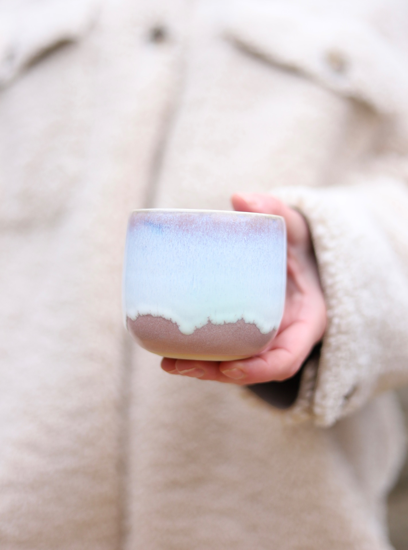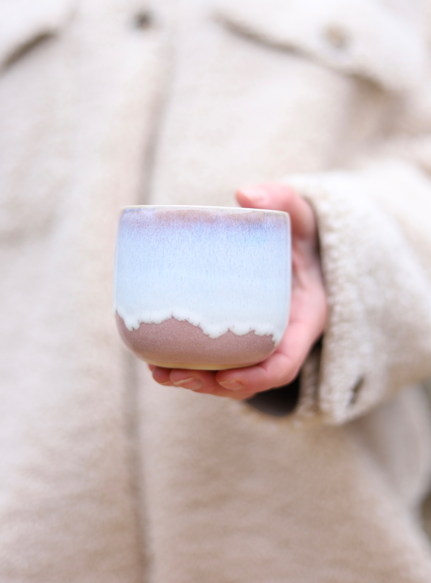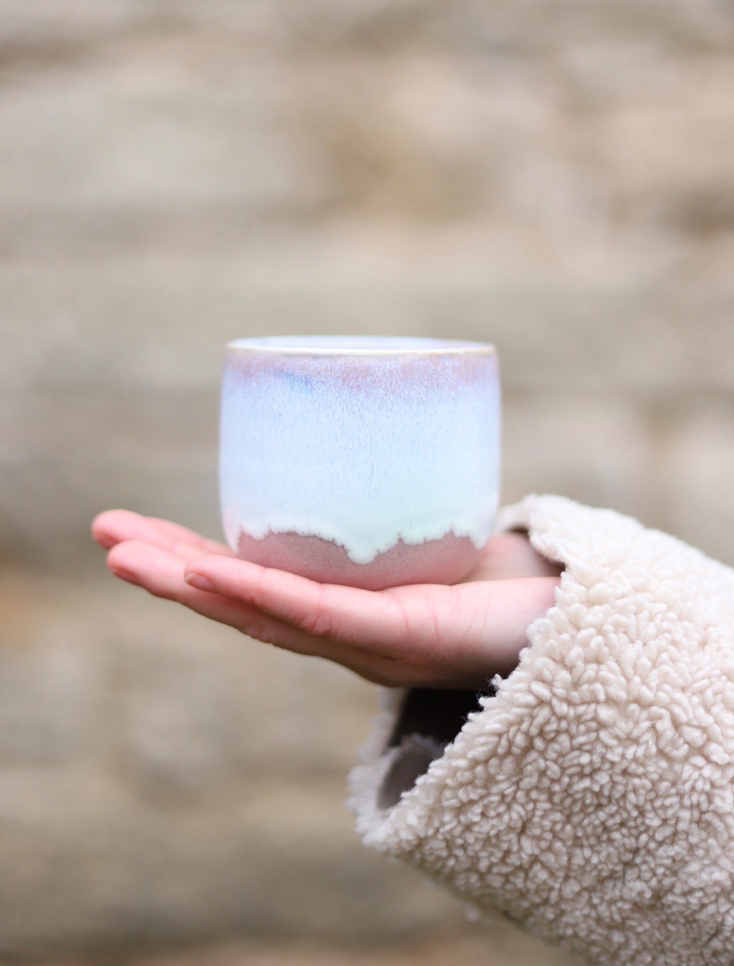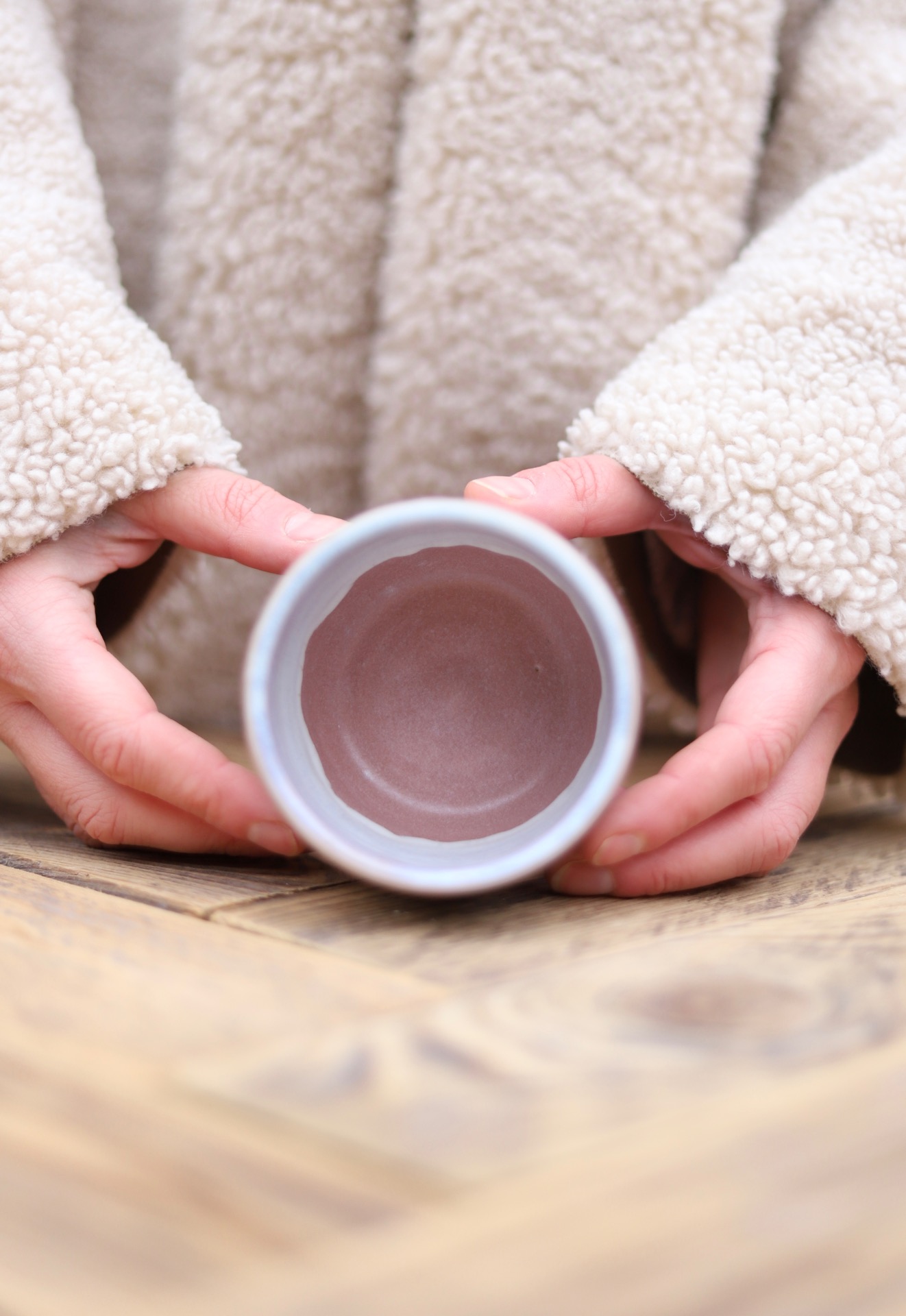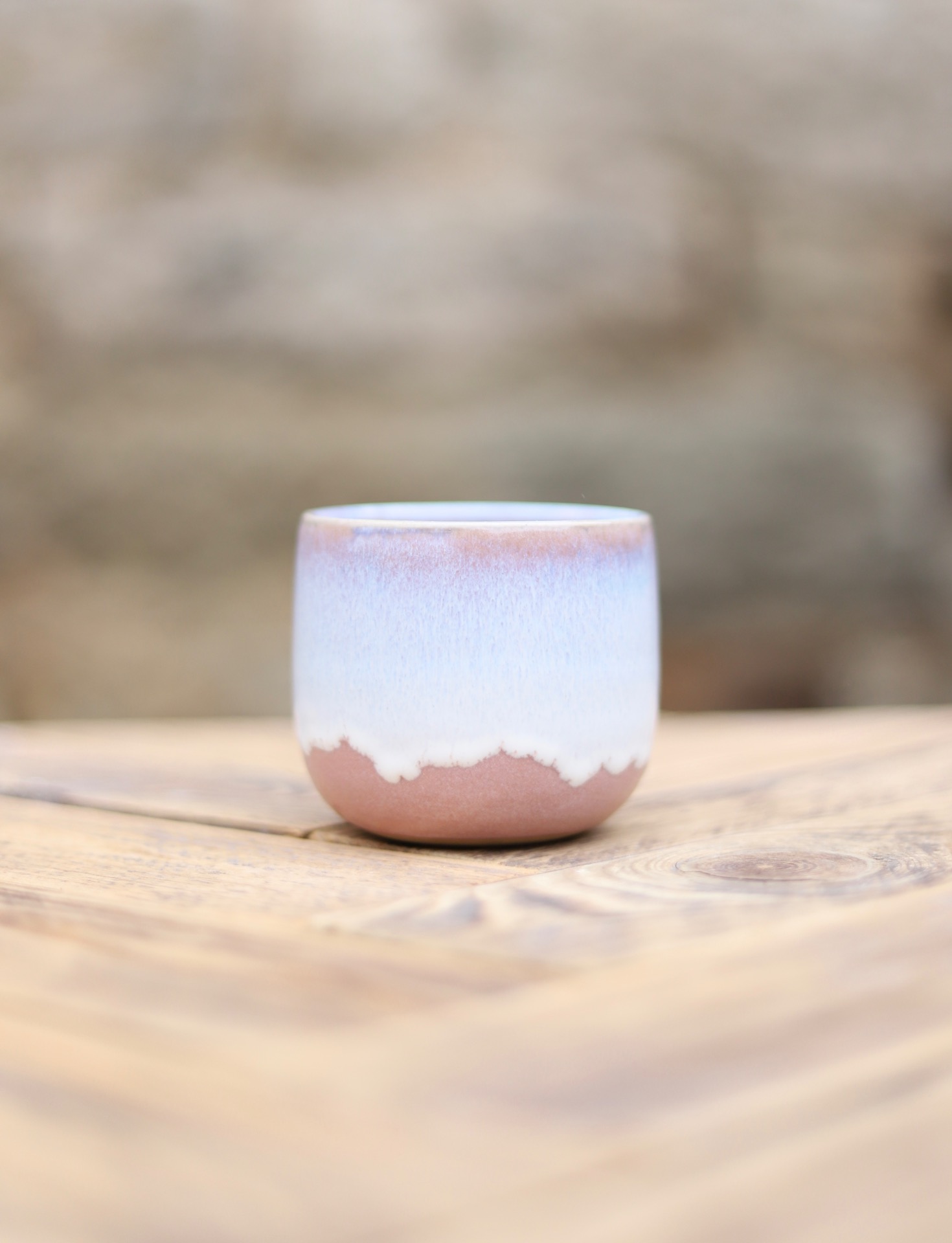 Kalíšek na kafe i čaj s objemem cca 200ml s růžovo-bílou glazurou. Je vytočen z béžové kameniny a vypálen na vysoké teploty.