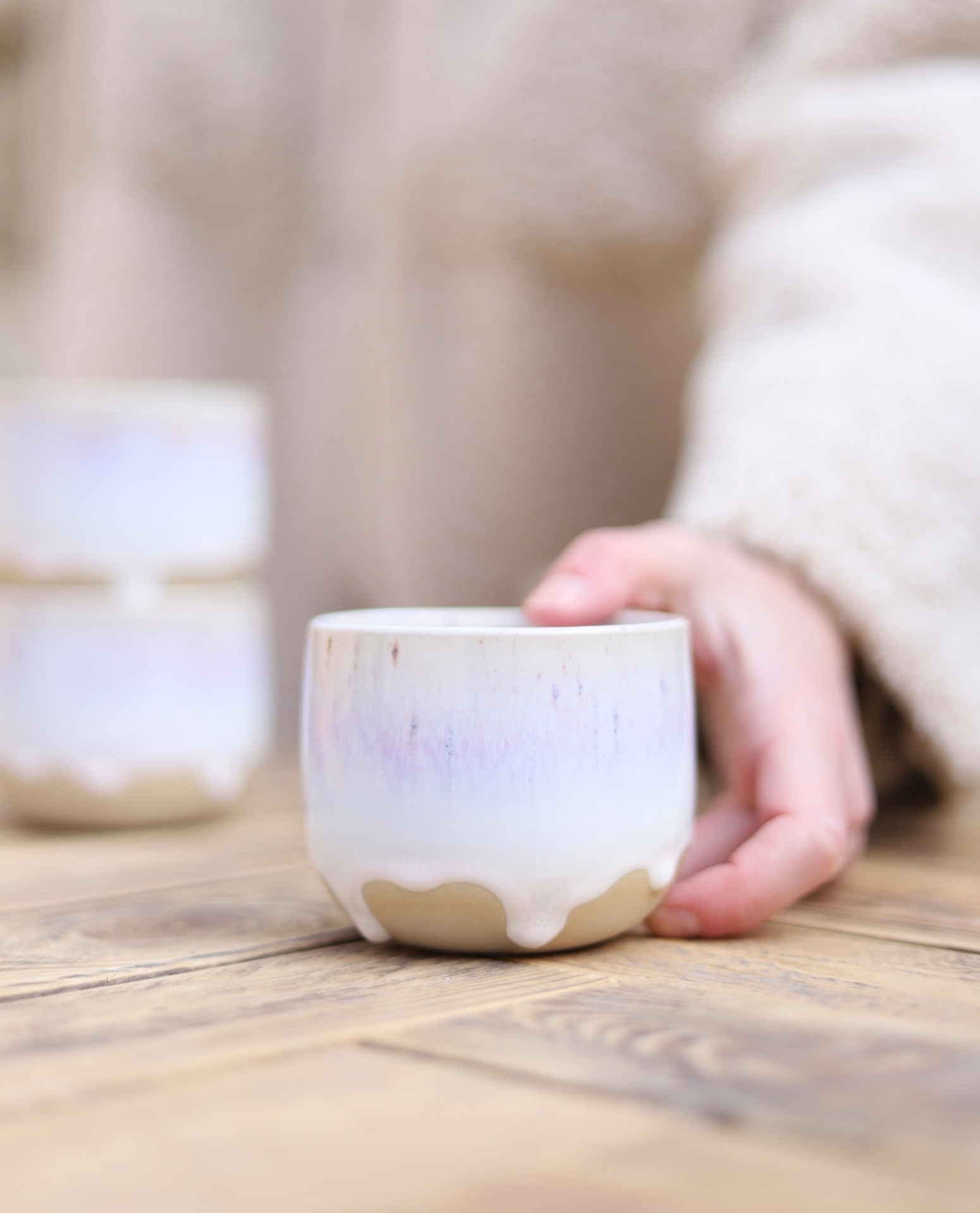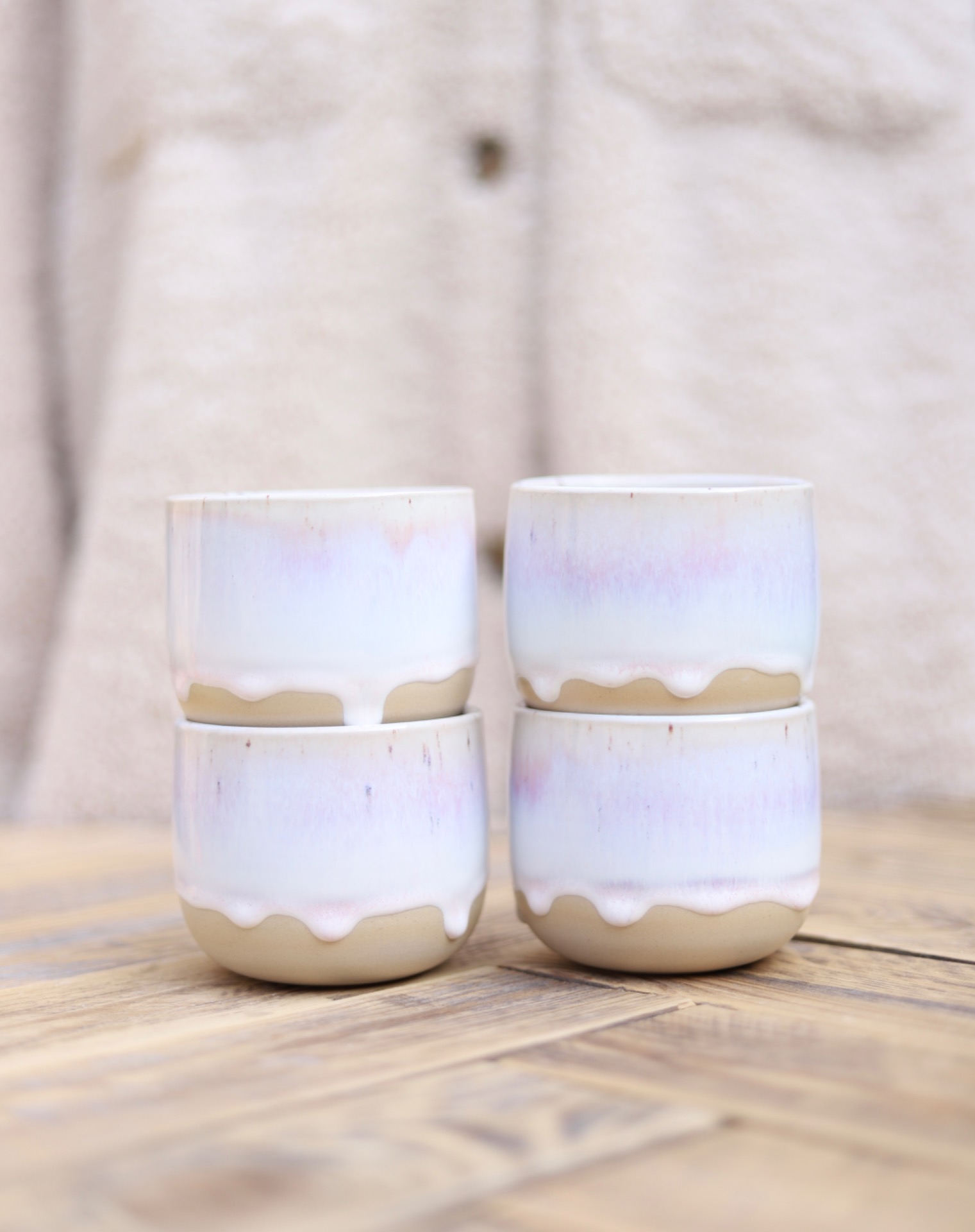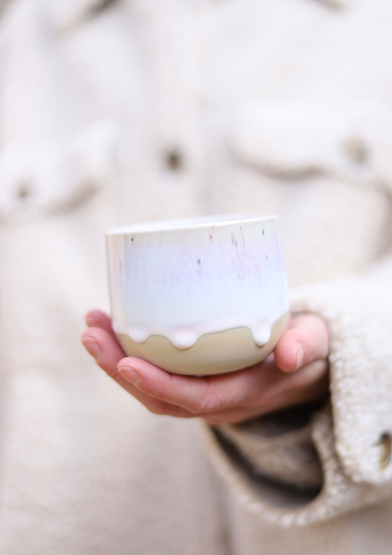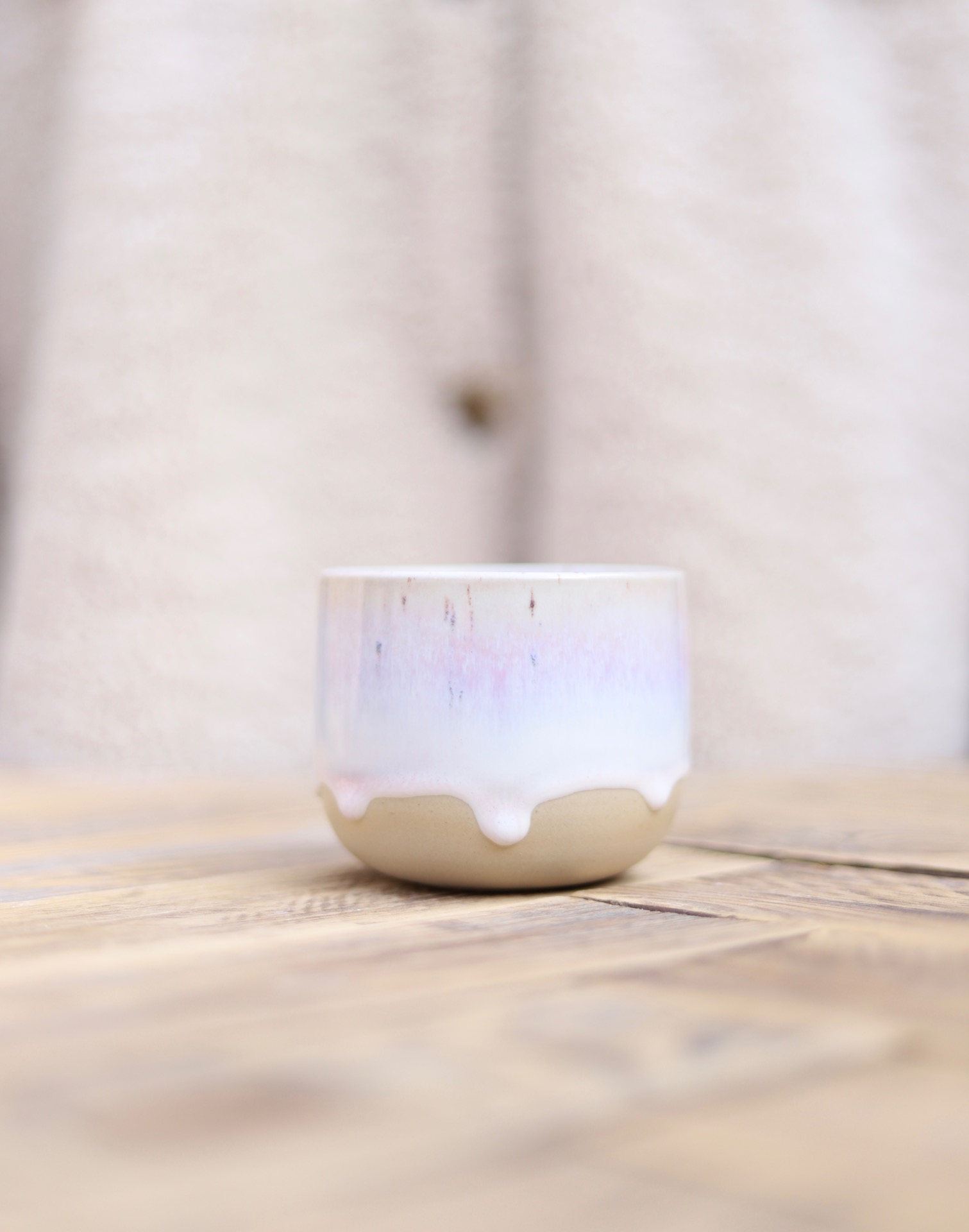 Kalíšek na kafe i čaj s objemem cca 230-250ml s bílo-růžovou glazurou. Je vytočen z béžové kameniny a vypálen na vysoké teploty.