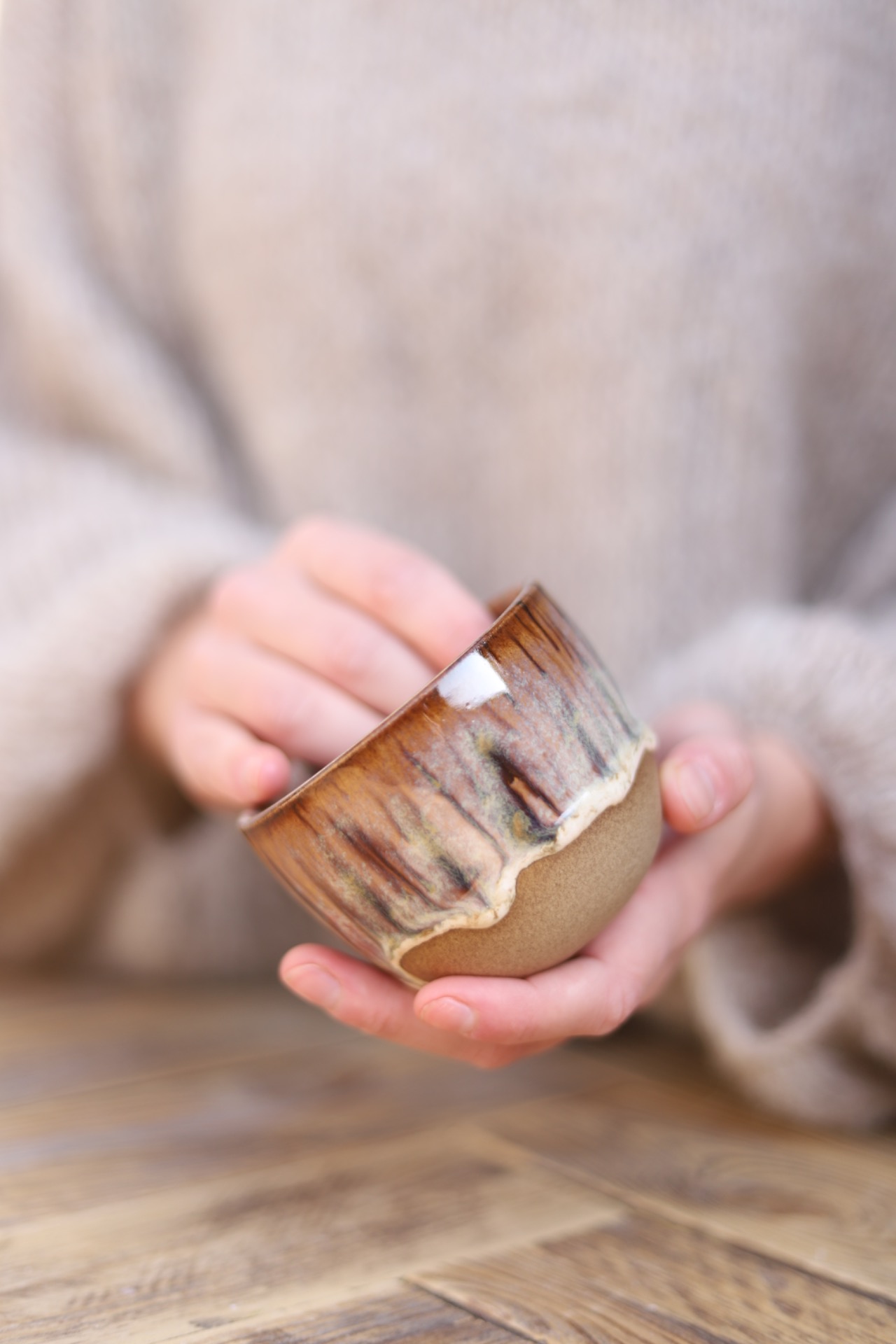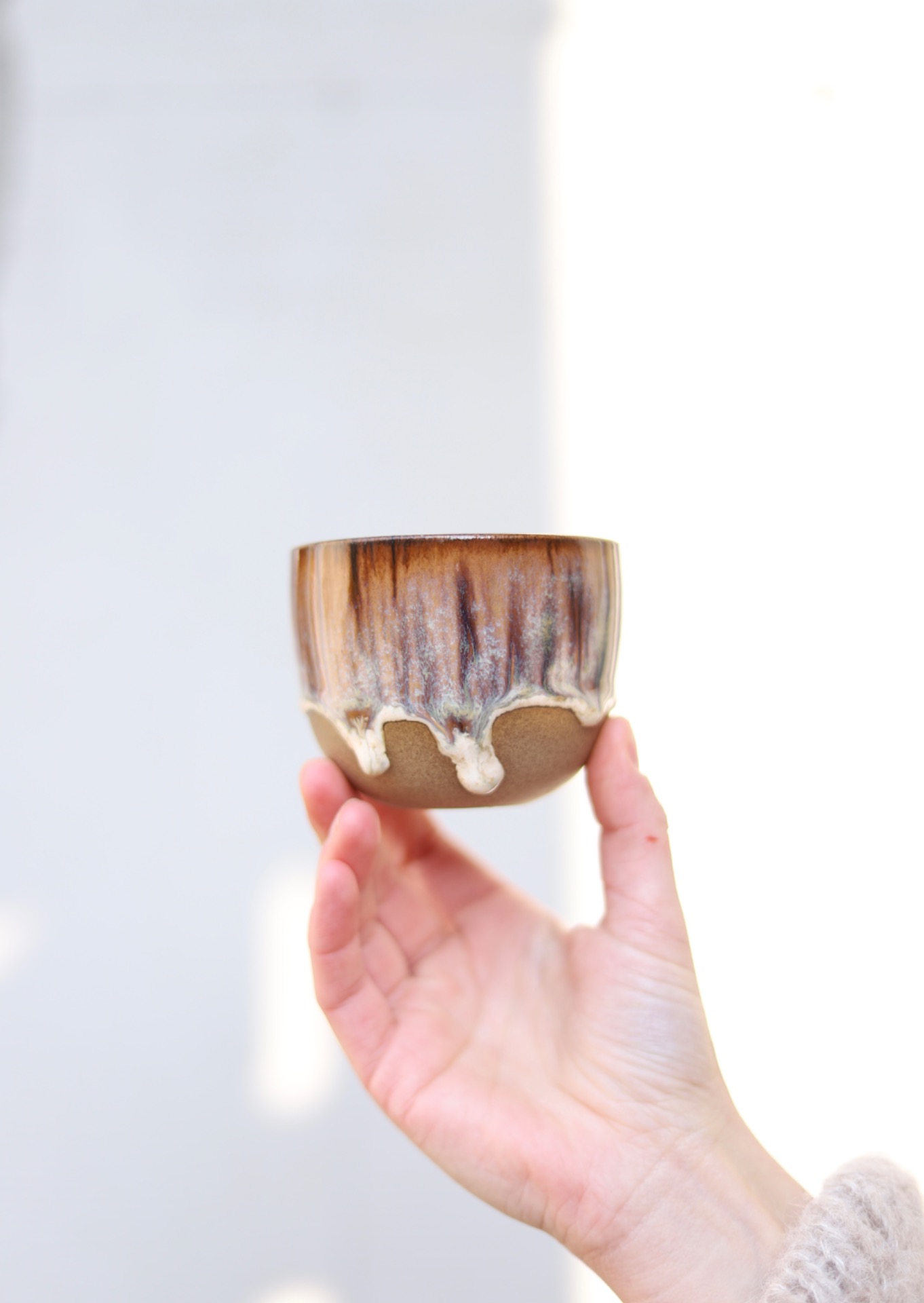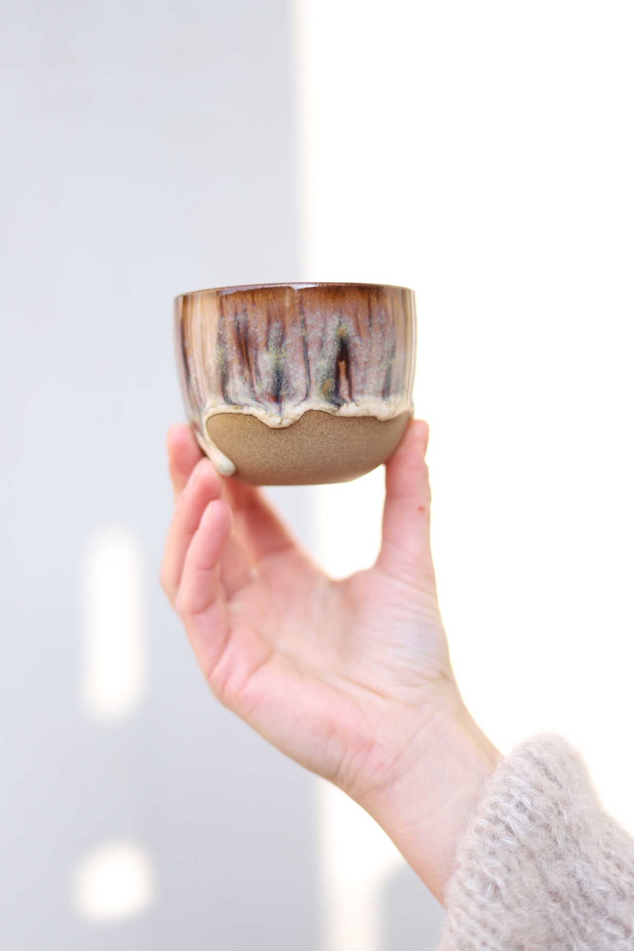 Kalíšek na kafe i čaj s objemem cca 180ml s efektní hnědou glazurou. Kalíšek je vytočen z hnědé kameniny a vypálen na vysoké teploty.