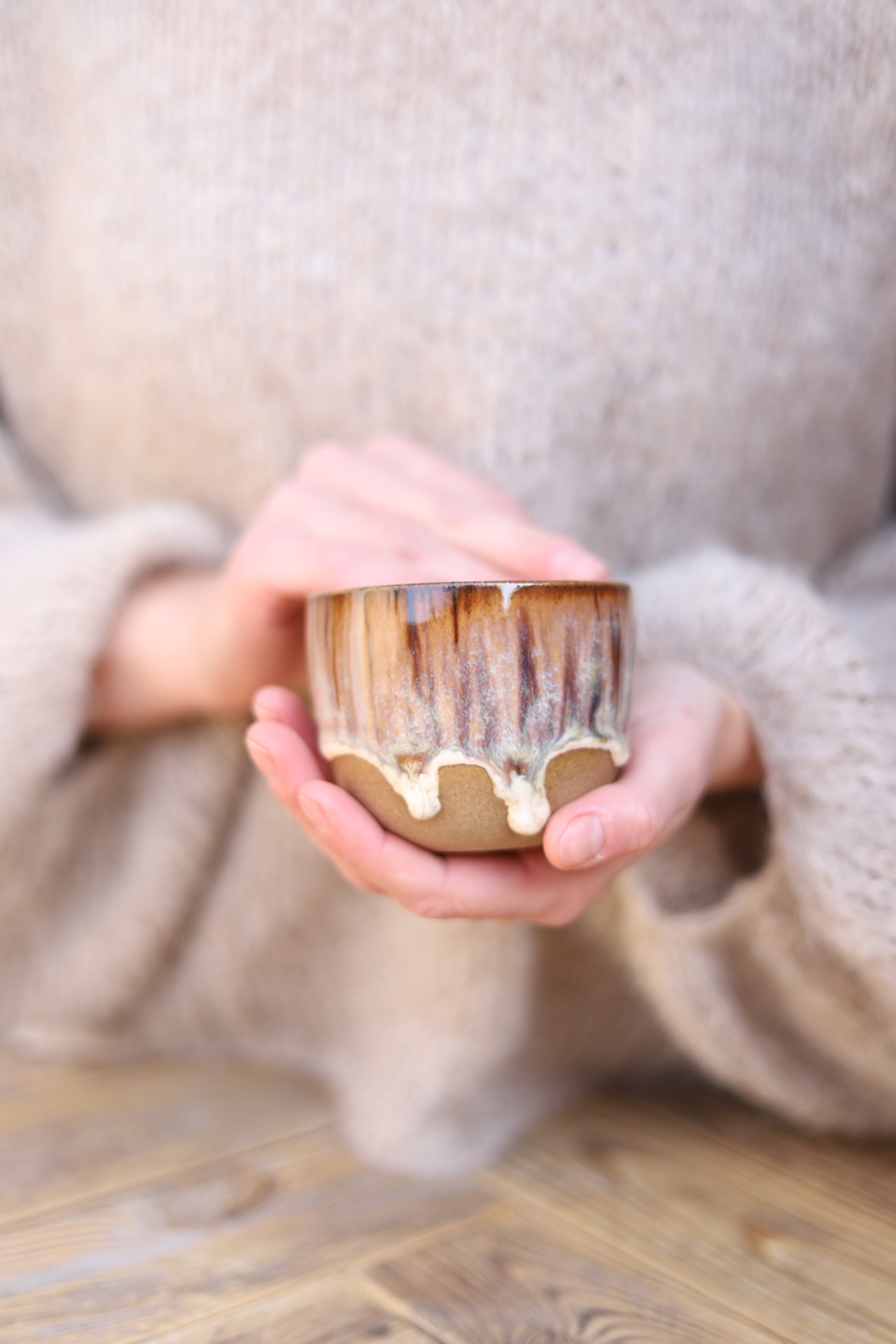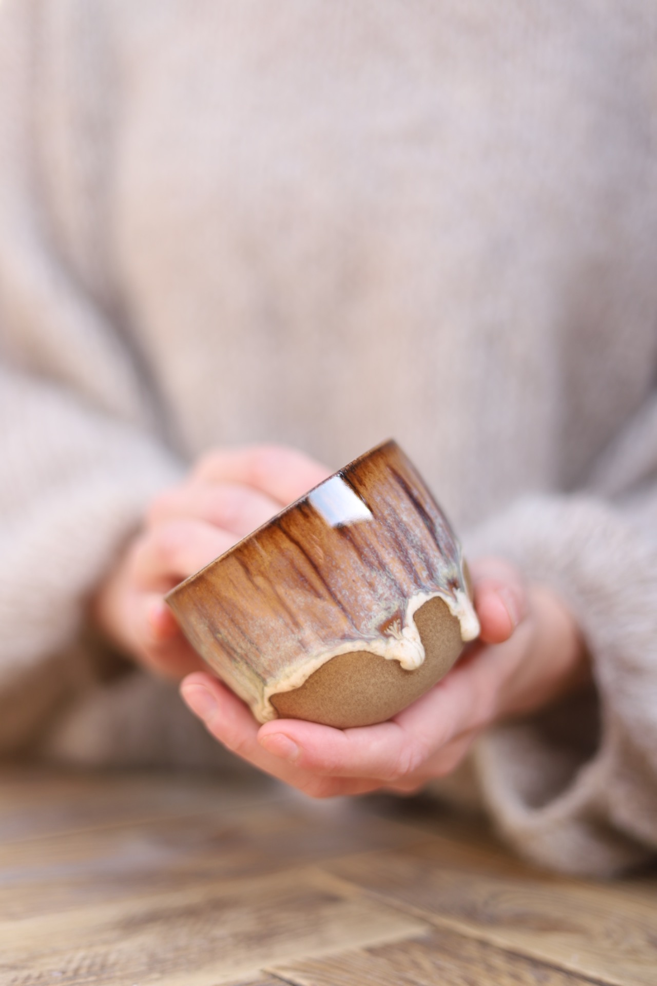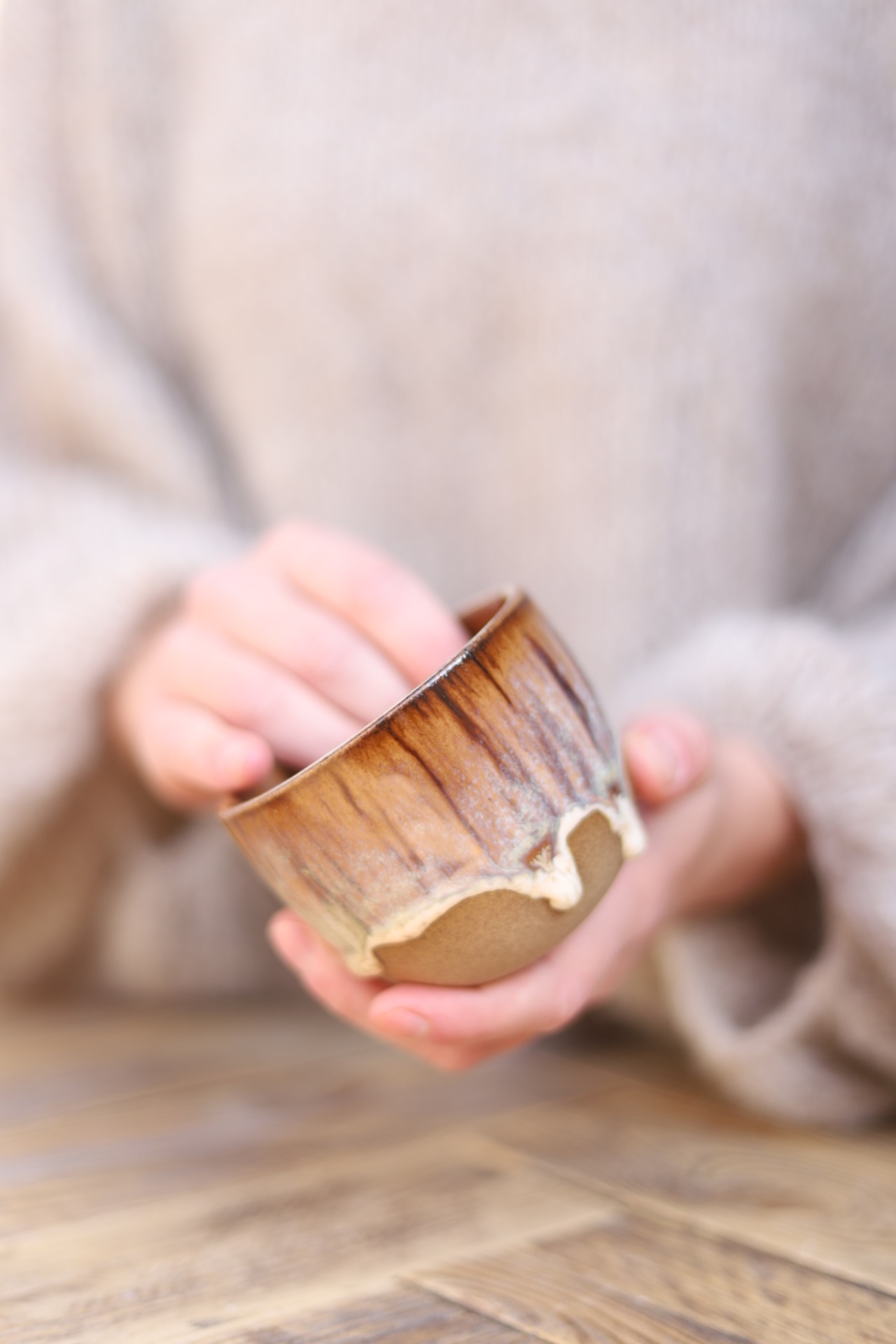 Kalíšek na kafe i čaj s objemem cca 180ml s efektní hnědou glazurou. Kalíšek je vytočen z hnědé kameniny a vypálen na vysoké teploty.
