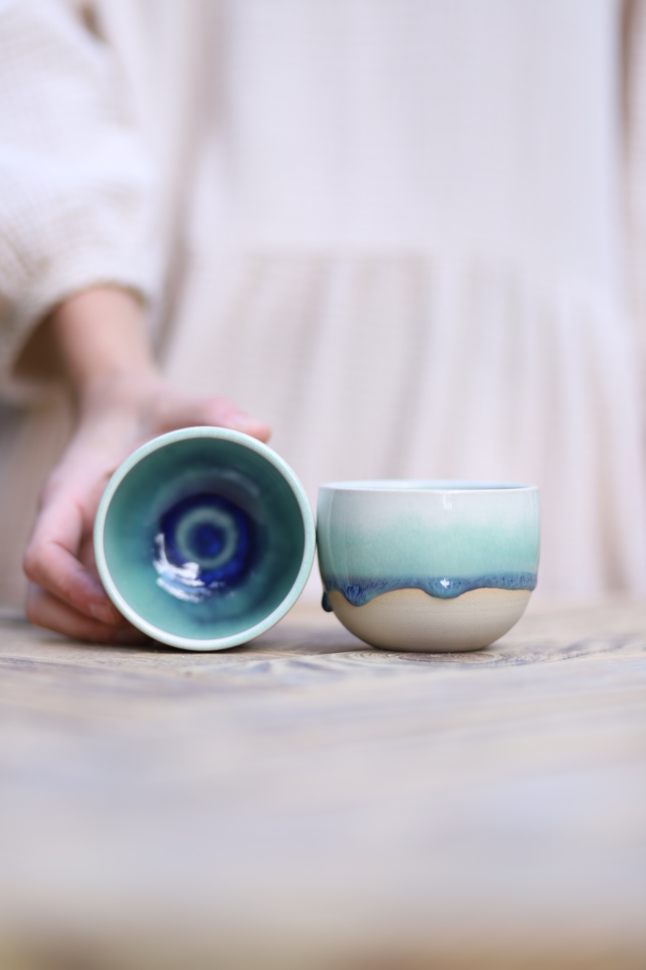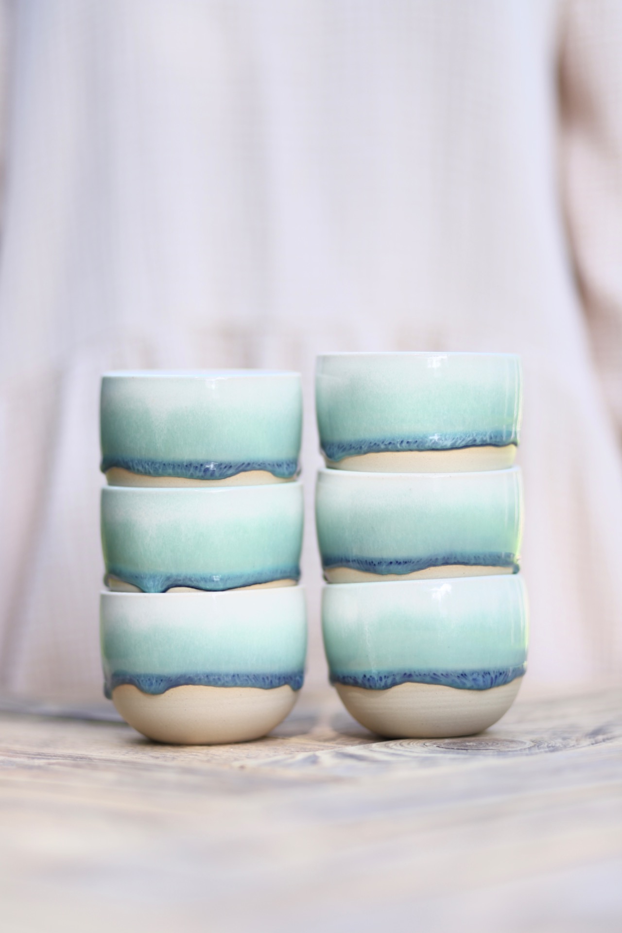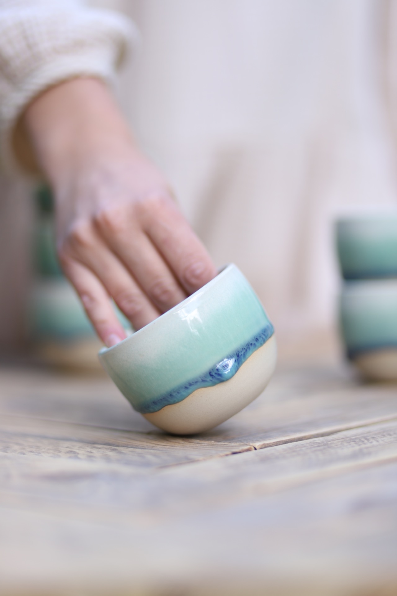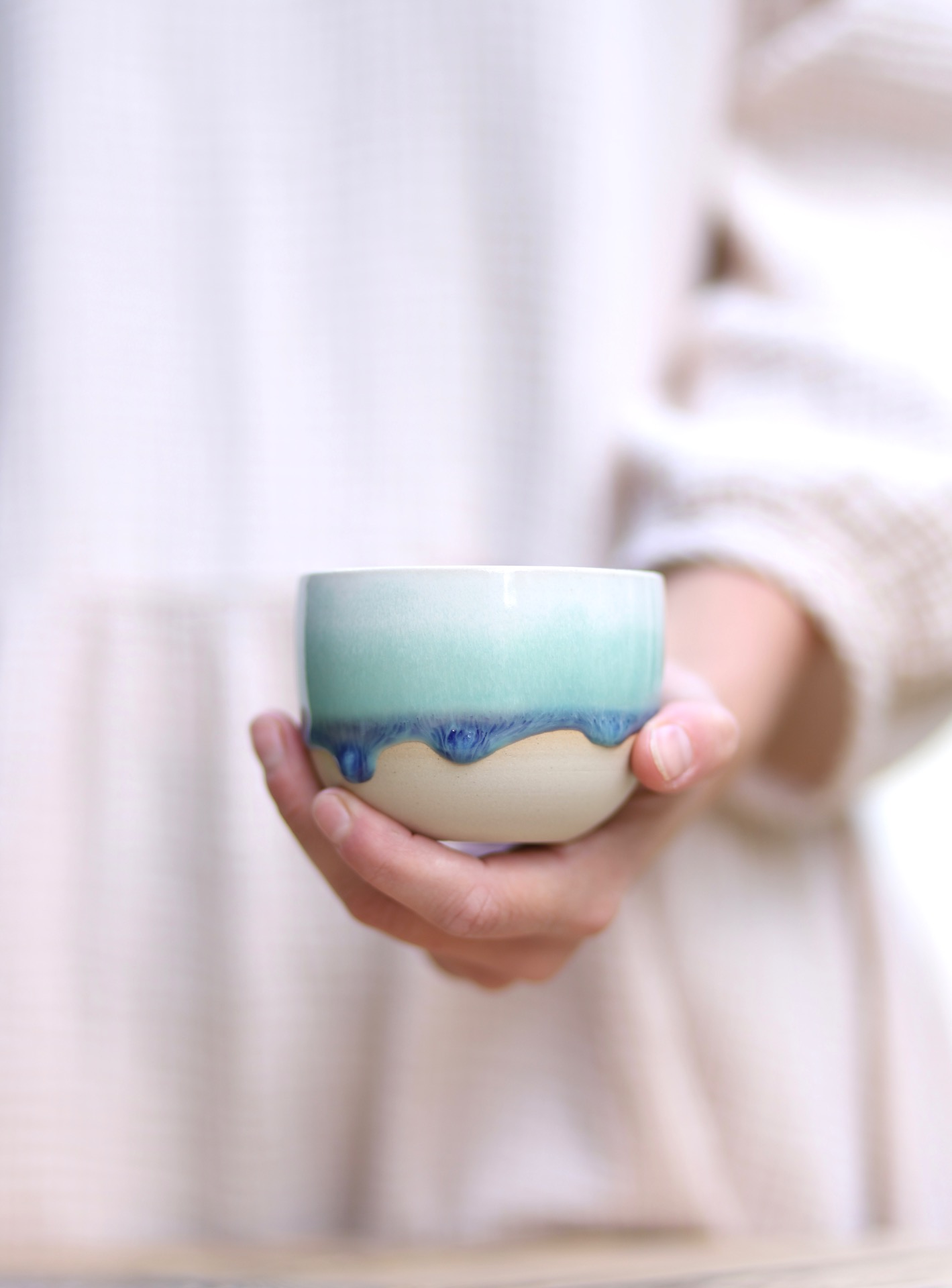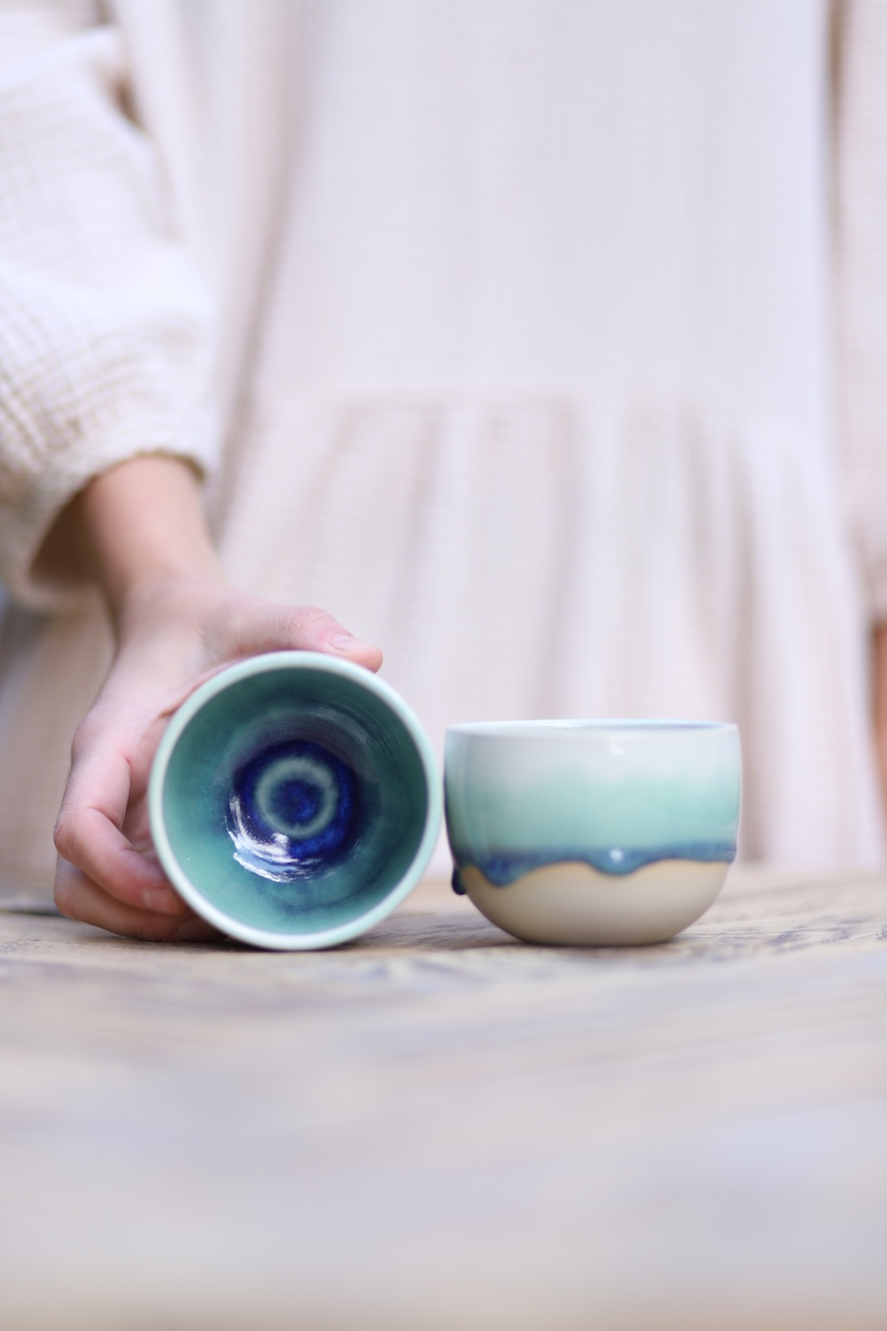 Kalíšek na kafe i čaj s objemem cca 160-180ml s bílo-modrou glazurou. Kalíšek je vytočen z jemné kameniny a vypálen na vysoké teploty.