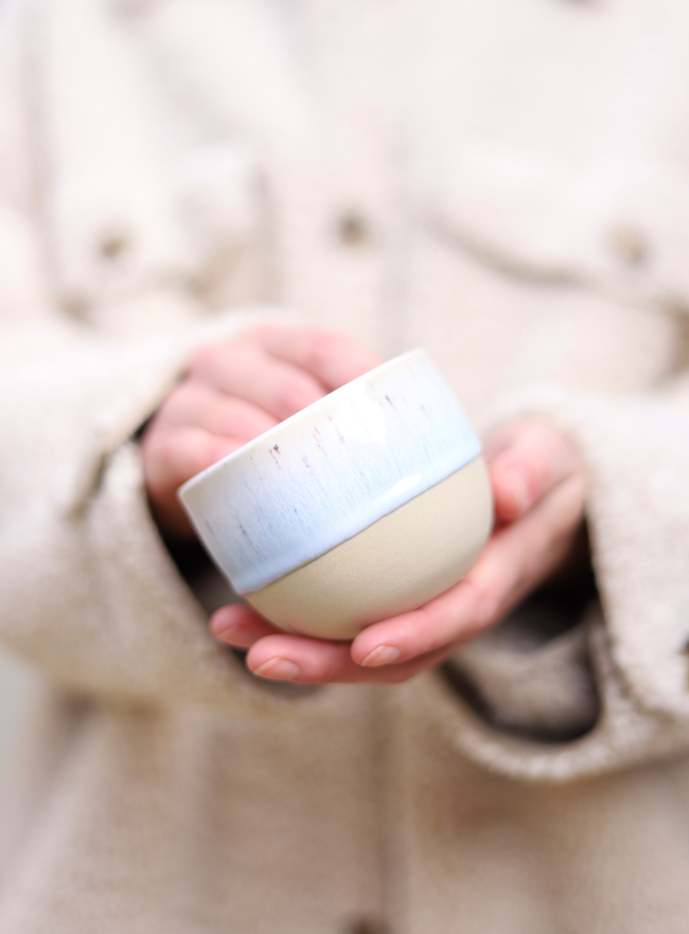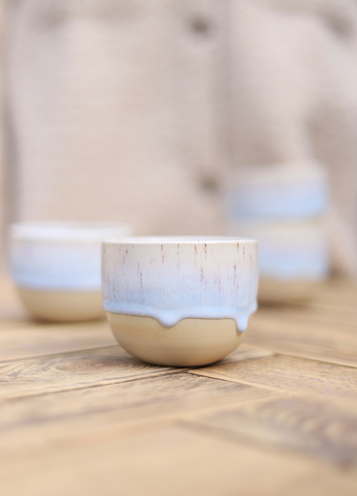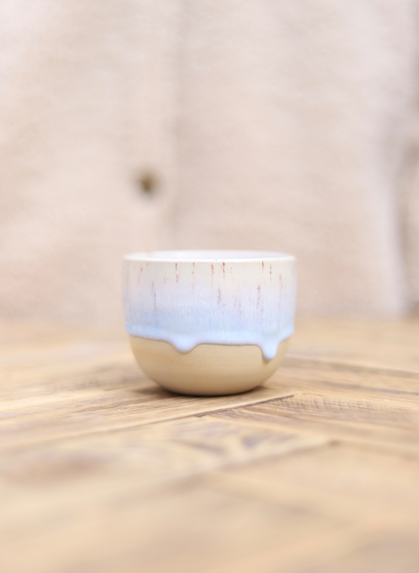 Kalíšek na kafe i čaj s objemem cca 180ml s modro-bílou glazurou. Kalíšek je vytočen z jemné kameniny a vypálen na vysoké teploty.