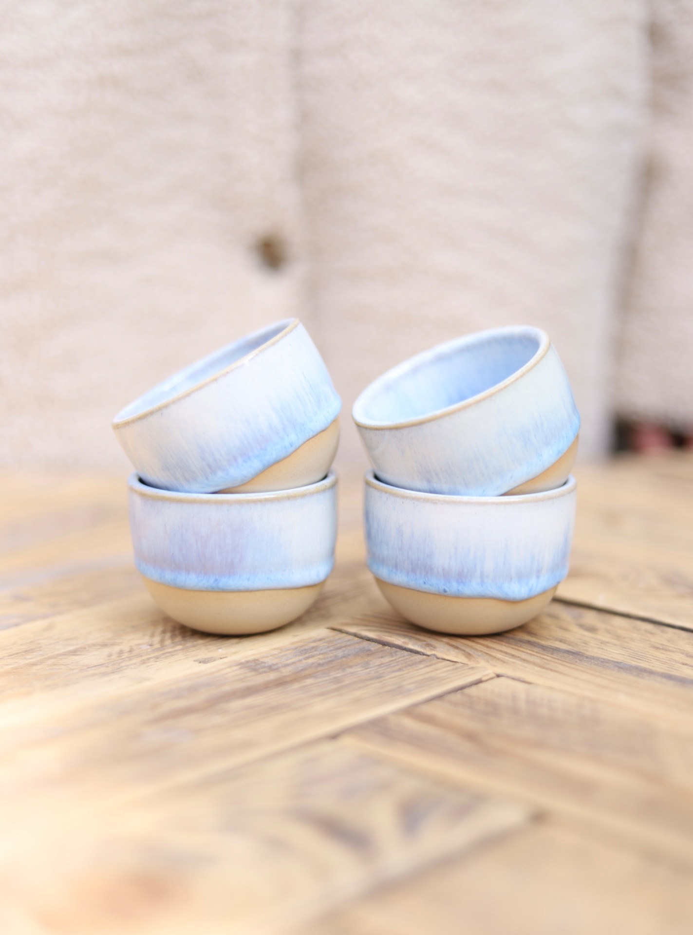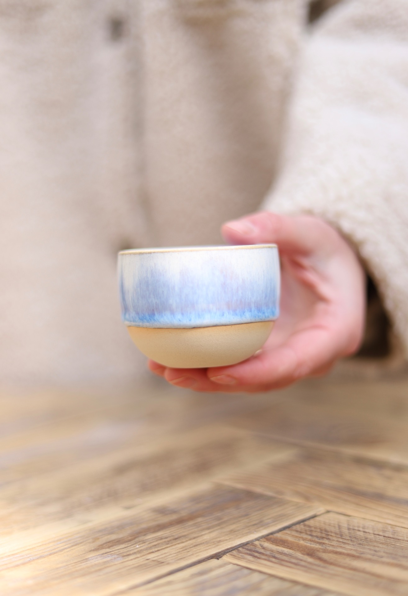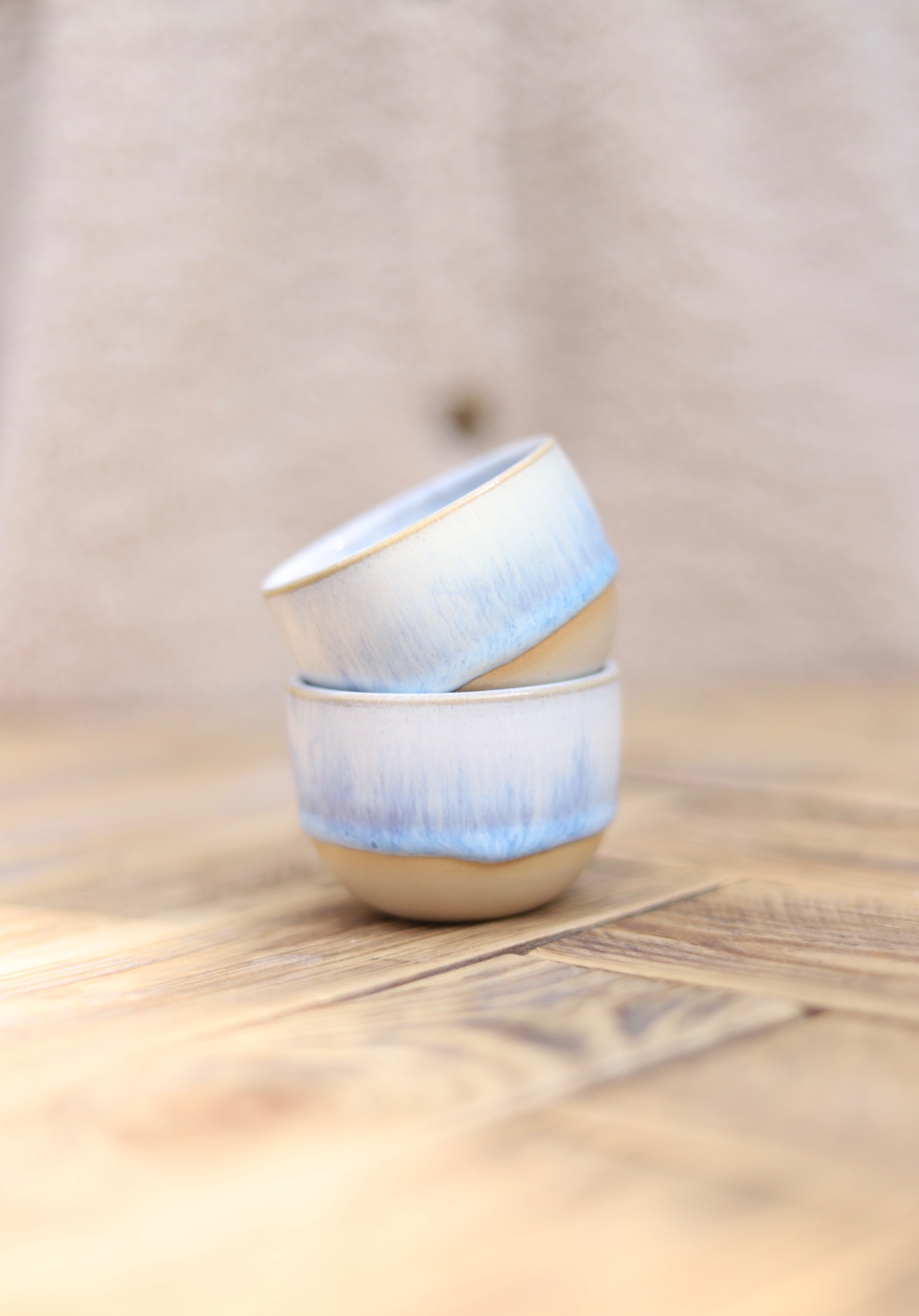 Kalíšek na espresso s objemem cca 90ml se světlou modrou glazurou. Kalíšek je vytočen z béžové kameniny a vypálen na vysoké teploty.
