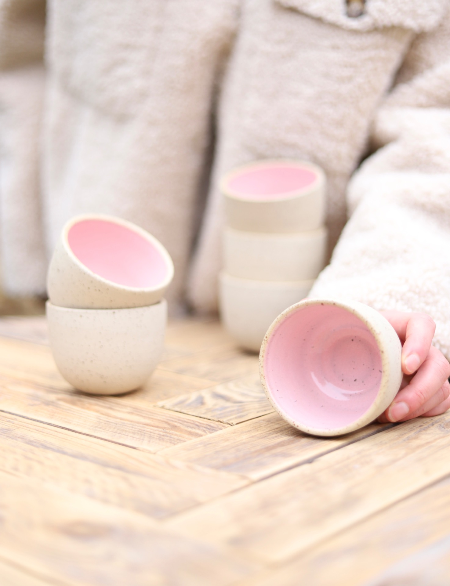 Kalíšek na kafe i čaj s objemem cca 160-180ml s krémově růžovou glazurou. Je vytočen z tečkované kameniny a vypálen na vysoké teploty.