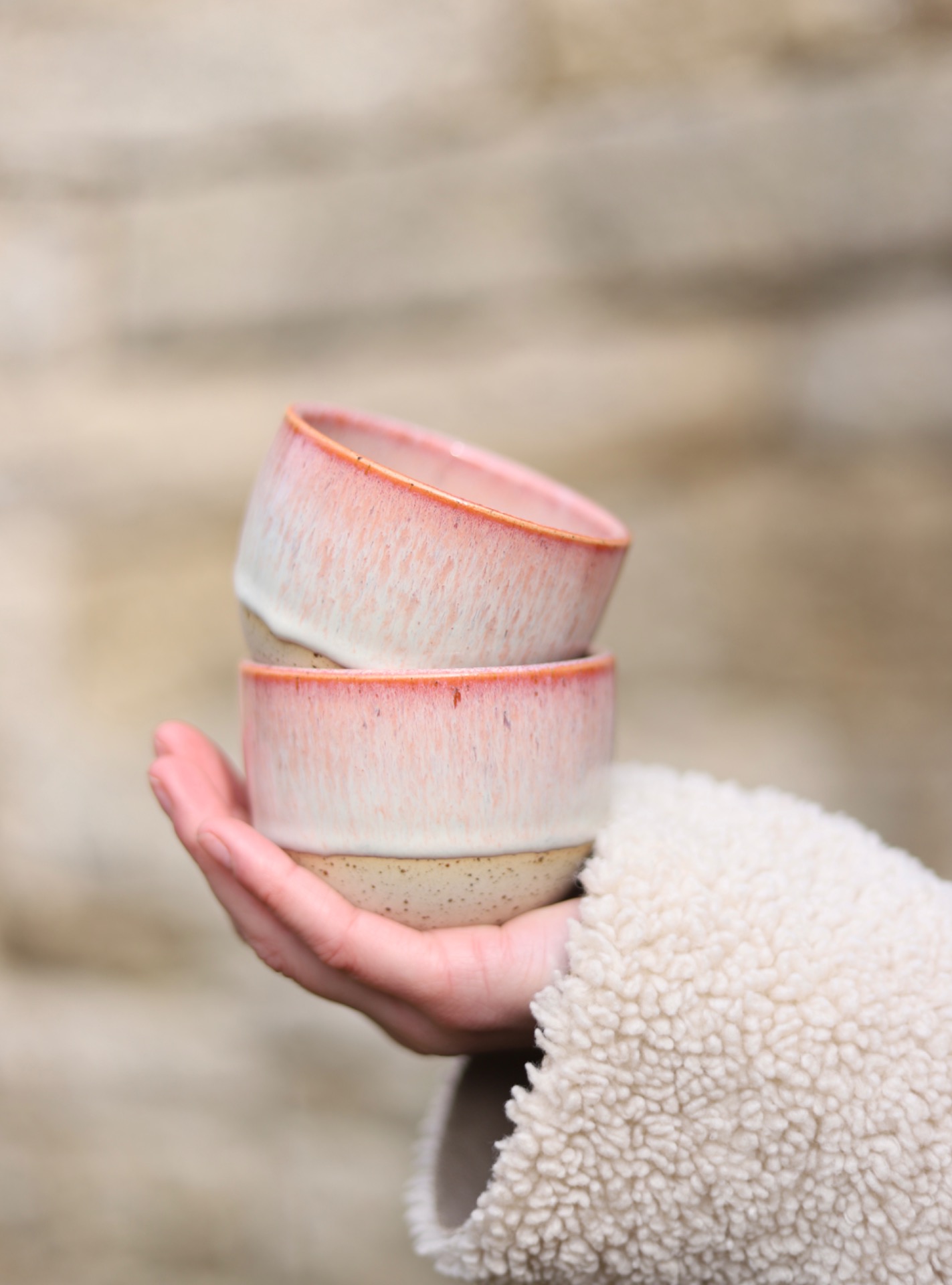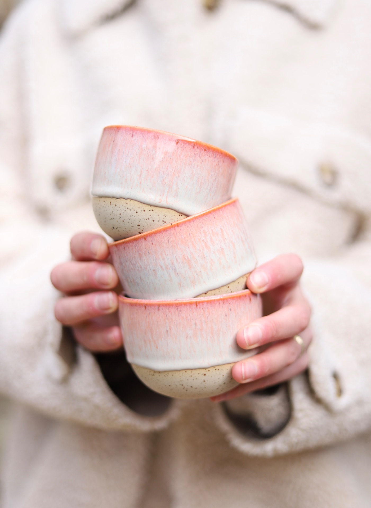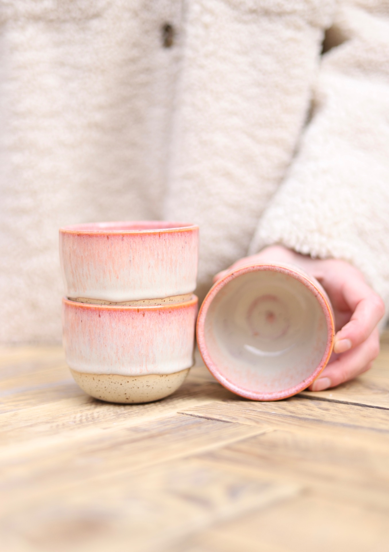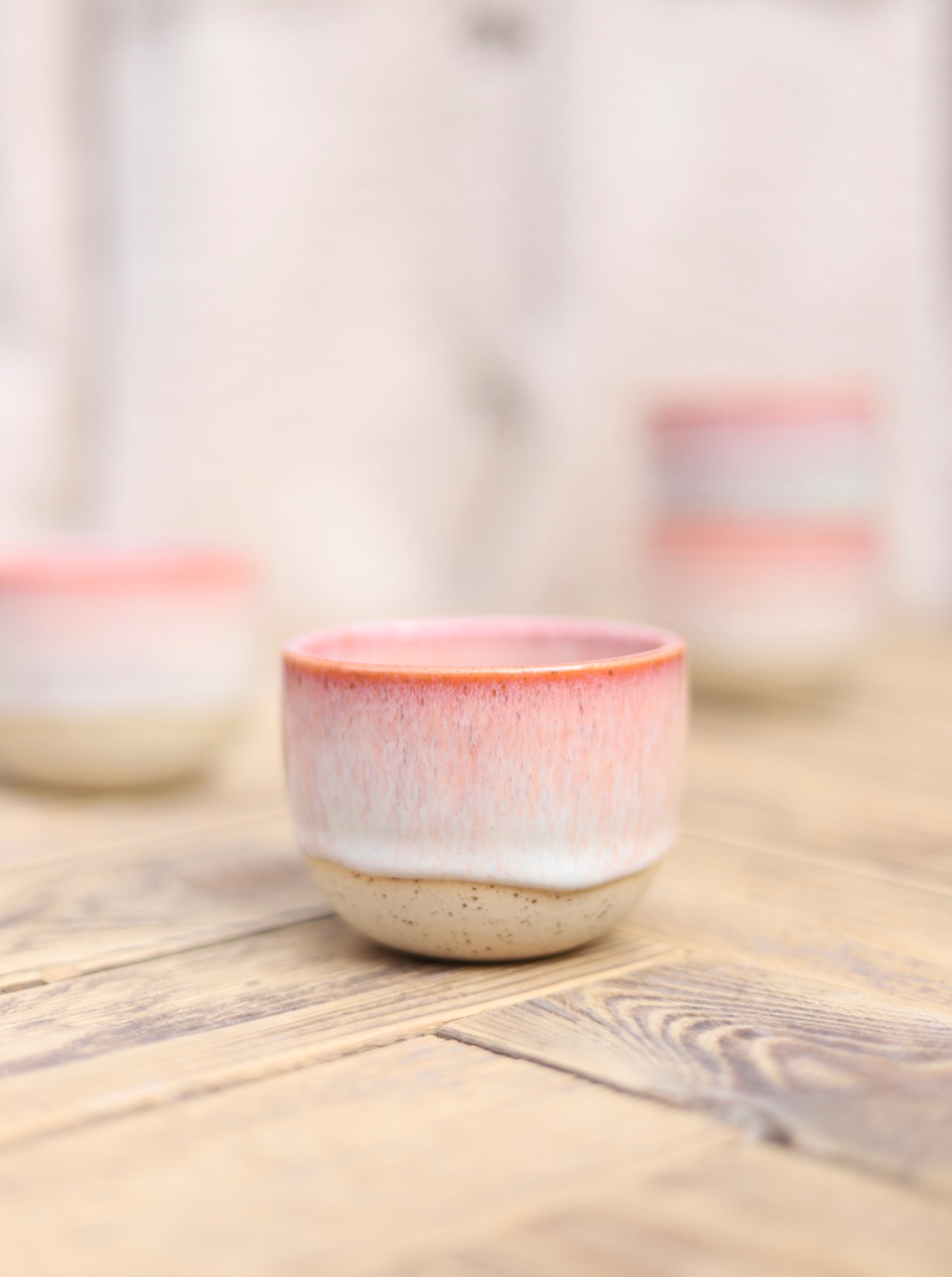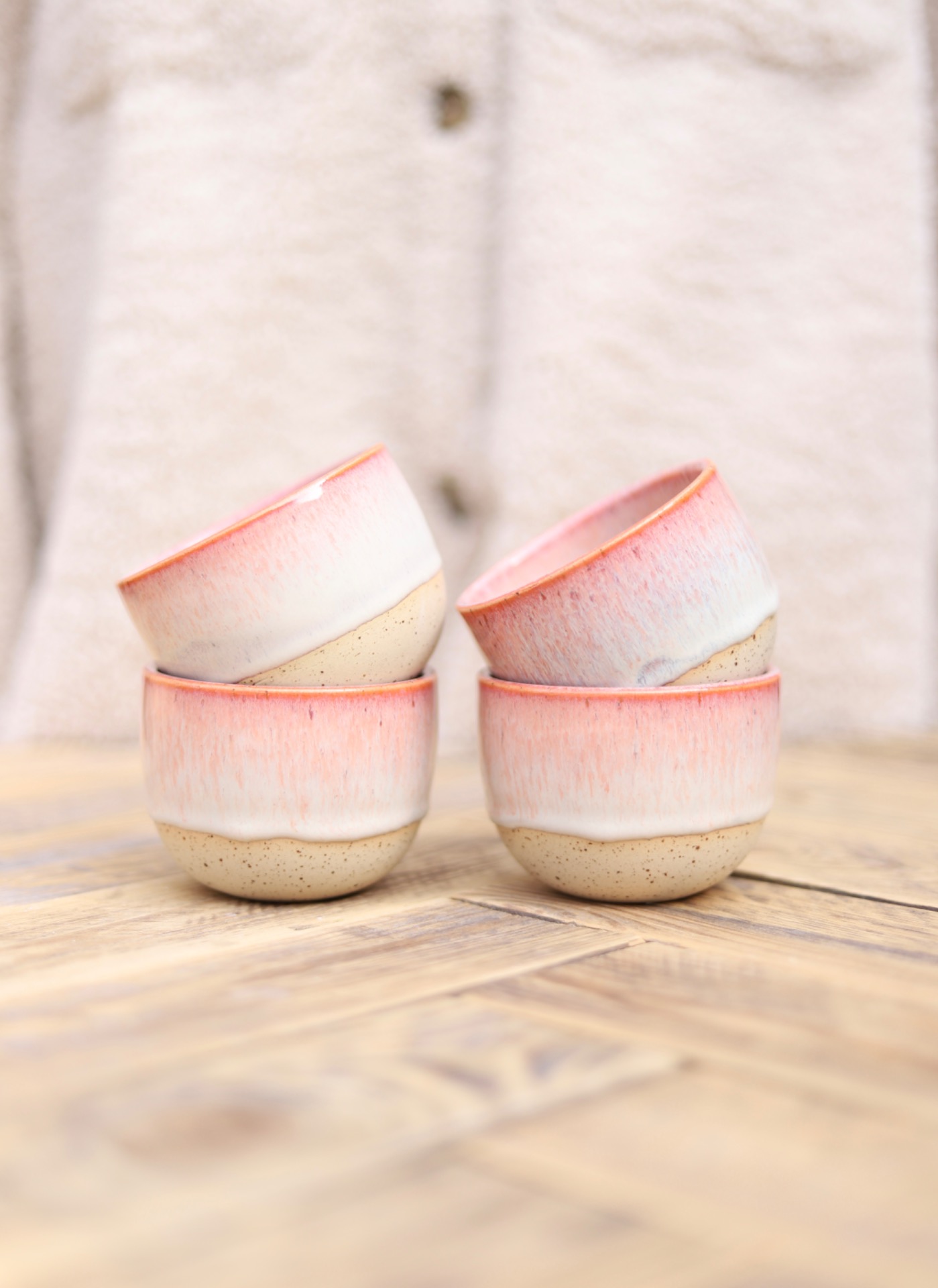 Kalíšek na kafe i čaj s objemem cca 180-200ml s krémově růžovou glazurou. Je vytočen z tečkované kameniny a vypálen na vysoké teploty.