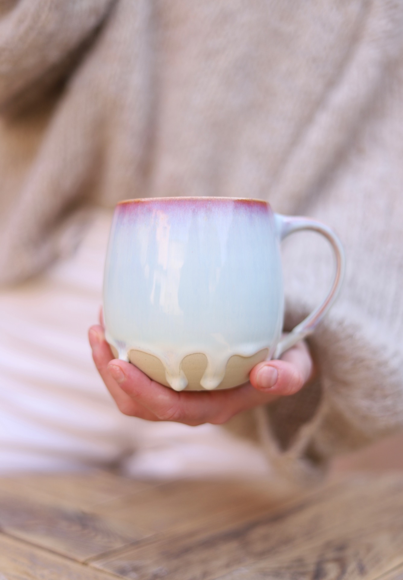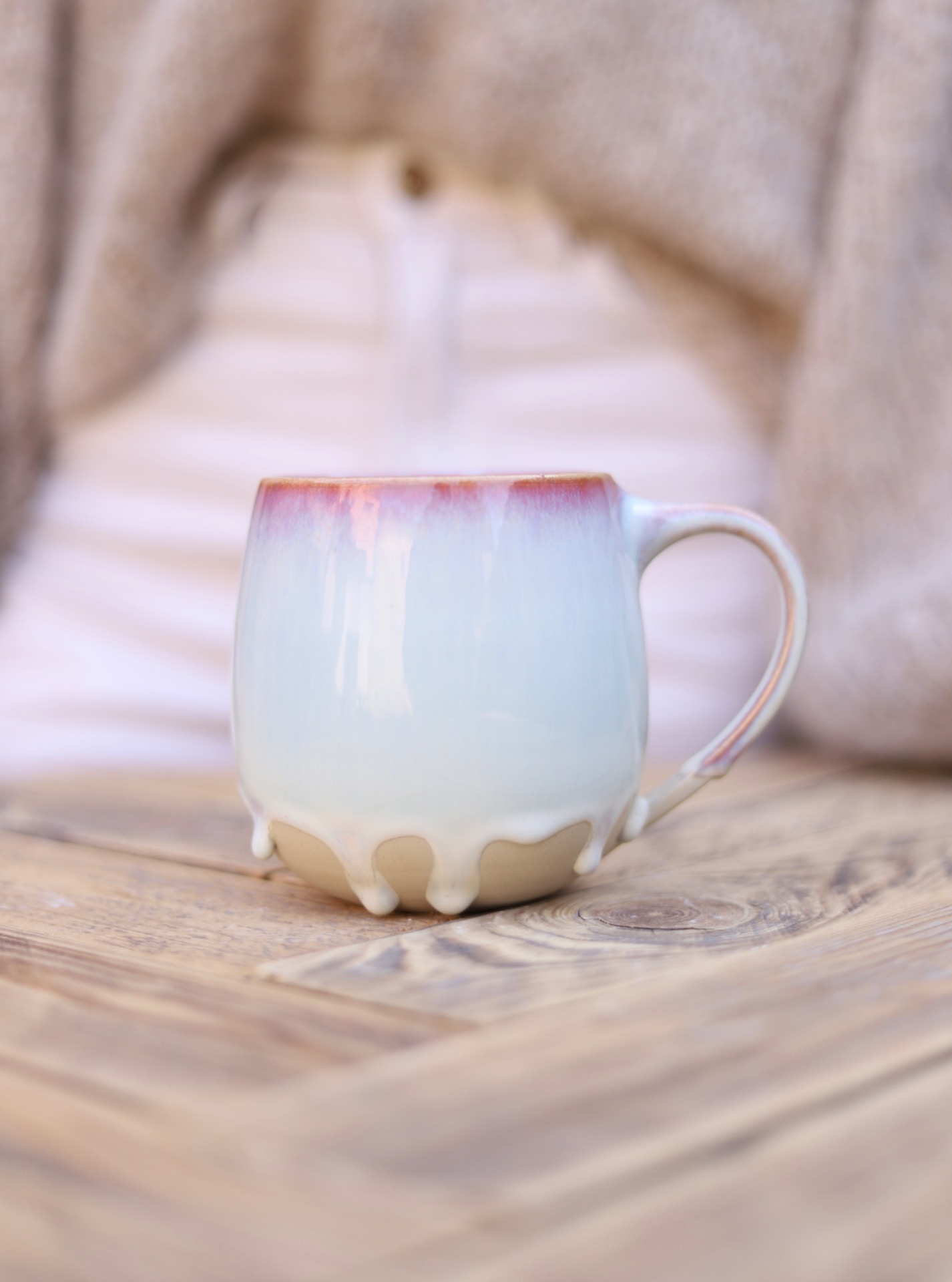 Hrnek na čaj s objemem cca 500ml s perleťovou růžovo-bílou drippy glazurou. Hrnek je vytočen z béžové kameniny a vypálen na vysoké teploty.