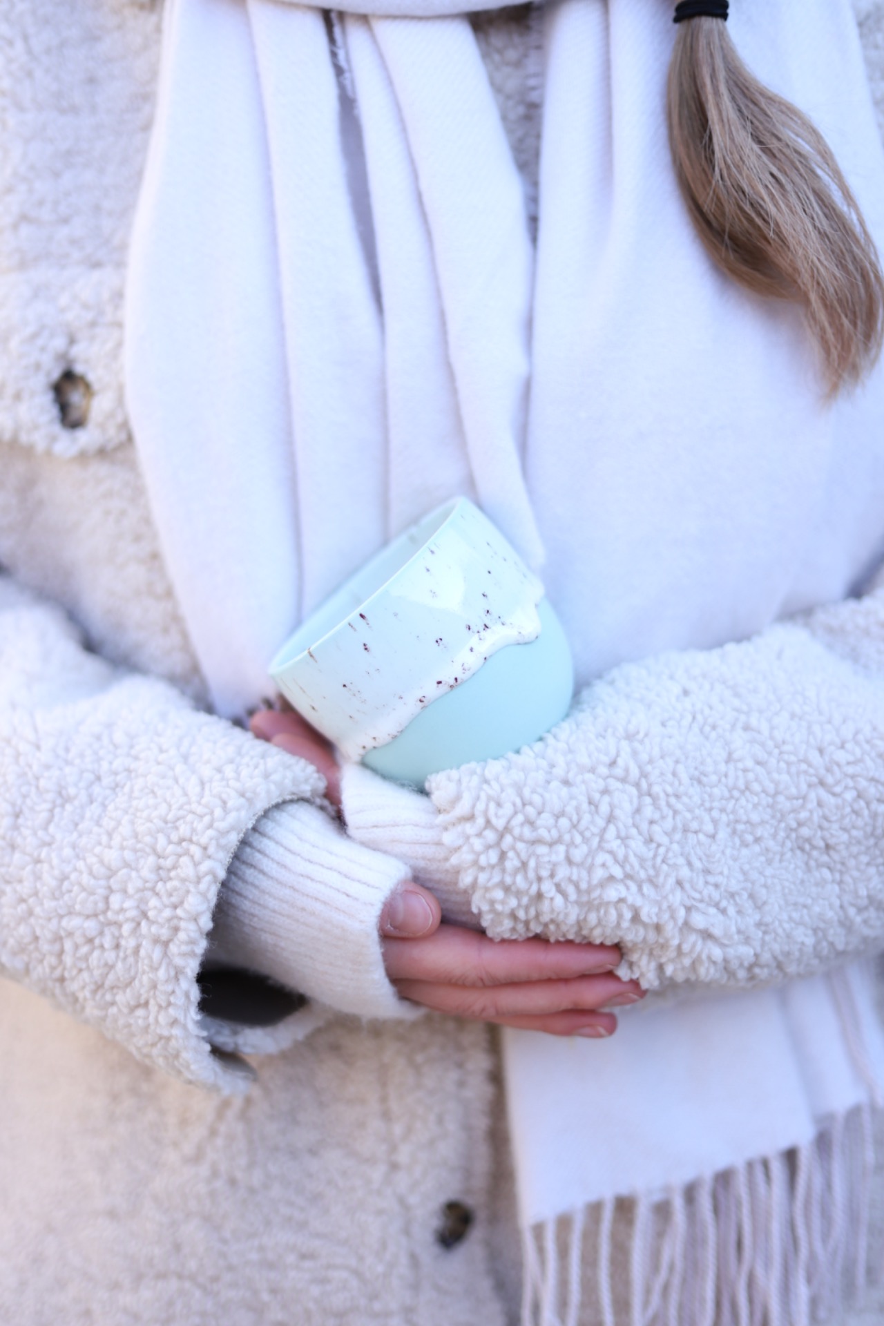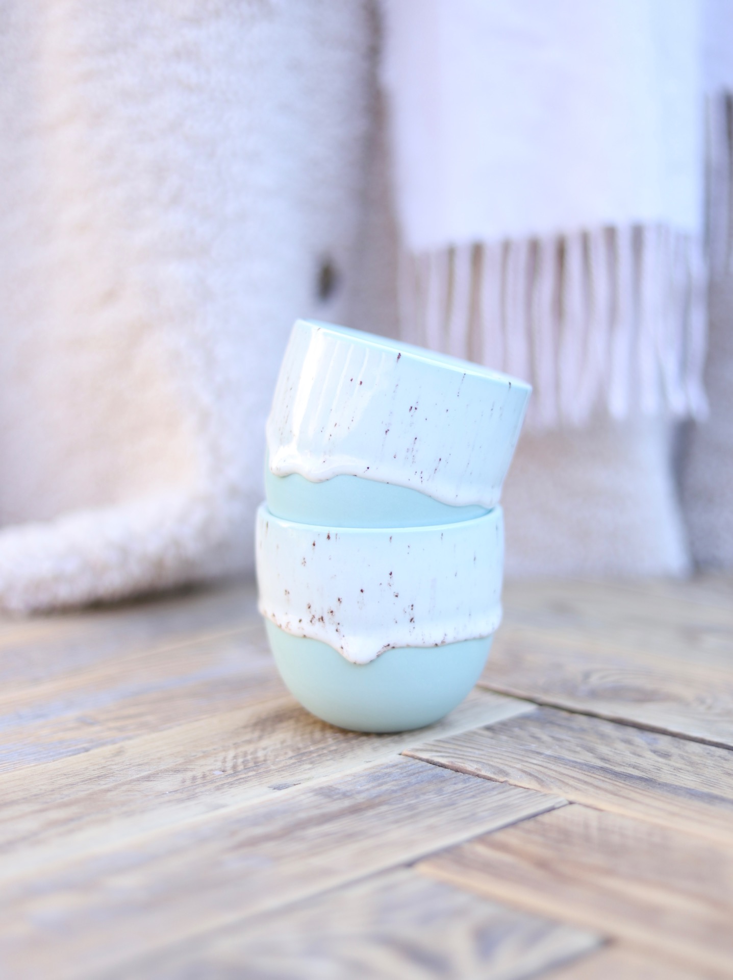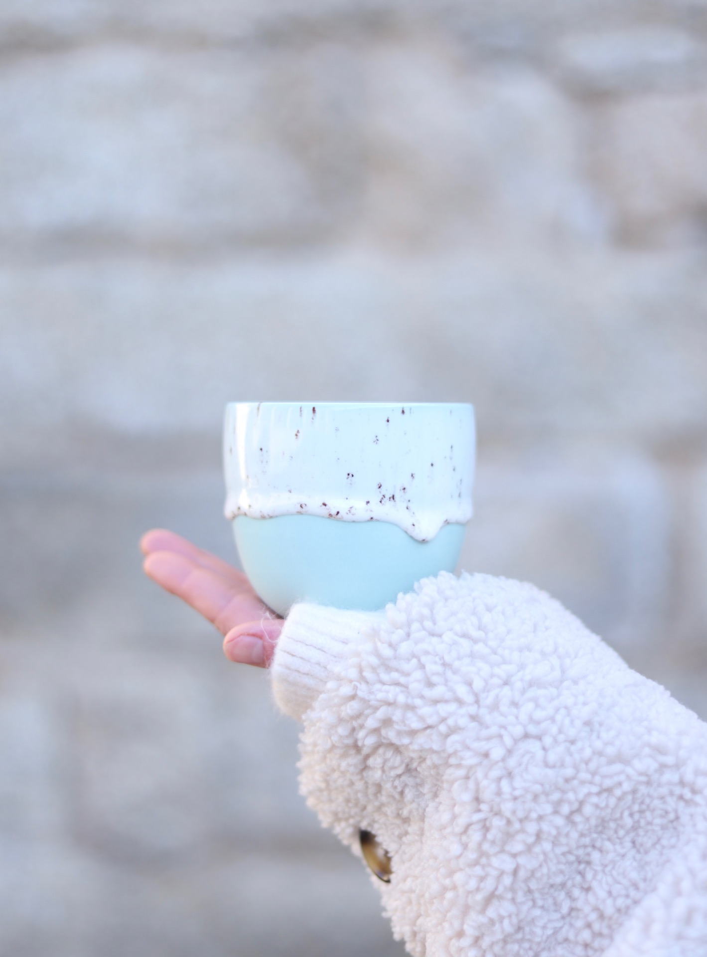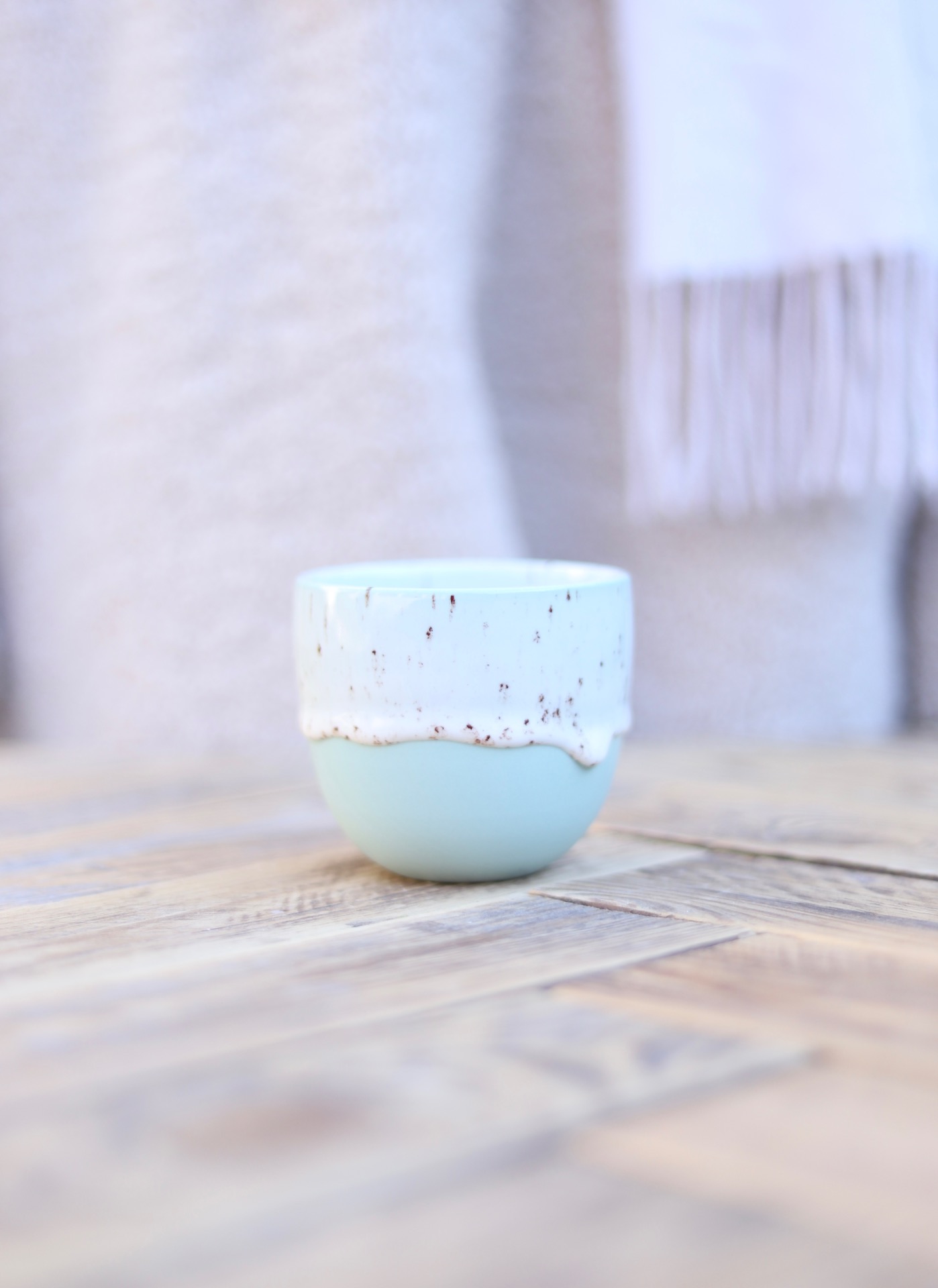 Kalíšek na kafe i čaj s objemem cca 240-260ml se smetanově bílou glazurou. Je vytočen z modrého porcelánu a vypálen na vysoké teploty.