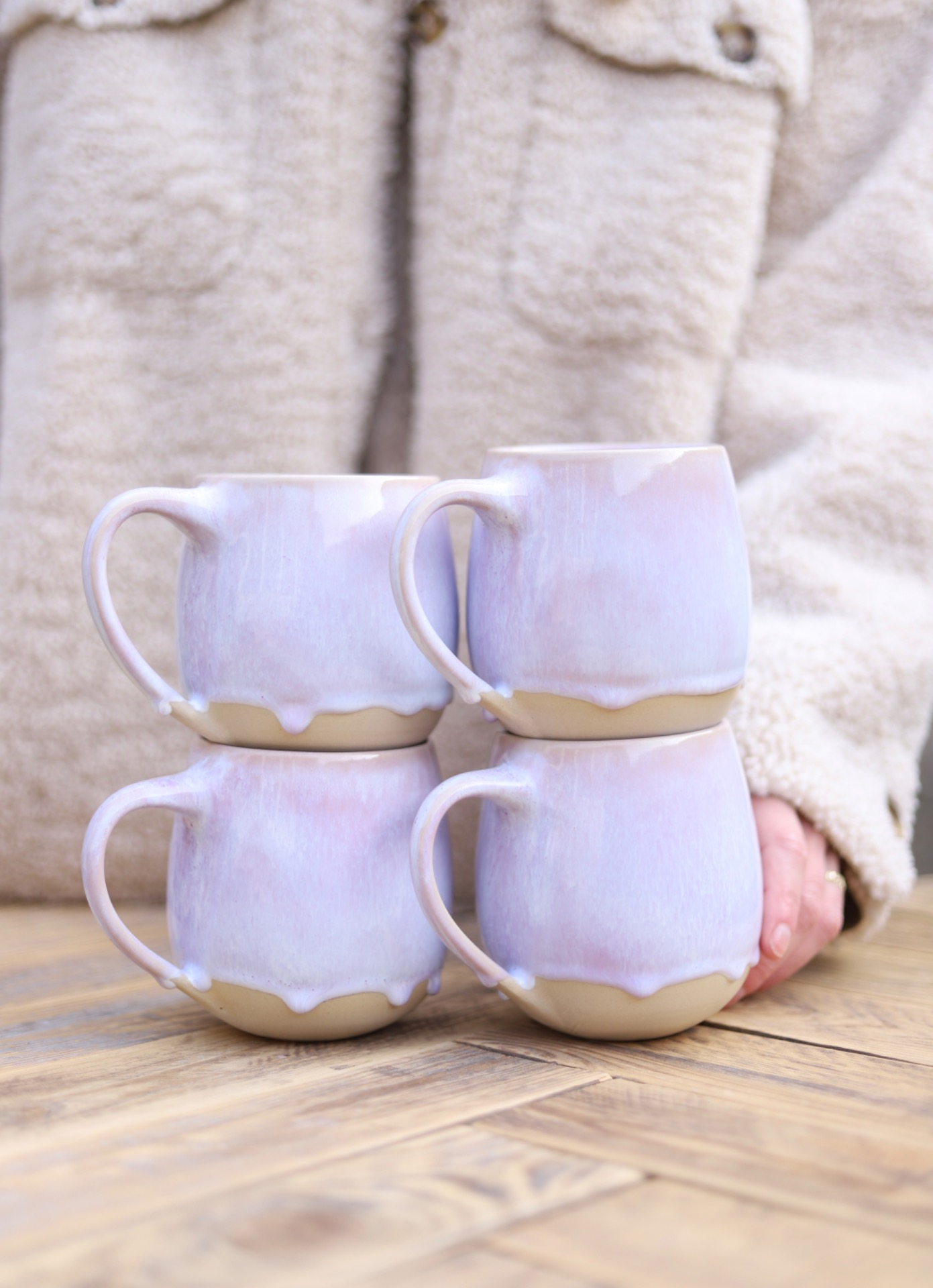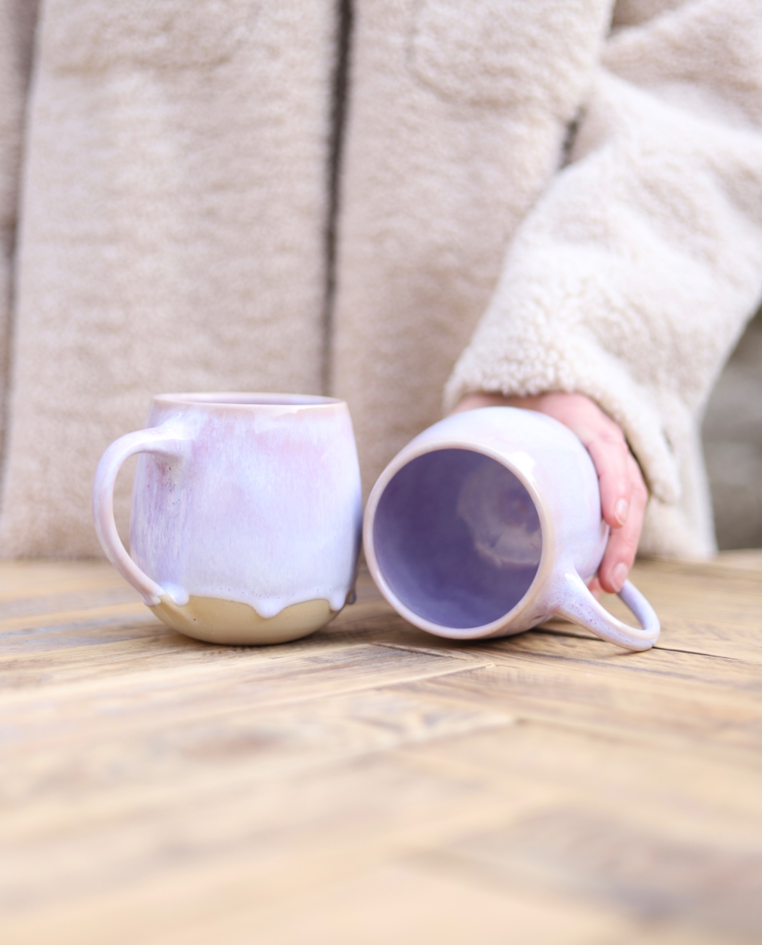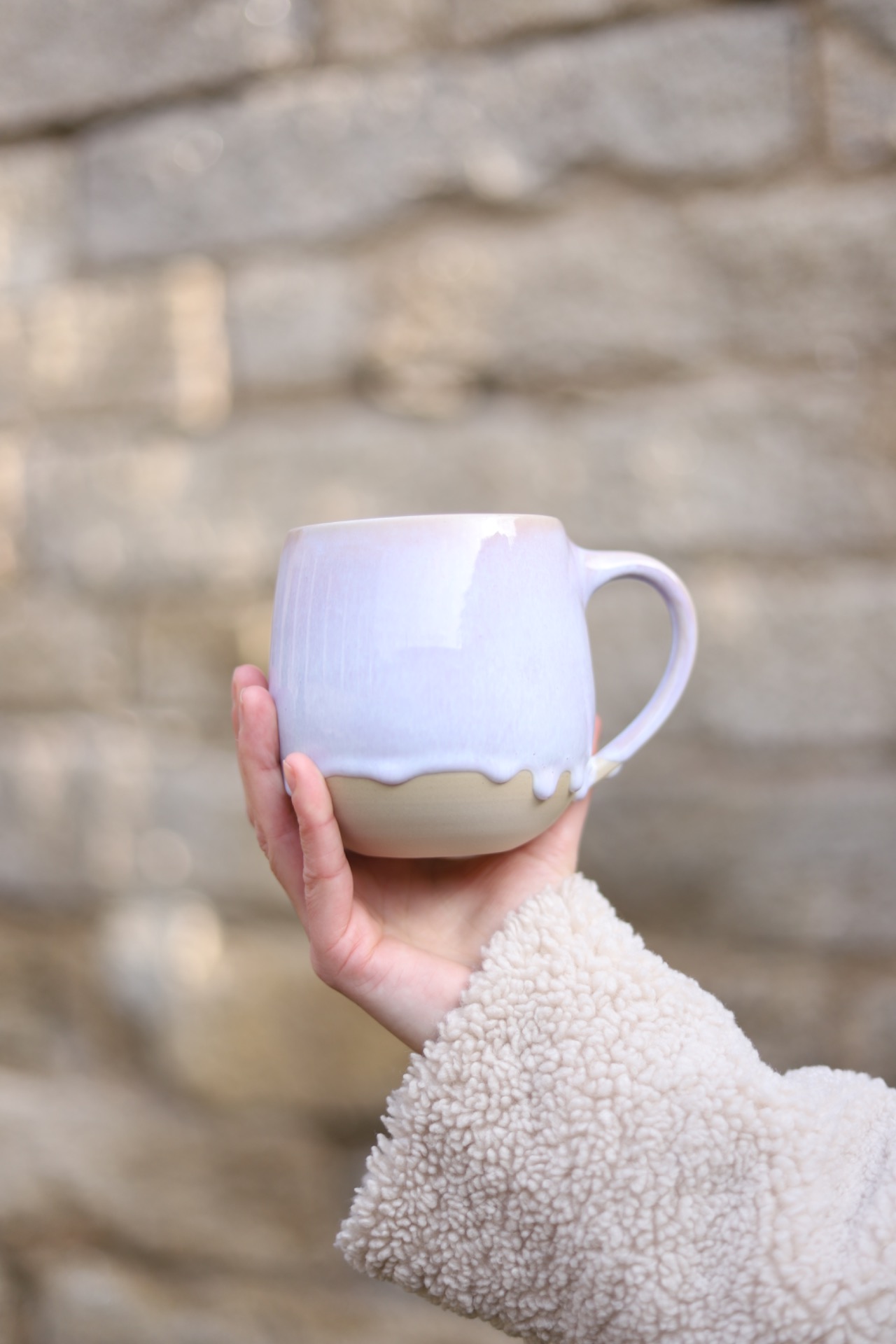 Hrnek na čaj s objemem cca 500ml se světle fialovou stékavou glazurou. Hrnek je vytočen z béžové kameniny a vypálen na vysoké teploty.