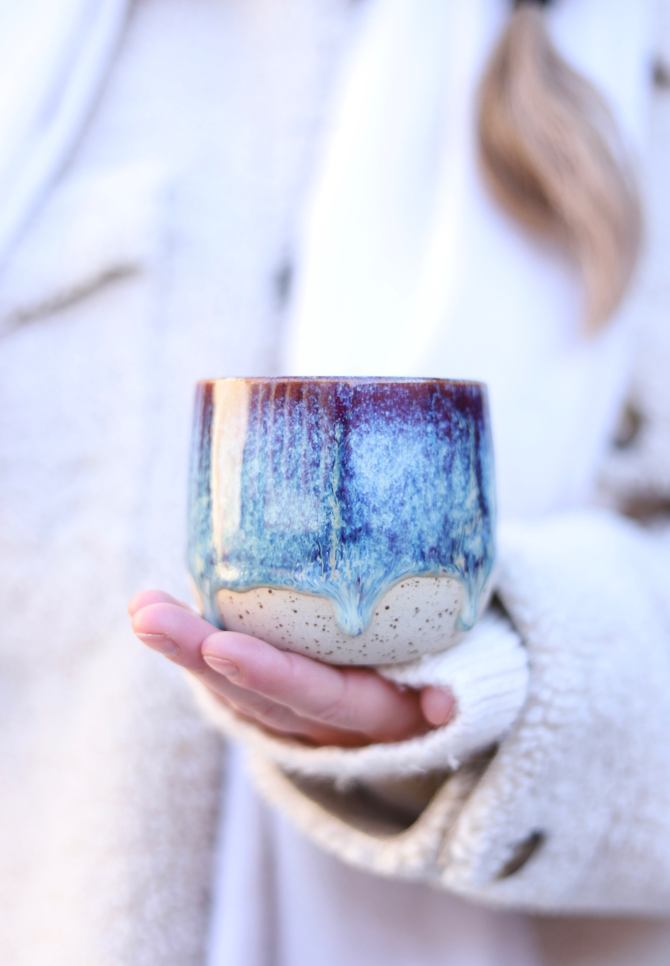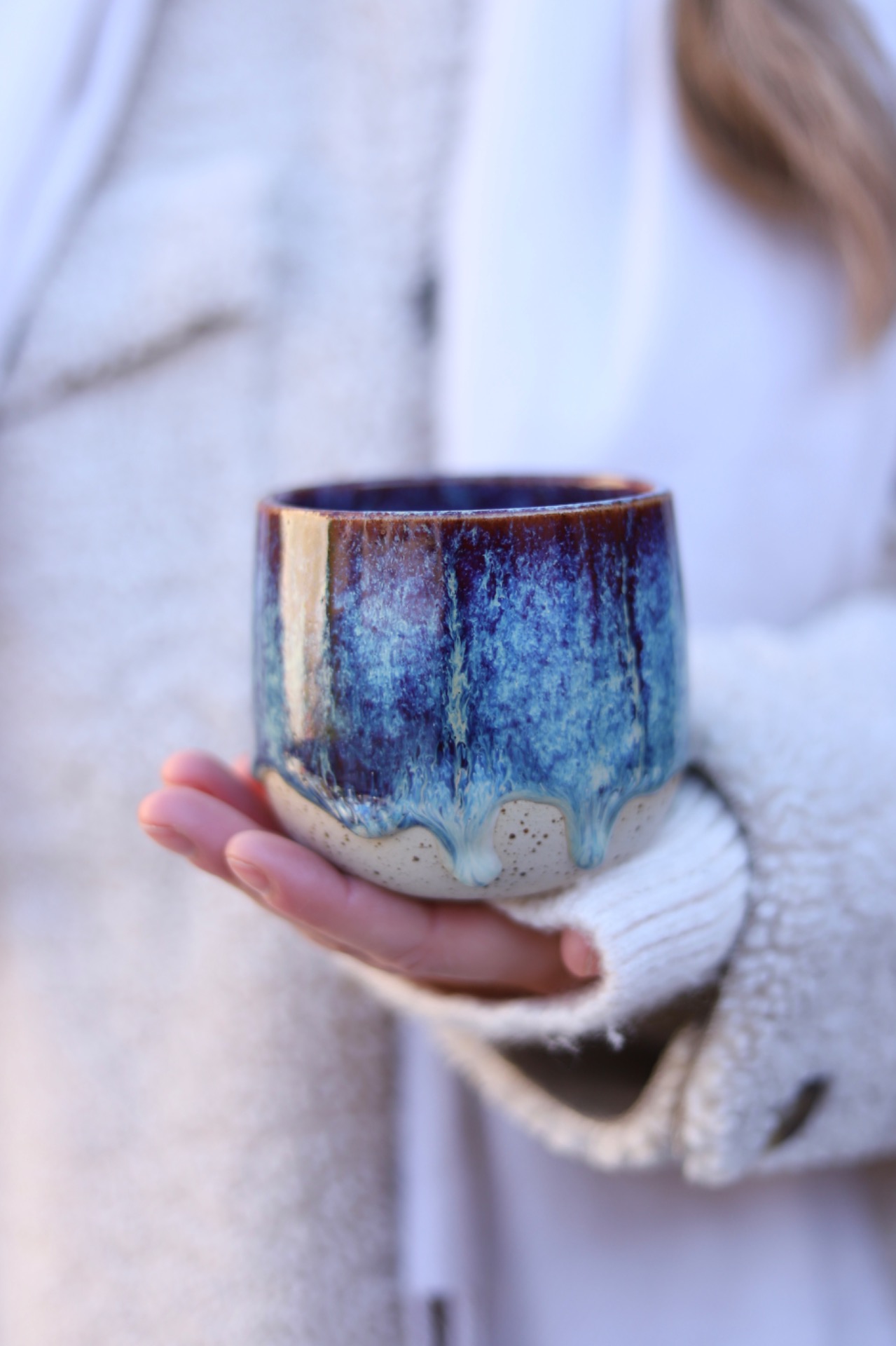 Kalíšek na kafe i čaj s objemem cca 280ml s efektní vínovo-modrou glazurou. Kalíšek je vytočen z tečkované kameniny a vypálen na vysoké teploty.