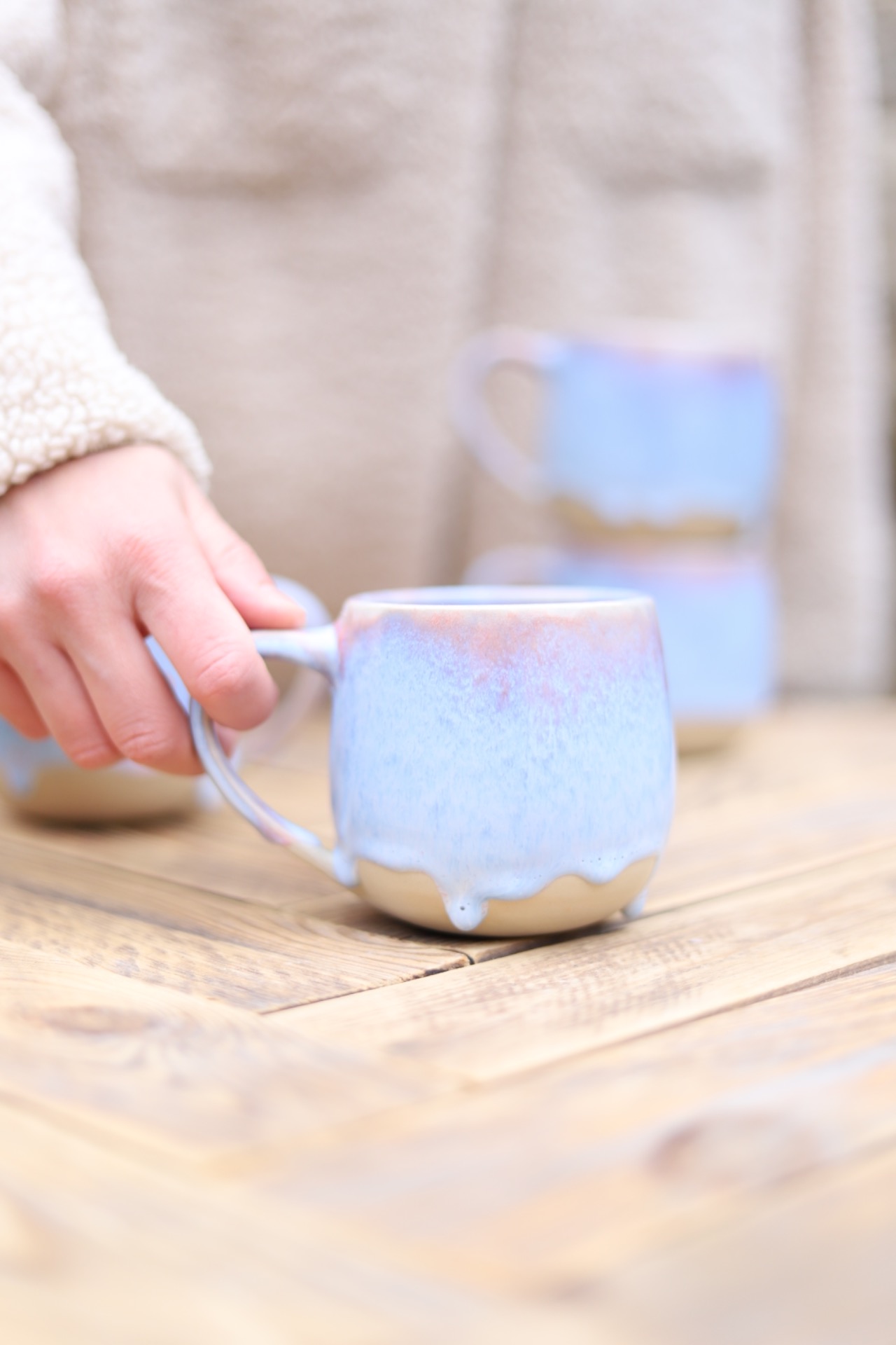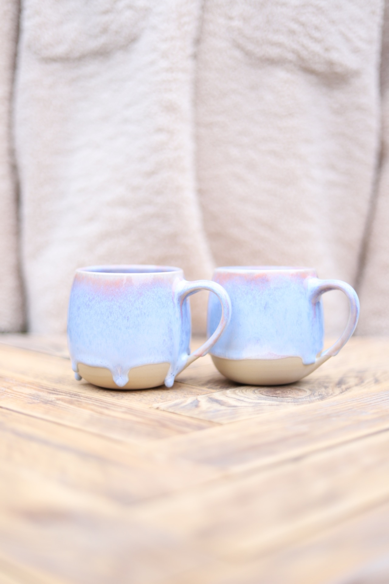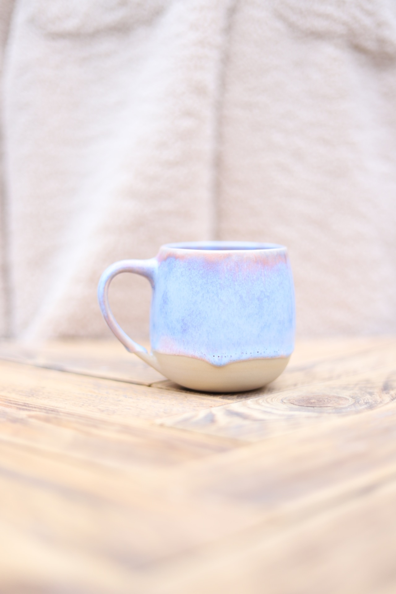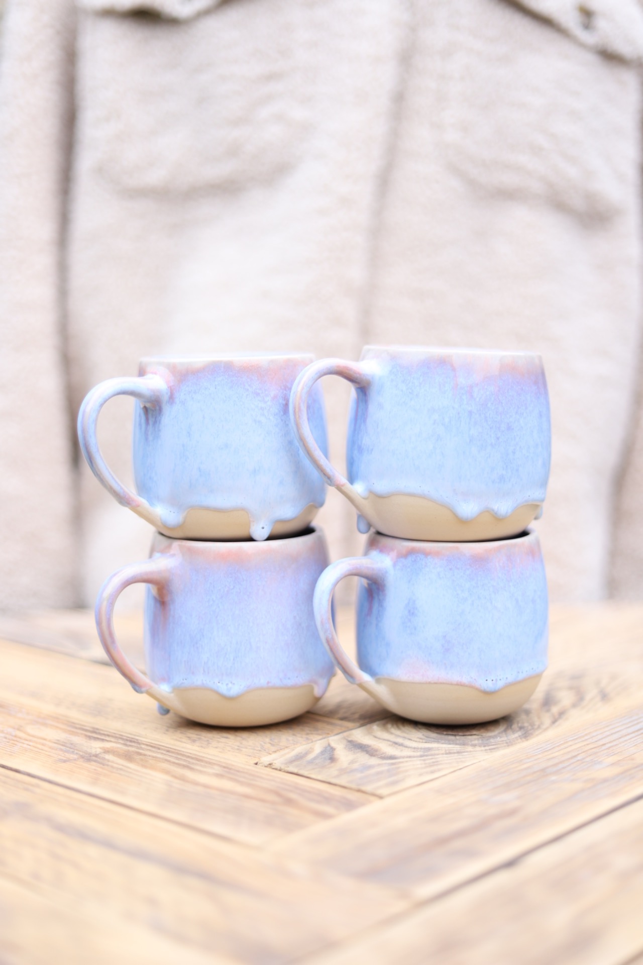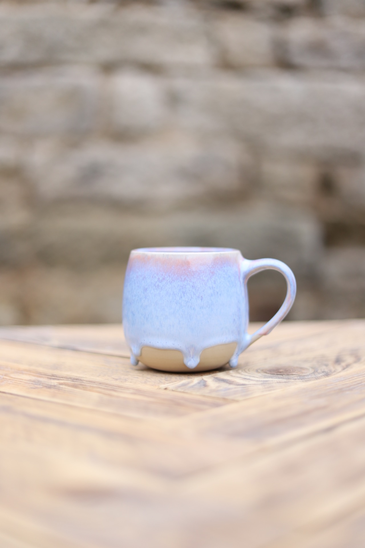 Hrnek na čaj s objemem cca 350ml s růžovo-modrou glazurou. Hrnek je vytočen z béžové kameniny a vypálen na vysoké teploty.