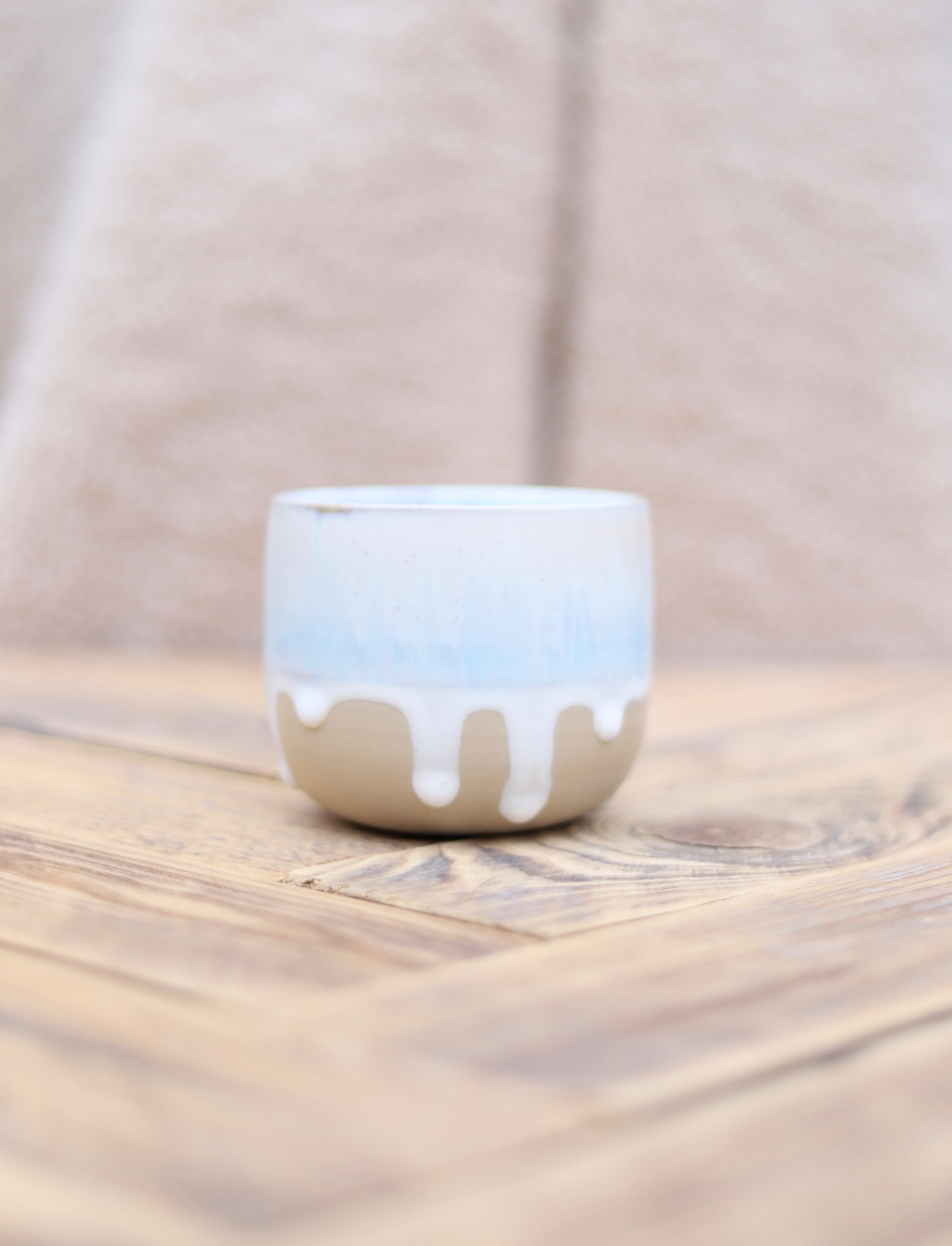 Kalíšek na kafe i čaj s objemem cca 210-230ml s bílo-modrou glazurou s šedými výkvěty a béžovým nádechem. Je vytočen z béžové kameniny a vypálen na vysoké teploty.