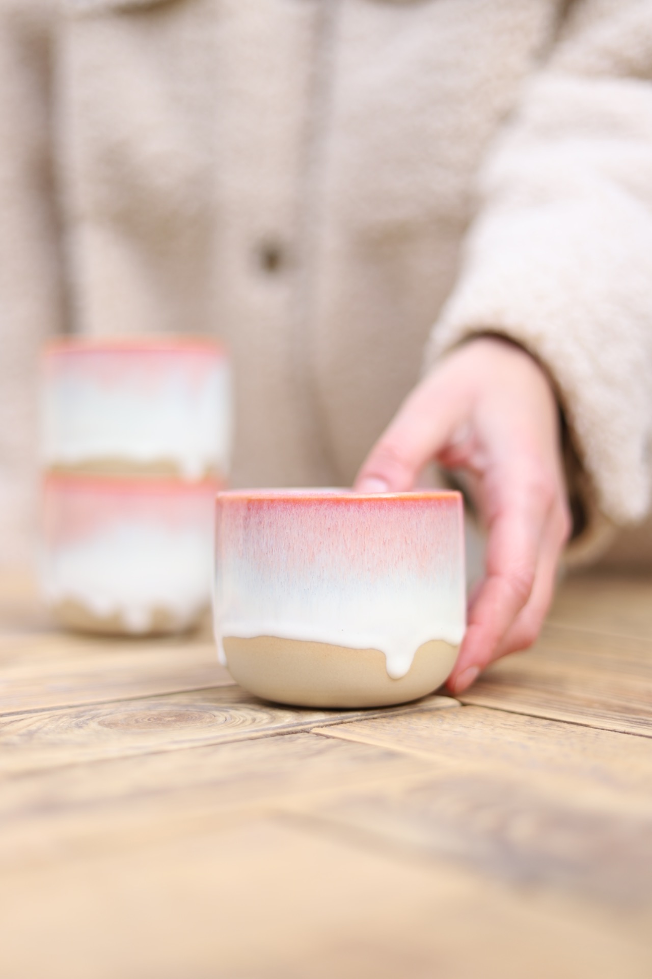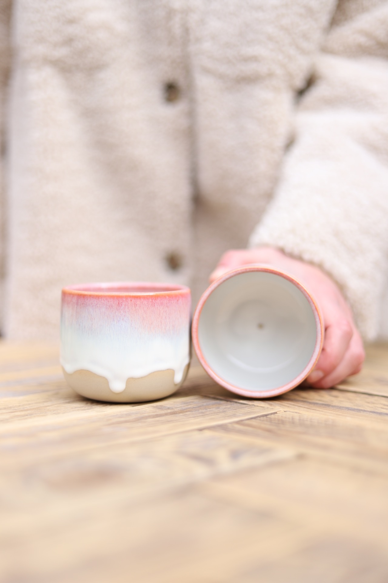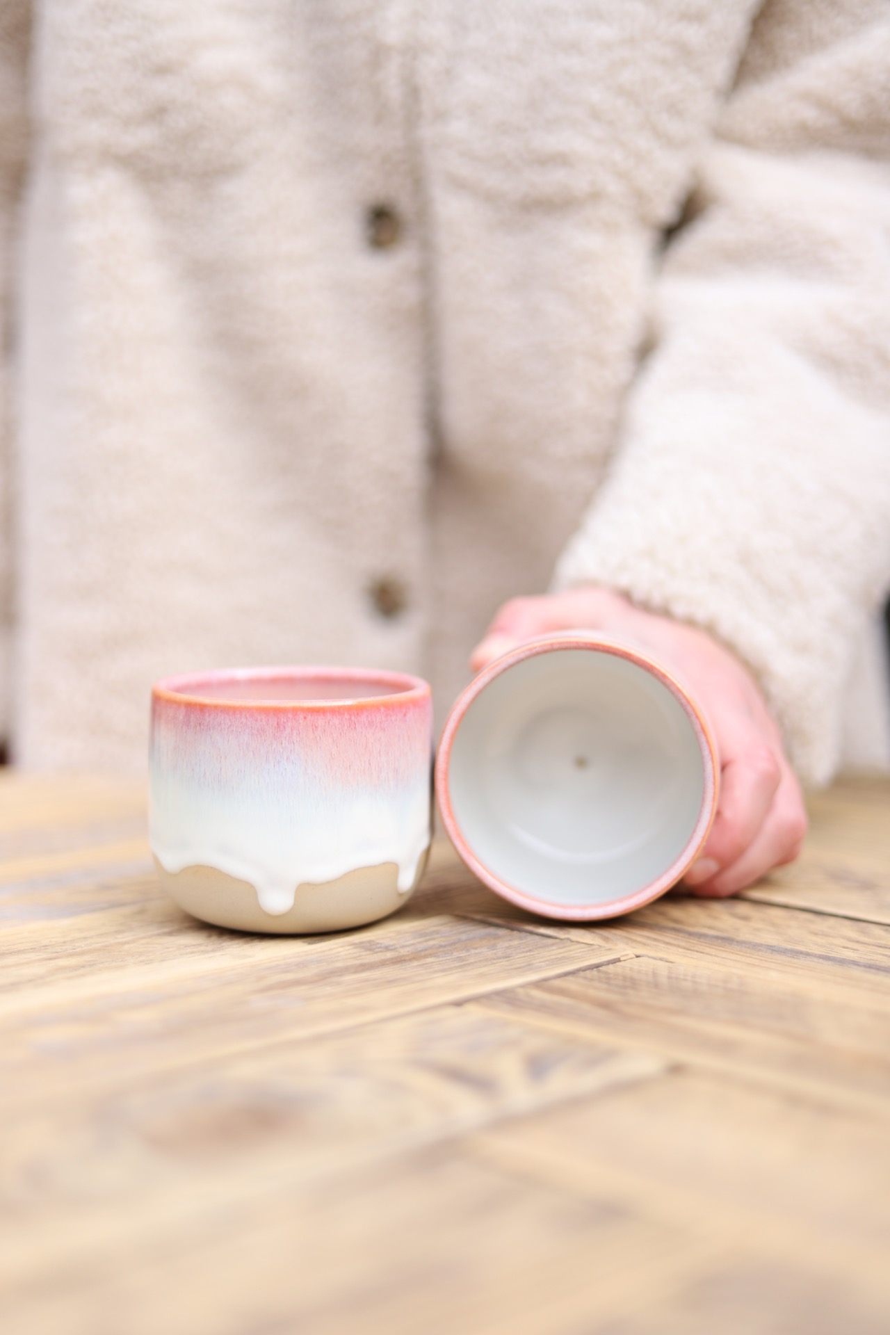 Kalíšek na kafe i čaj s objemem cca 230-250ml s růžovo-bílou glazurou. Je vytočen z béžové kameniny a vypálen na vysoké teploty.