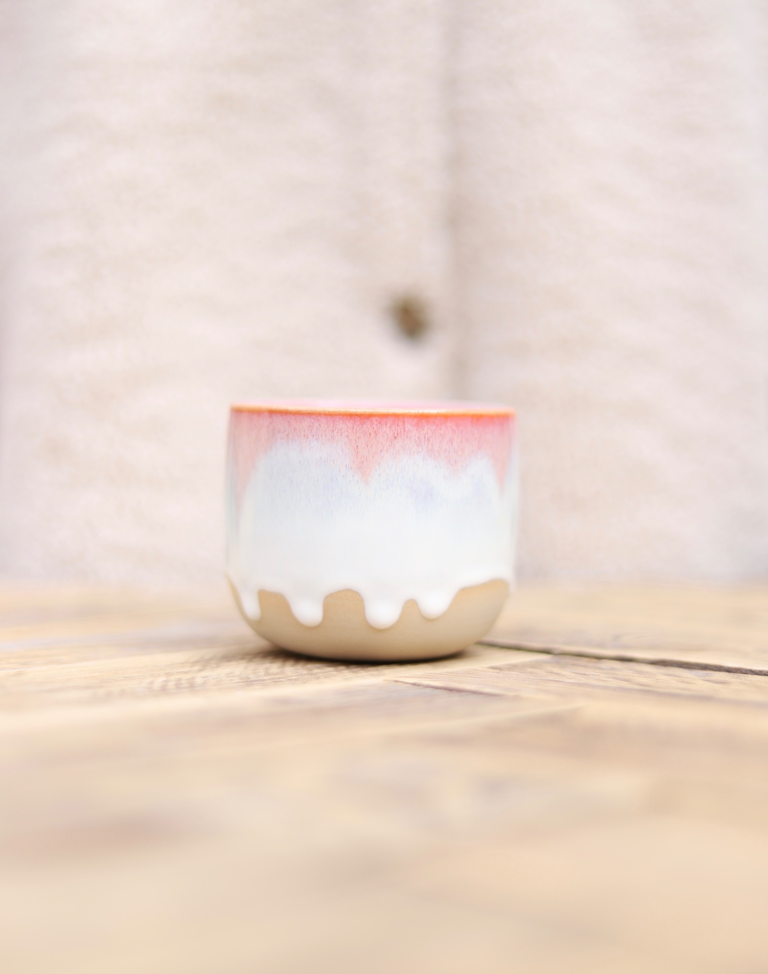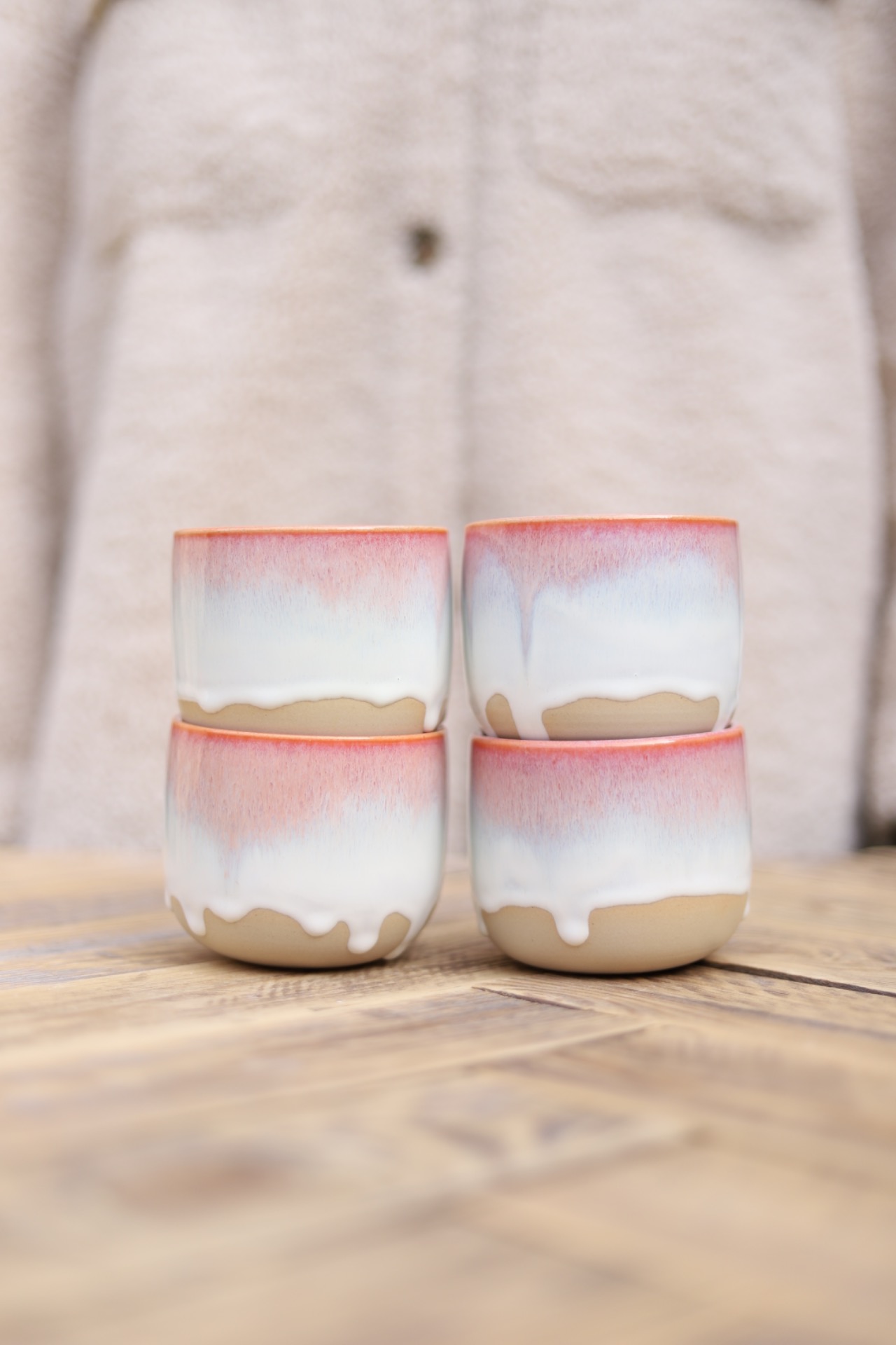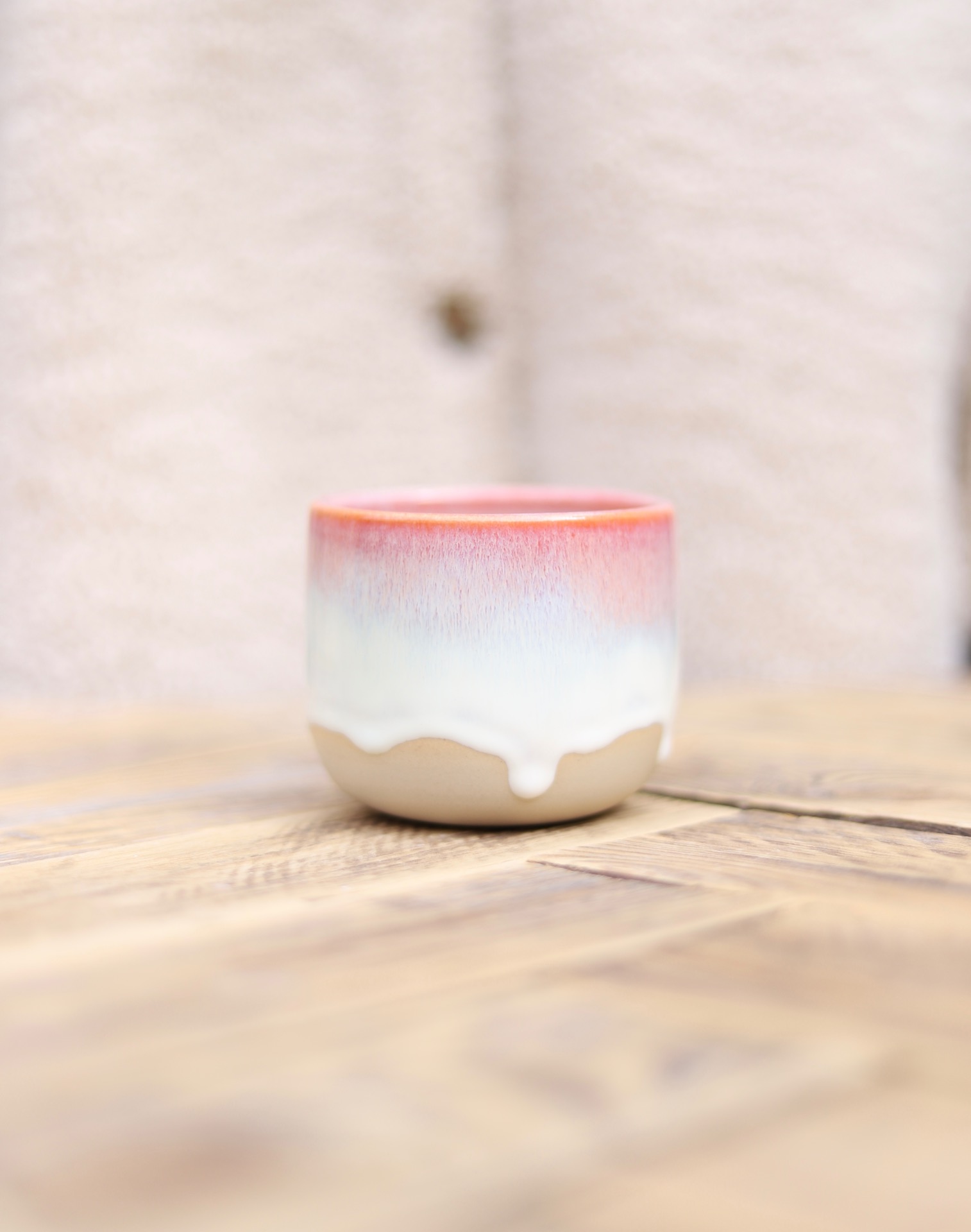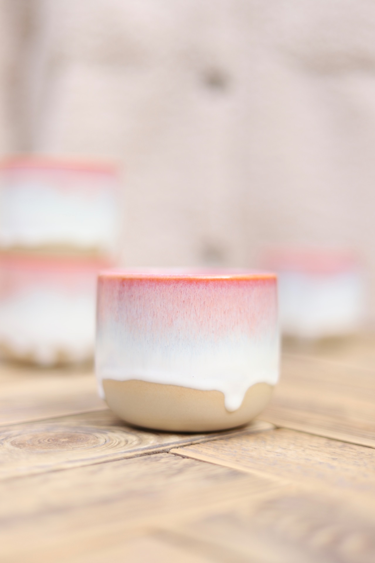 Kalíšek na kafe i čaj s objemem cca 230-250ml s růžovo-bílou glazurou. Je vytočen z béžové kameniny a vypálen na vysoké teploty.