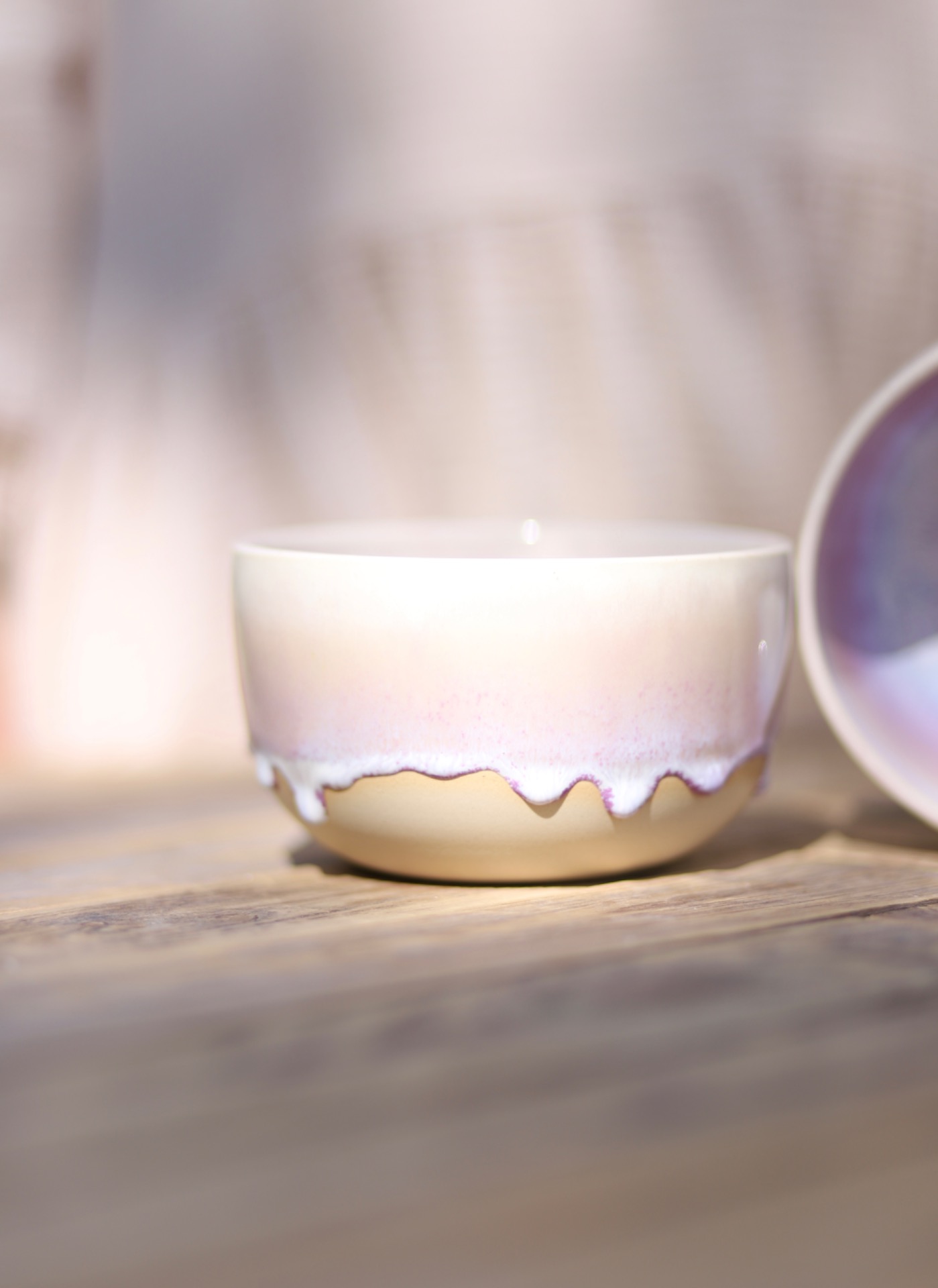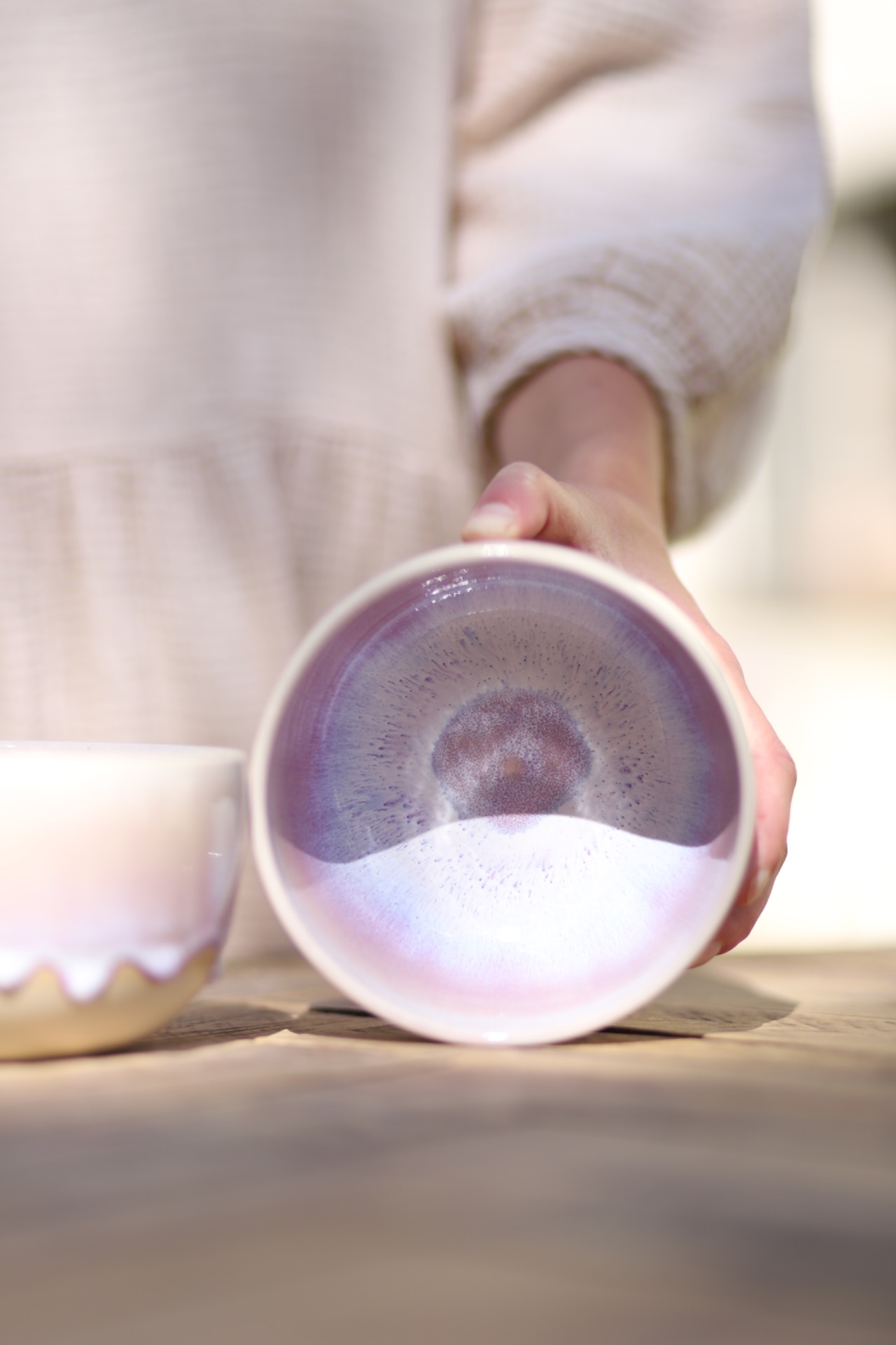 Miska s objemem 550ml s fialovo bílou stékavou glazurou. Je vytočena z béžové kameniny a vypálena na vysoké teploty.