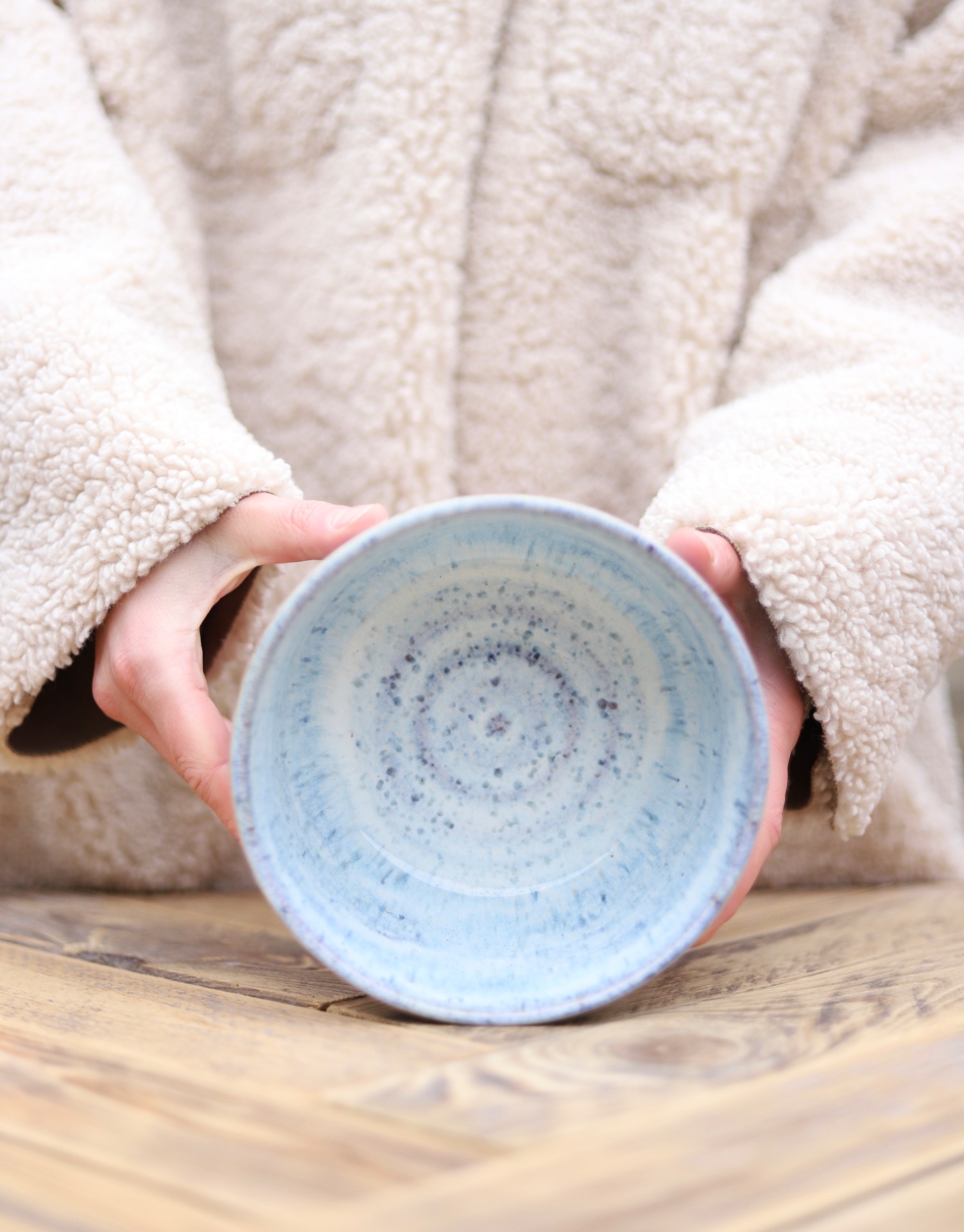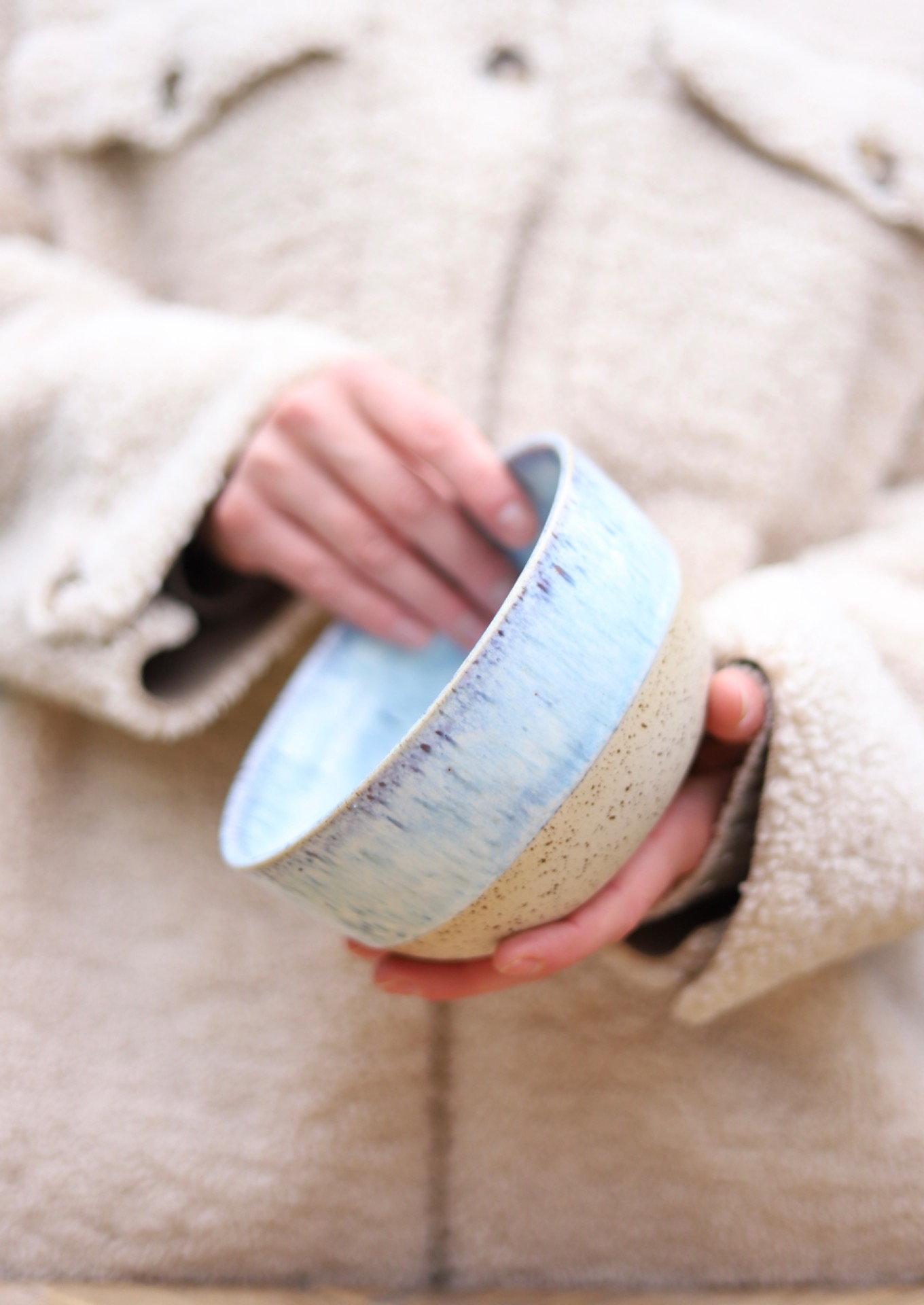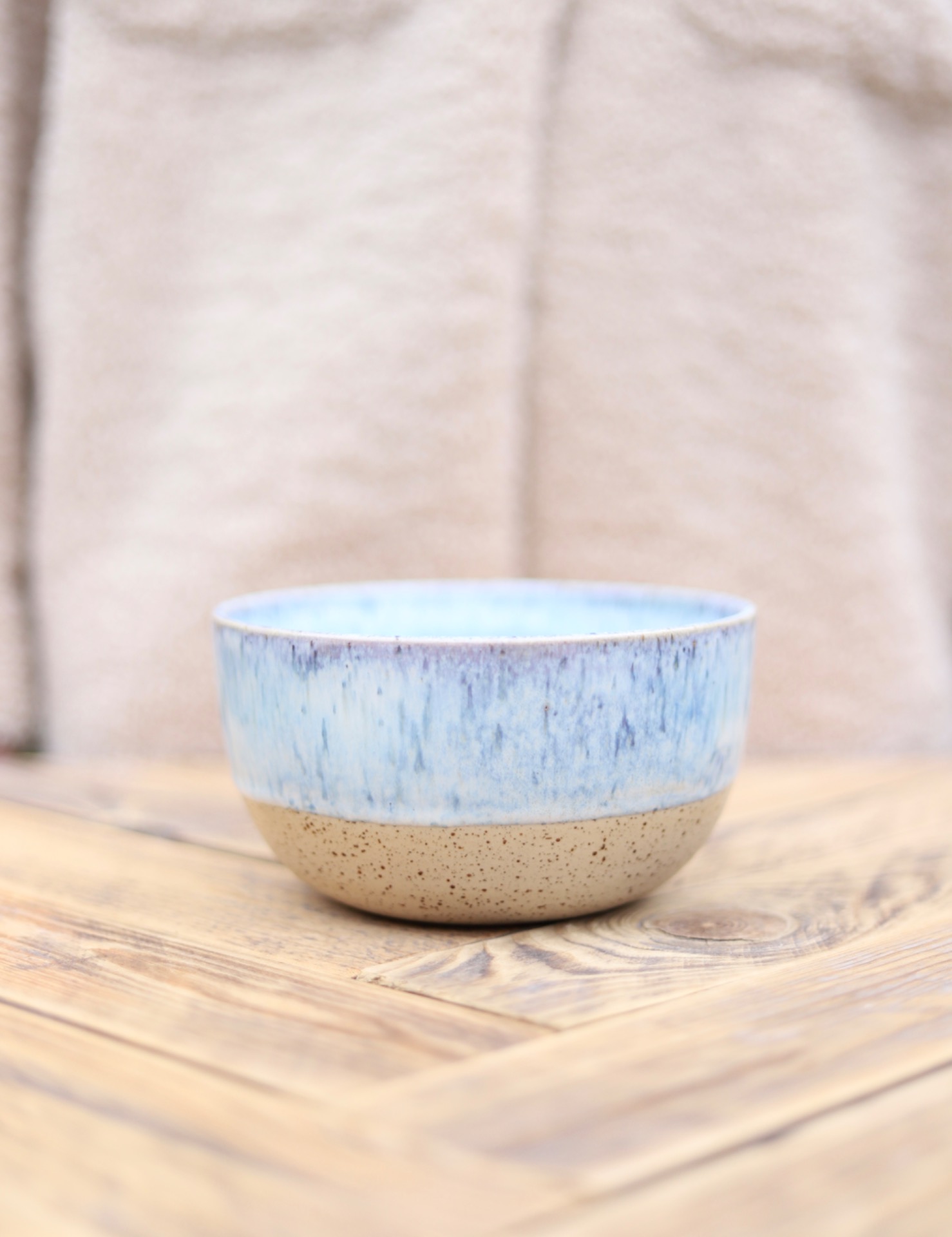 Miska s objemem 700-750ml se světle modrou glazurou. Je vytočena z béžové kameniny a vypálena na vysoké teploty.