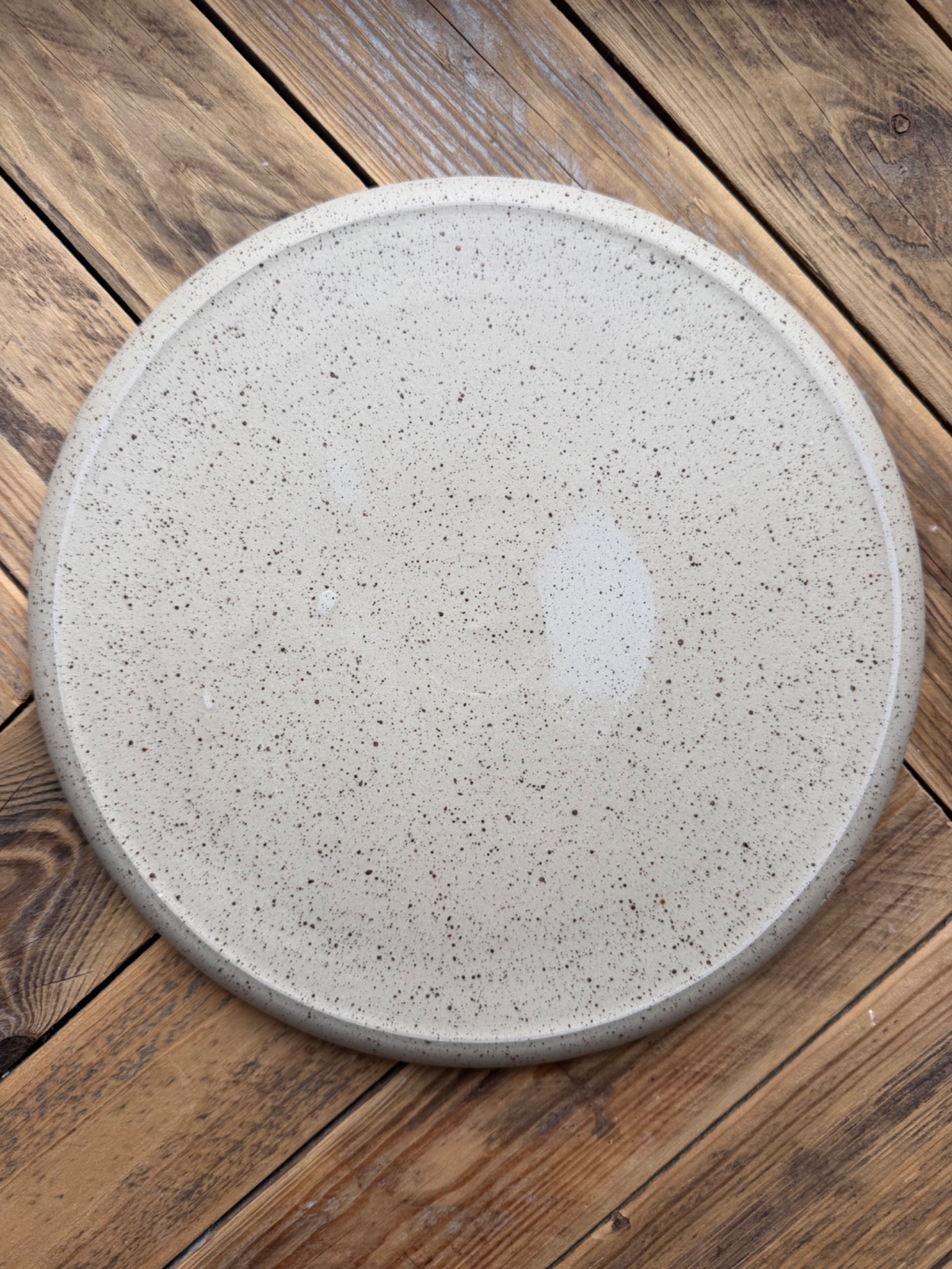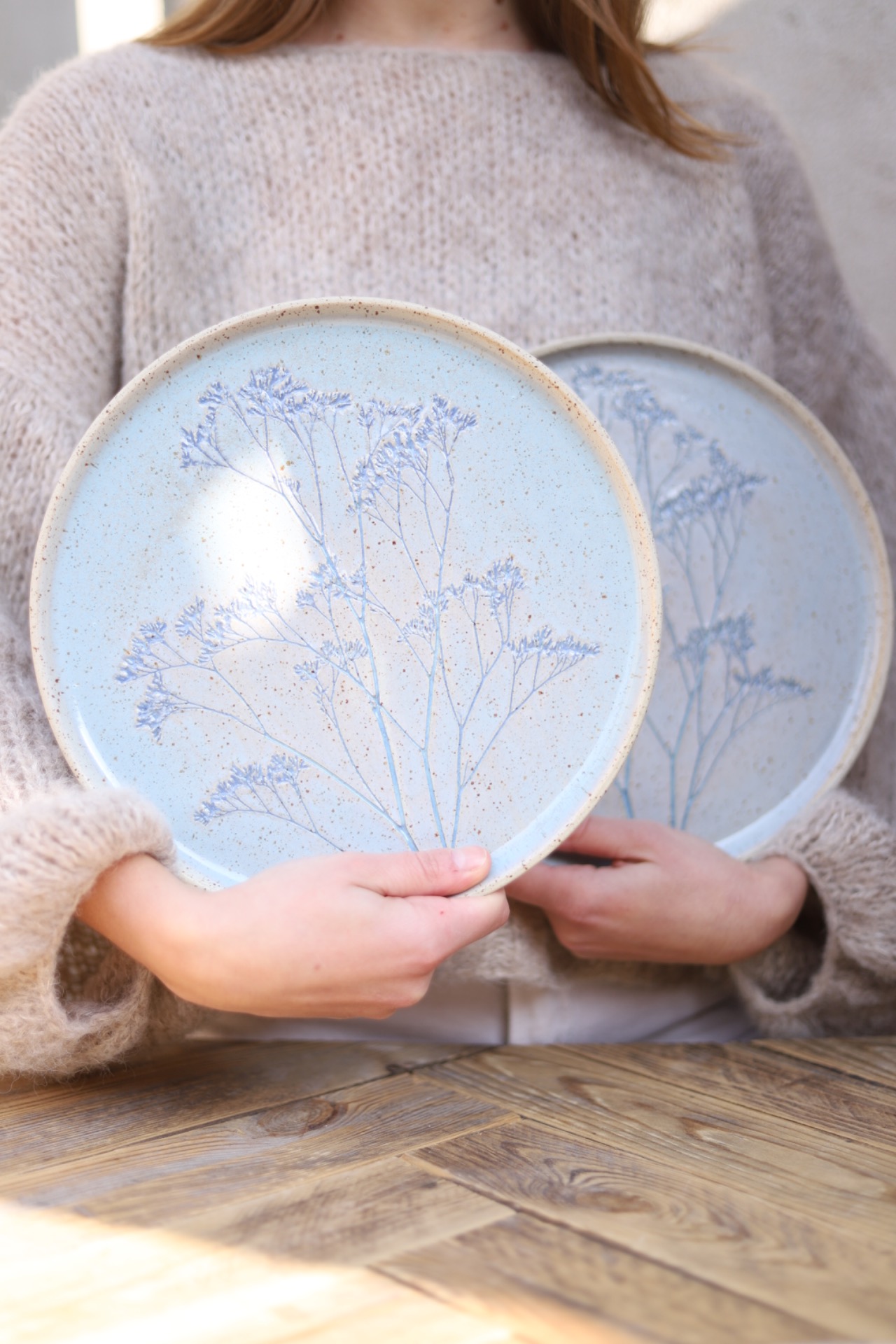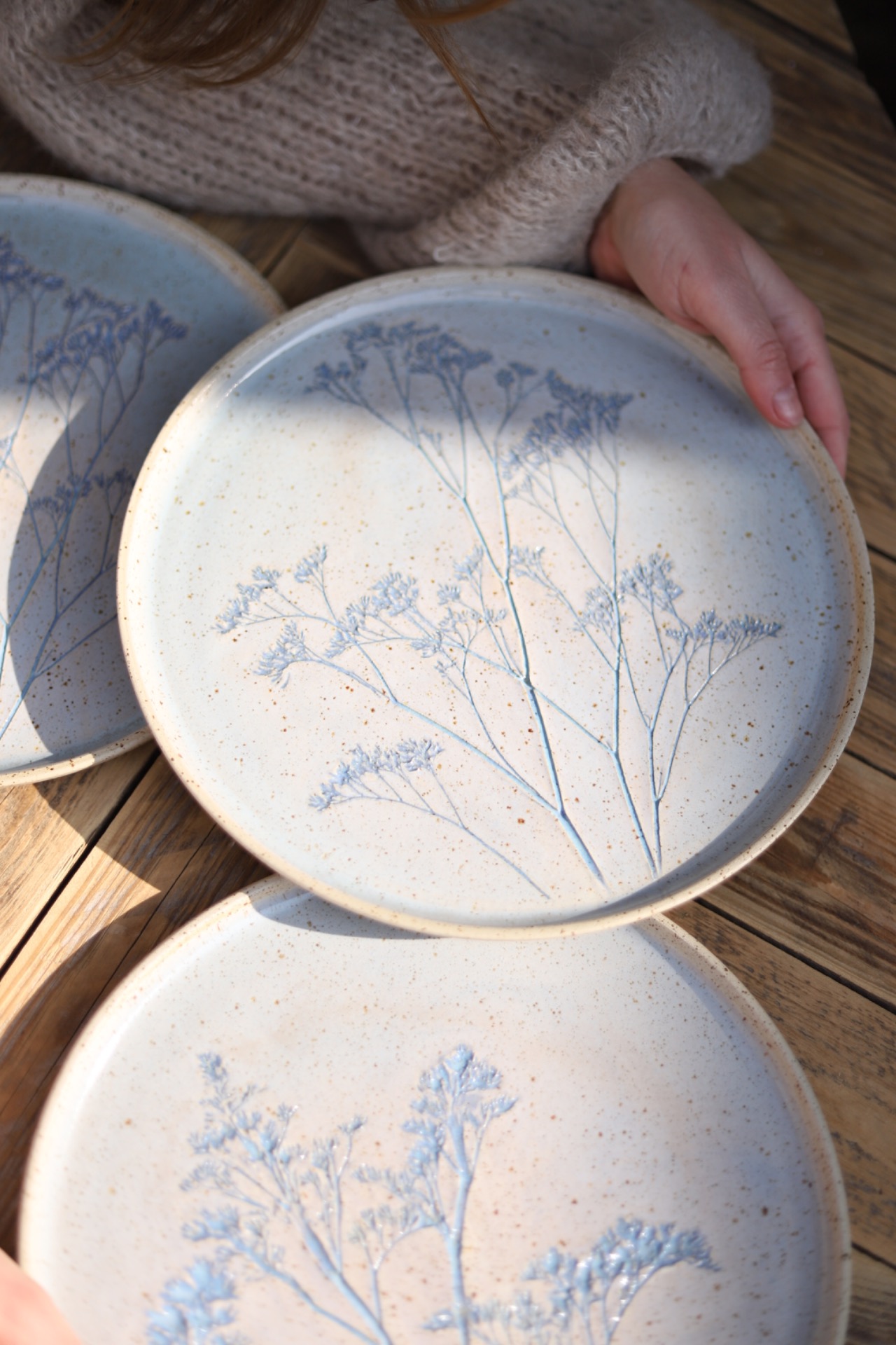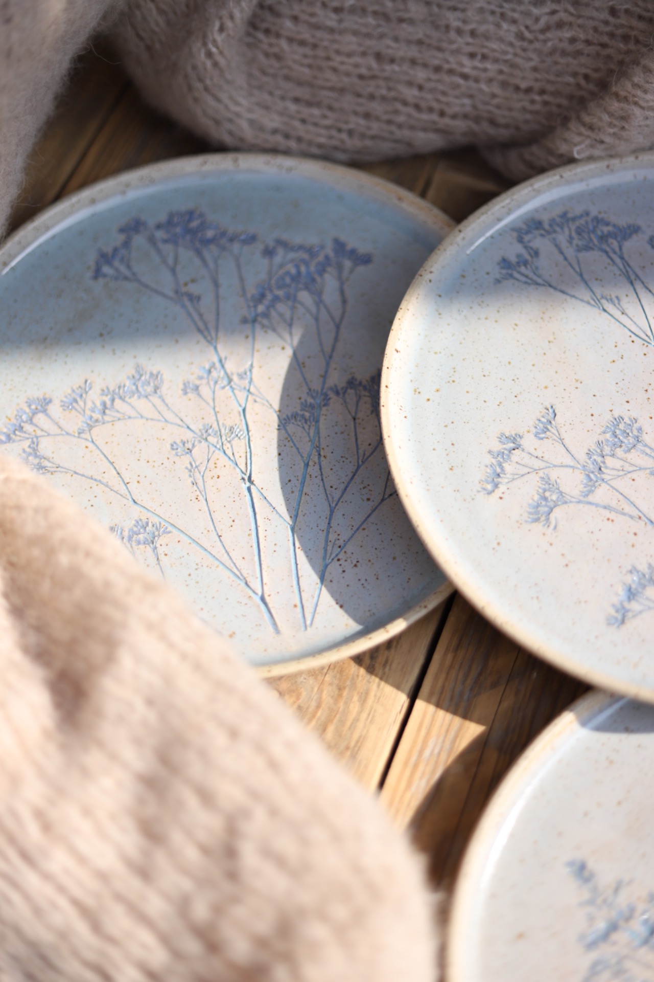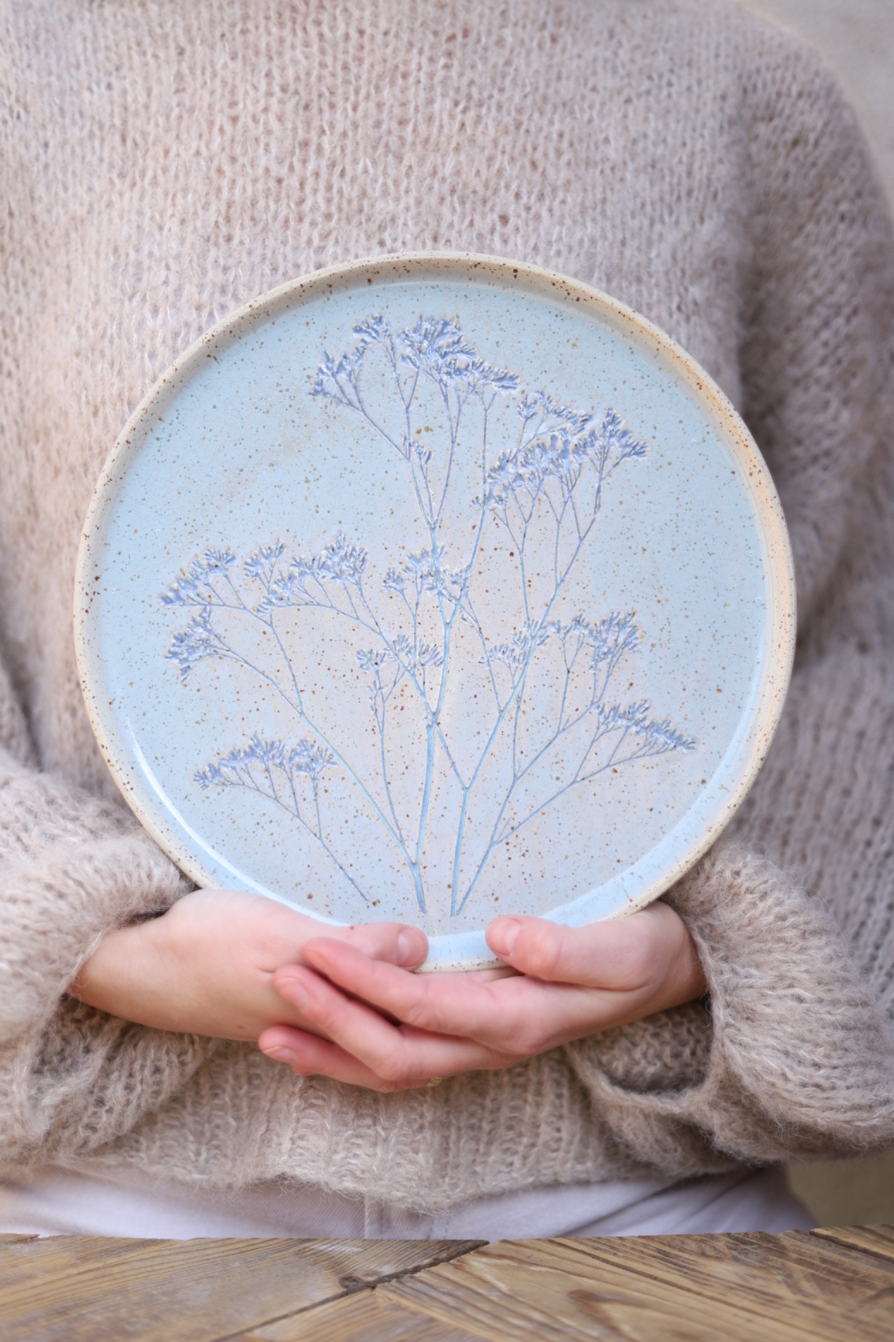 Servírovací talíř s průměrem přes 25cm s obtisky Limonia. Talíř je vytočený z tečkované kameniny a vypálen na vysoké teploty.