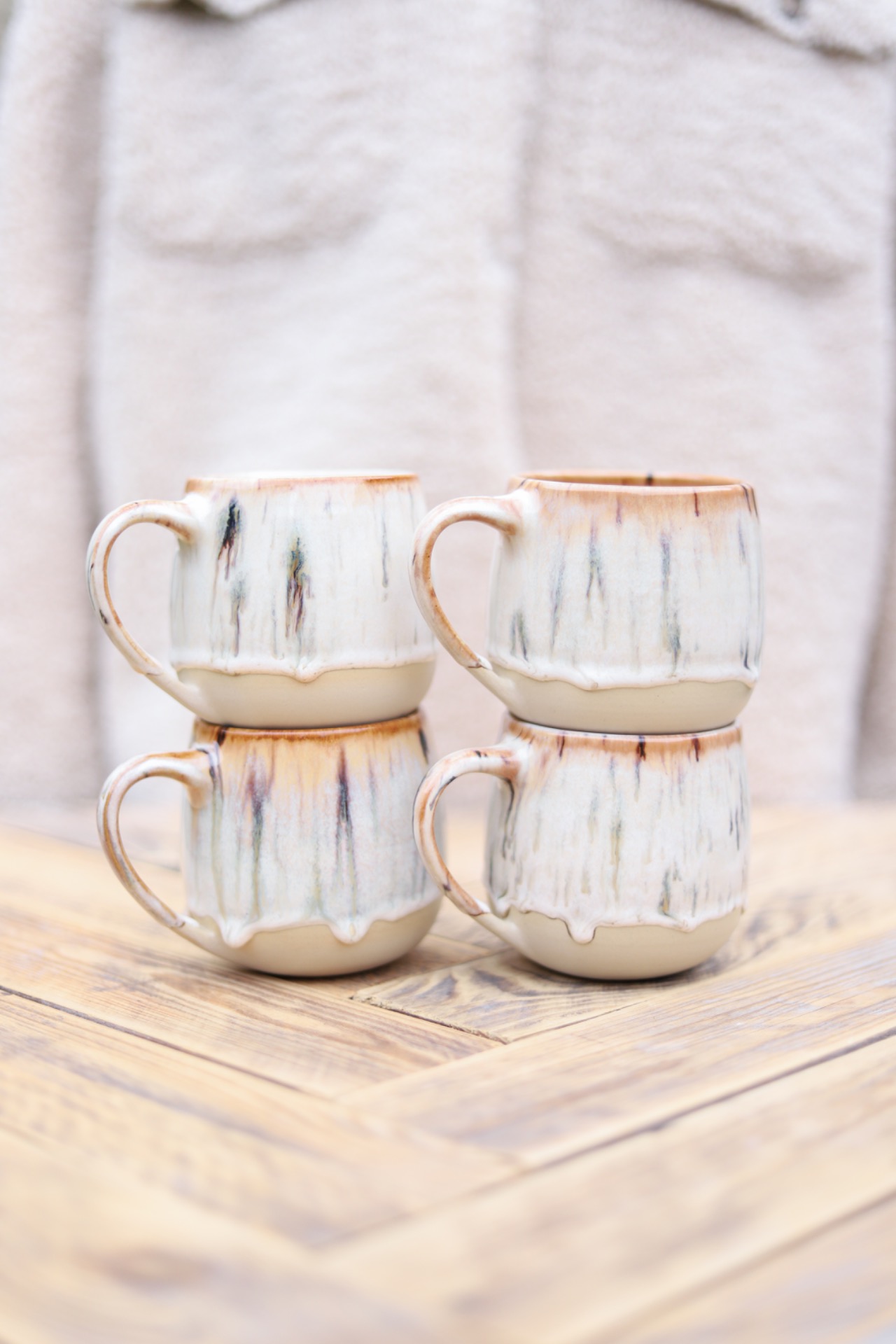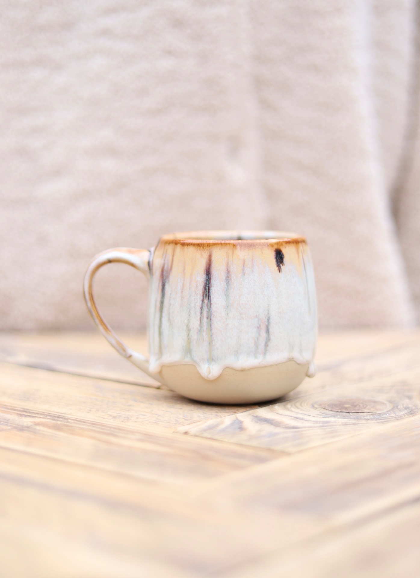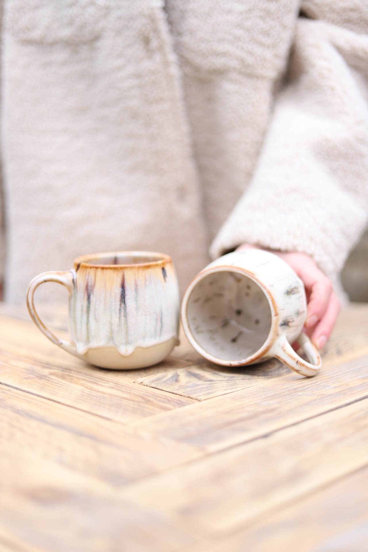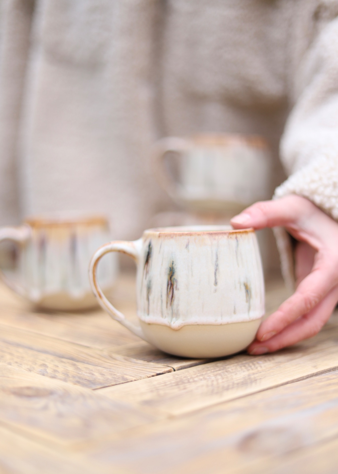 Hrnek na čaj s objemem cca 340-360ml s efektní krémovou glazurou s hnědými floty. Hrnek je vytočen z béžové kameniny a vypálen na vysoké teploty.