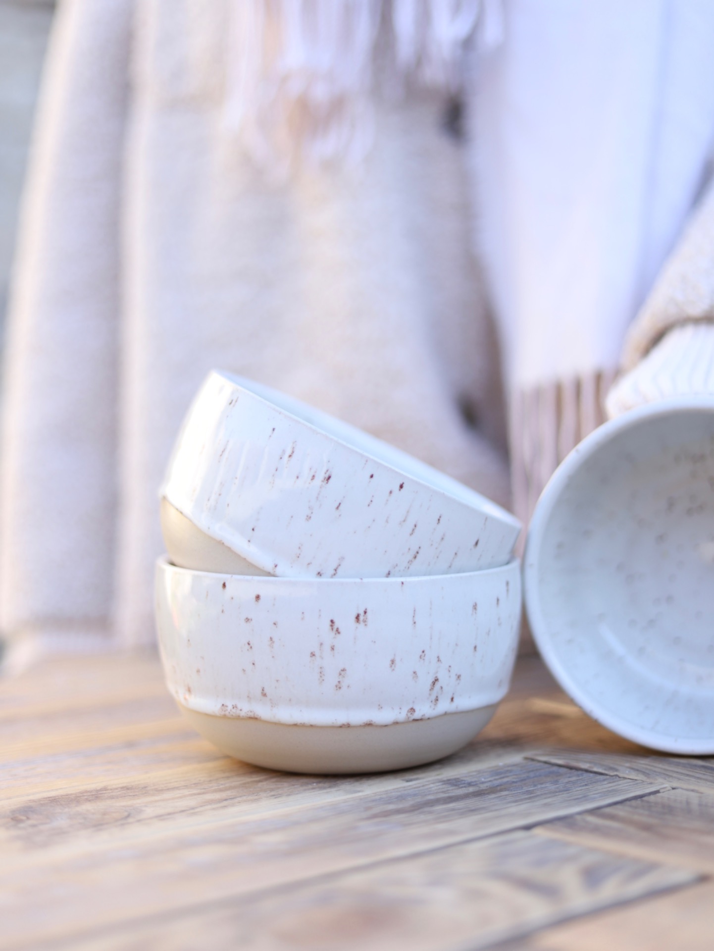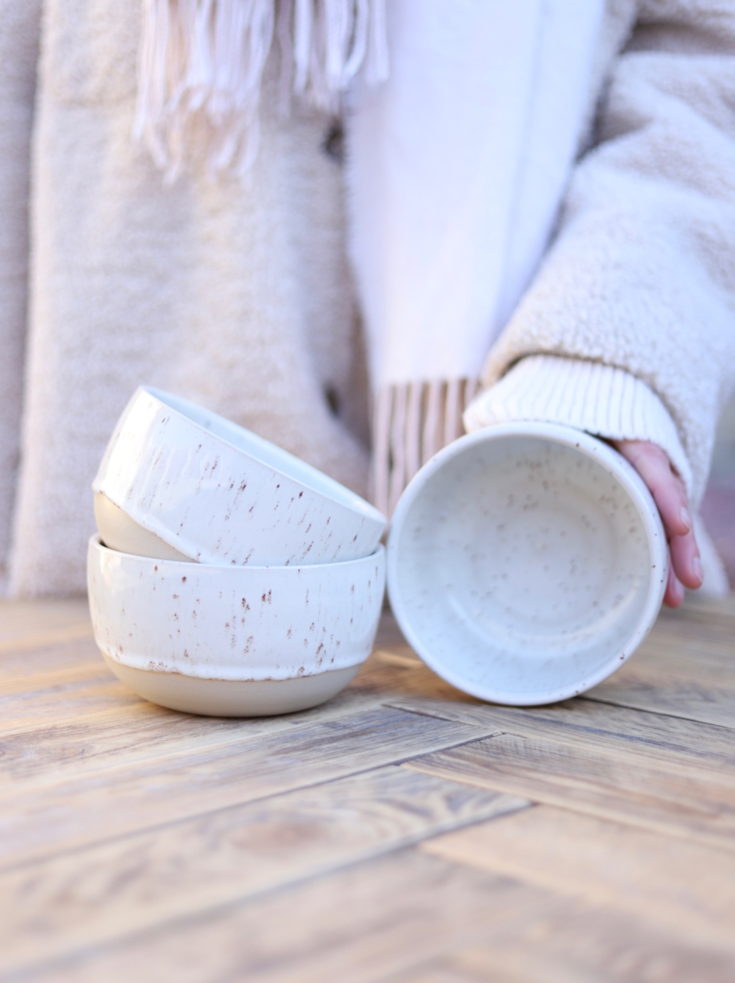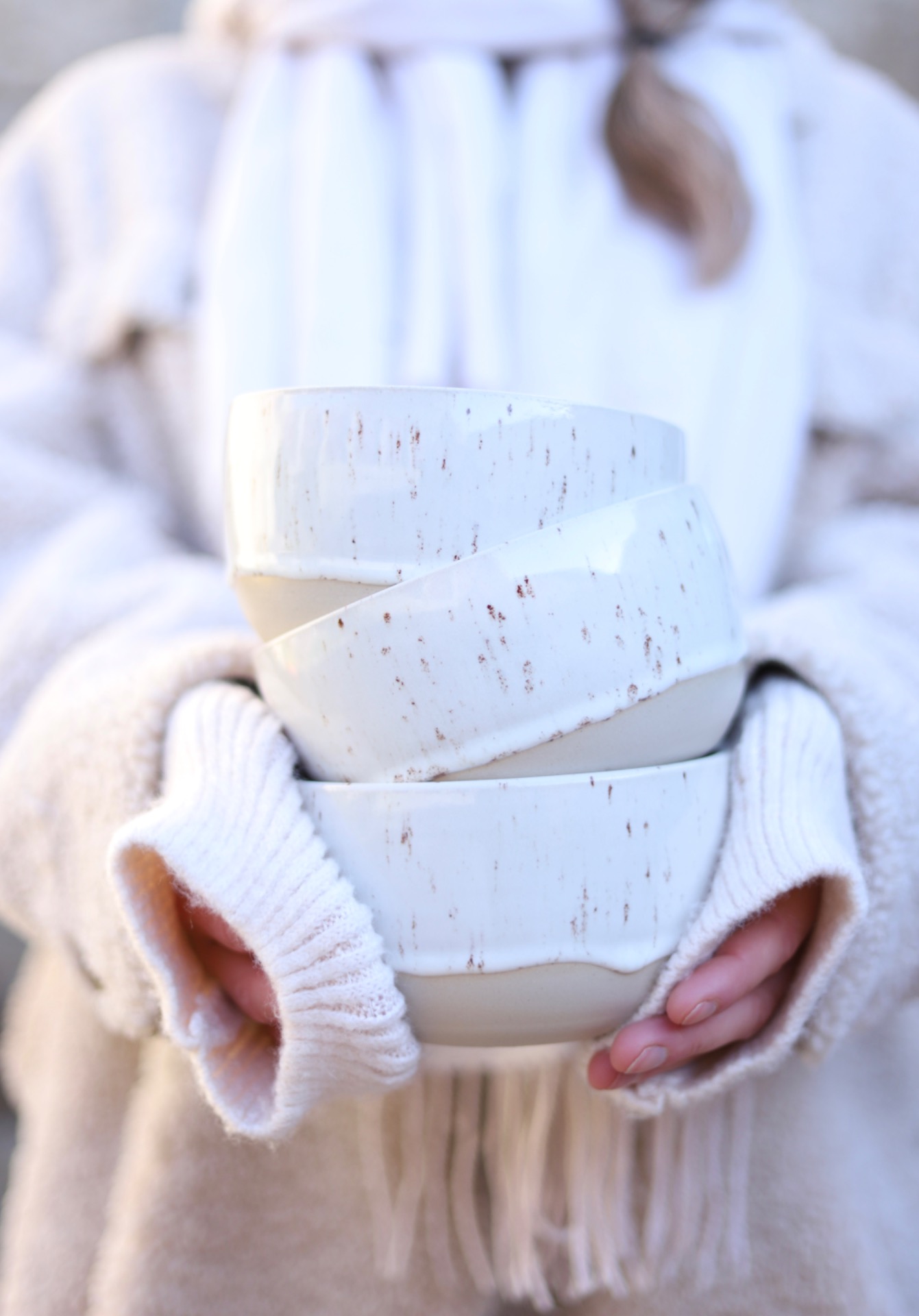 Miska s objemem cca 550ml s krémovou tečkovanou glazurou. Je vytočena z béžové kameniny a vypálena na vysoké teploty.