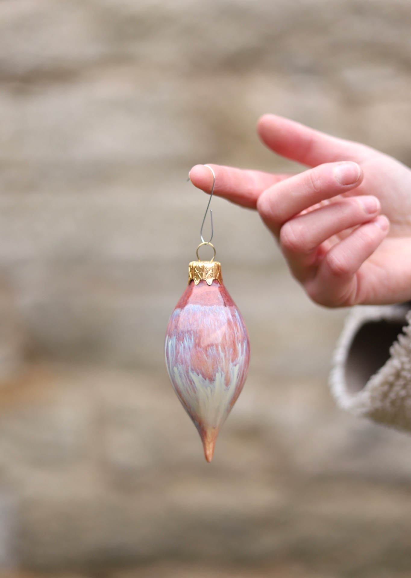 Litá porcelánová vánoční ozdoba ve tvaru špičky s růžovo krémovou glazurou. Délka 10cm, hmotnost 43g.