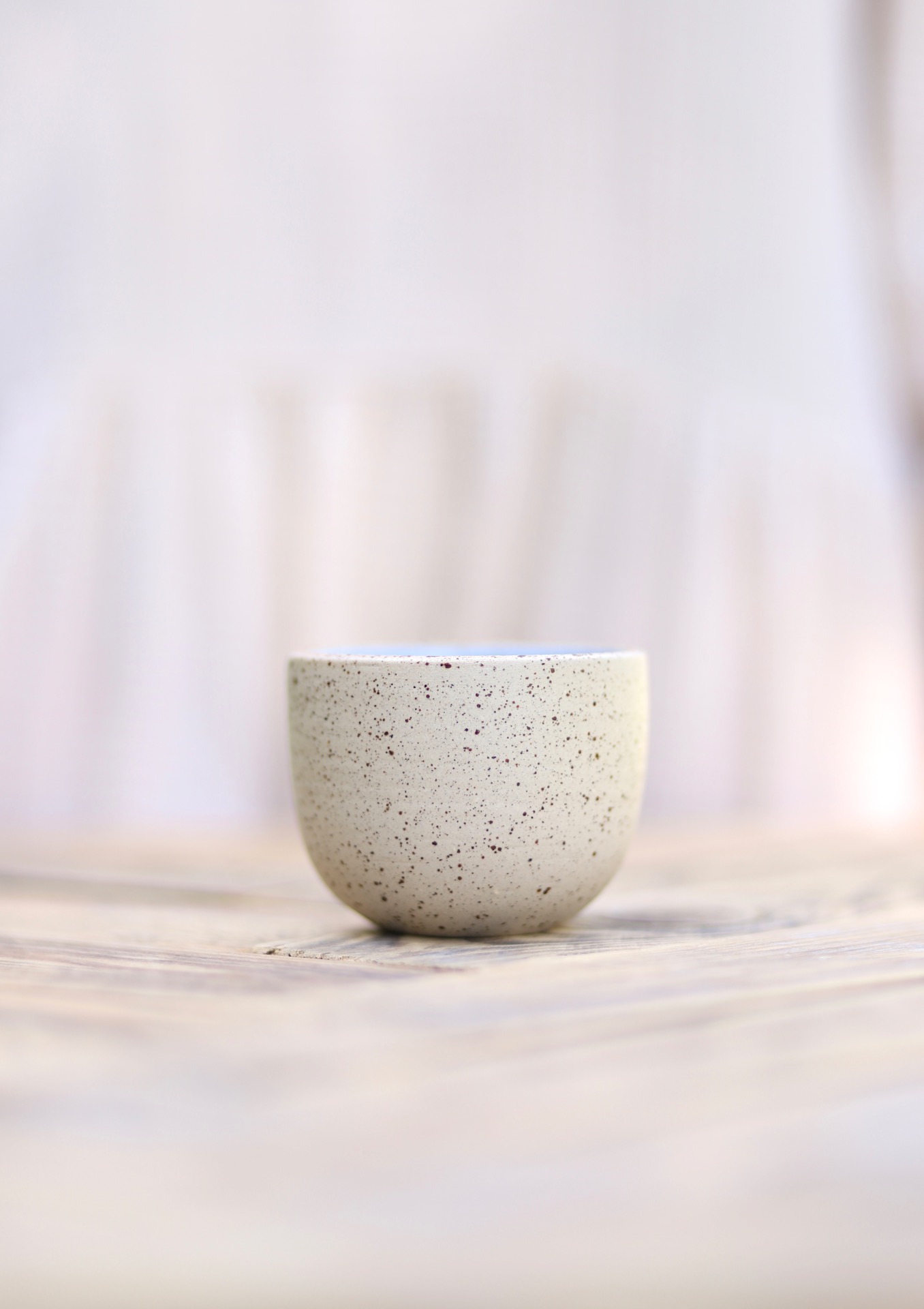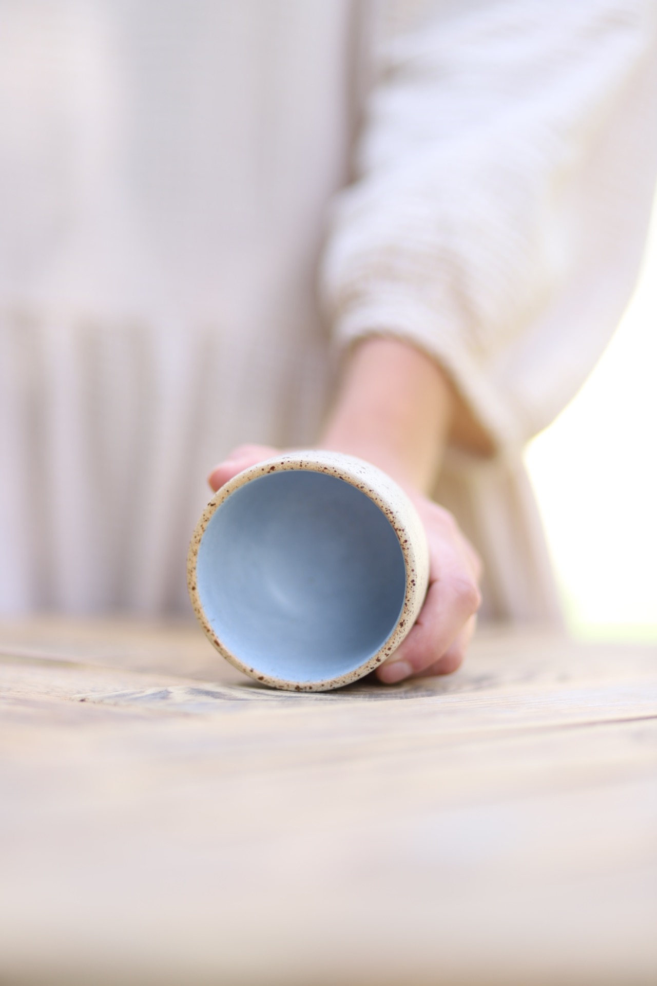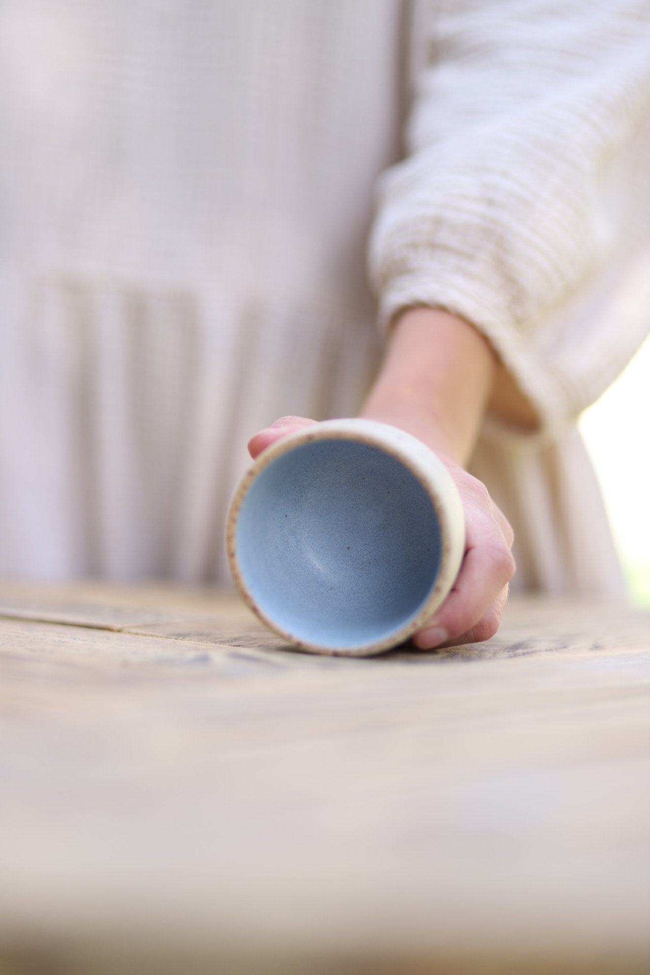 Kalíšek na kafe i čaj s objemem cca 160-180ml s matnou modrou glazurou pouze zevnitř. Kalíšek je vytočen z tečkované kameniny a je vypálen na vysoké teploty.