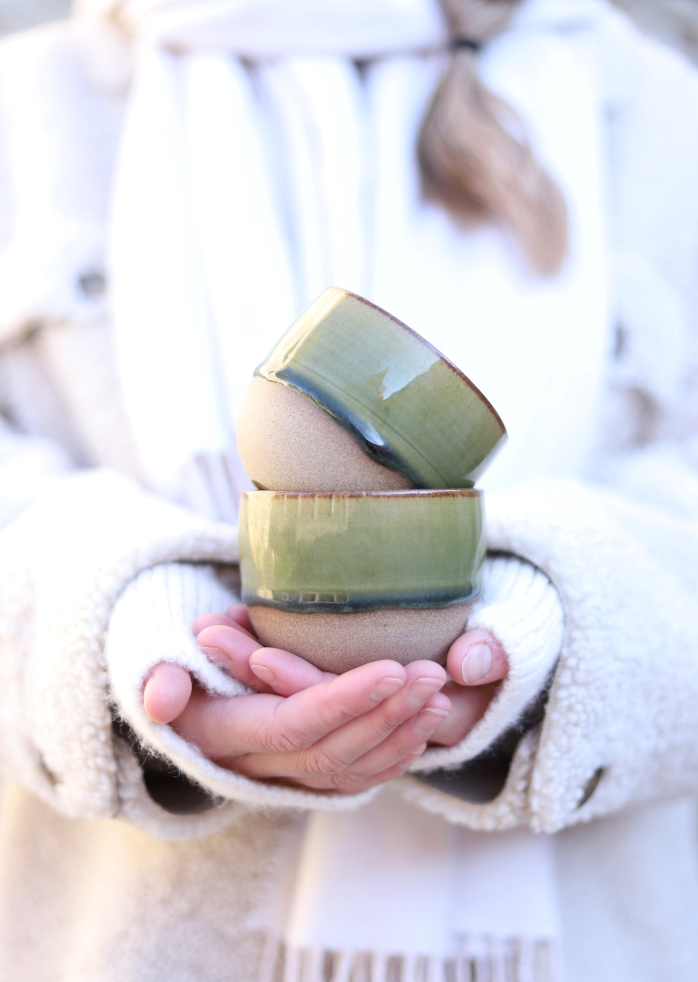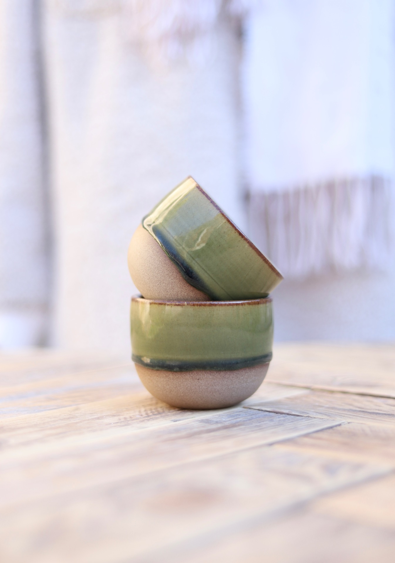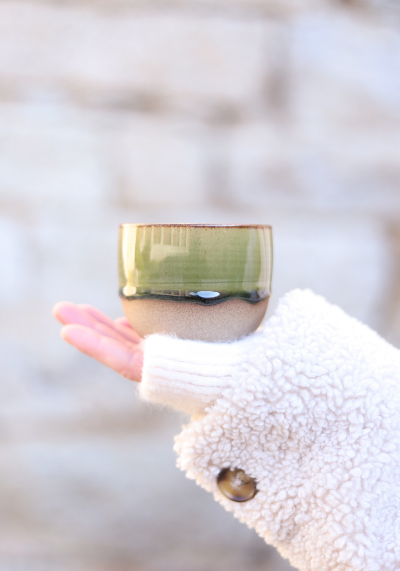 Kalíšek na kafe i čaj s objemem cca 160-180ml se zelenou glazurou. Kalíšek je vytočen z hnědé kameniny a je vypálen na vysoké teploty.